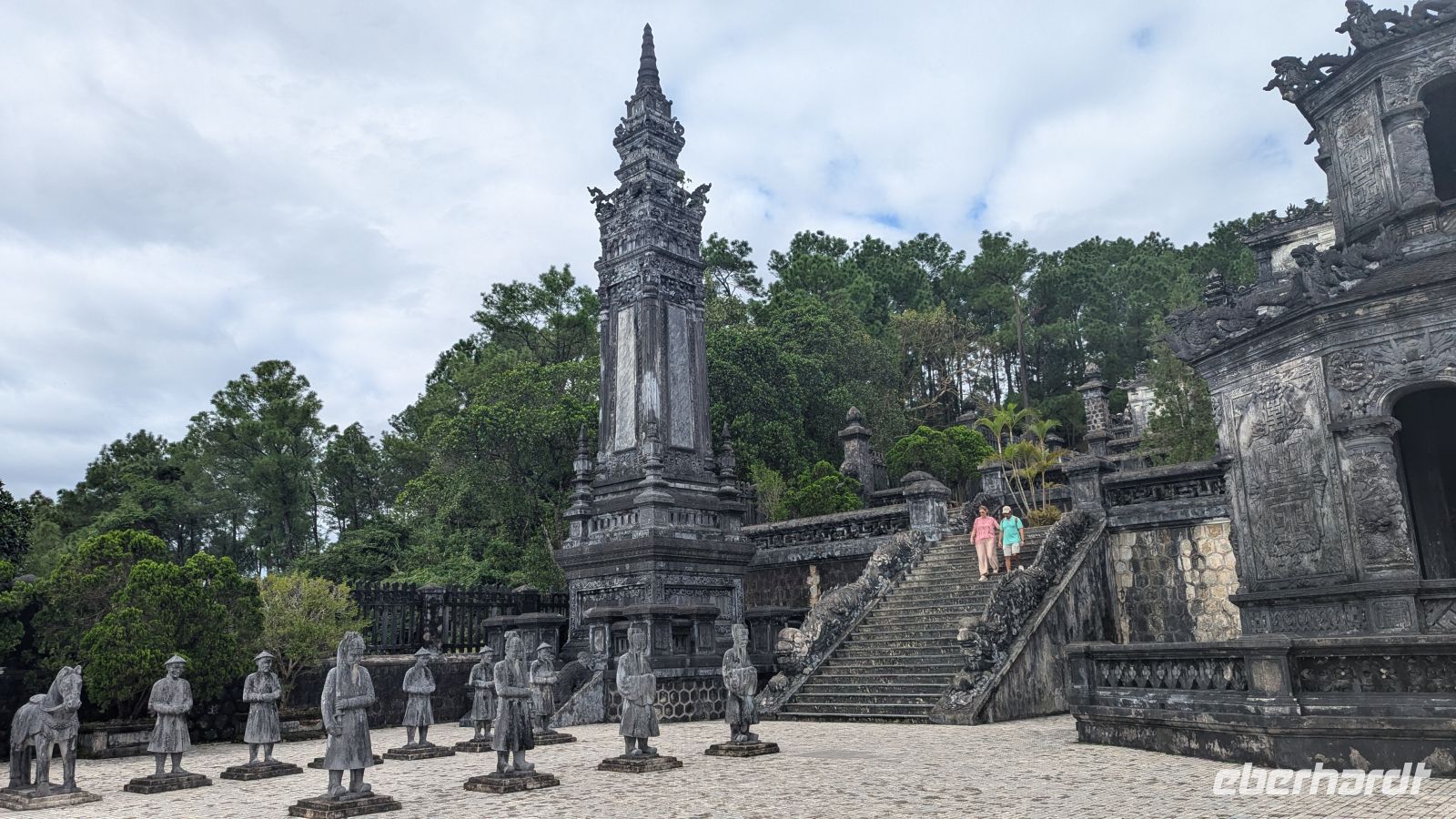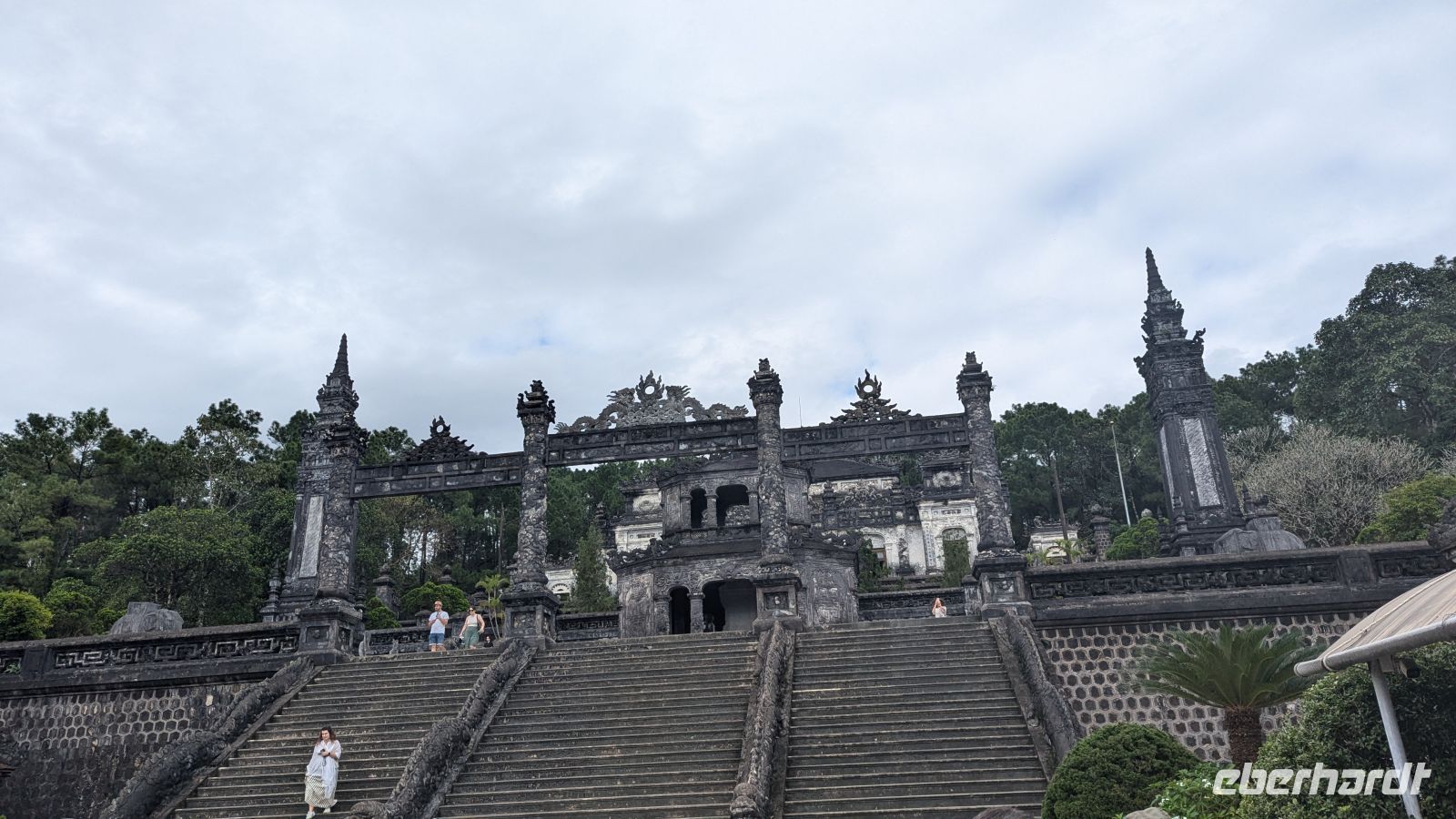 Anschließend besichtigten wir das Grabmal von Kaiser Khai Dinh, das sich durch seinen außergewöhnlichen Baustil von anderen Königsgräbern abhebt. Khai Dinh ließ es Anfang des 20. Jahrhunderts errichten und kombinierte dabei vietnamesische und europäische Architektur. Von außen wirkt das Mausoleum fast düster, doch im Inneren glänzt es mit Mosaiken aus Porzellan und Glas.