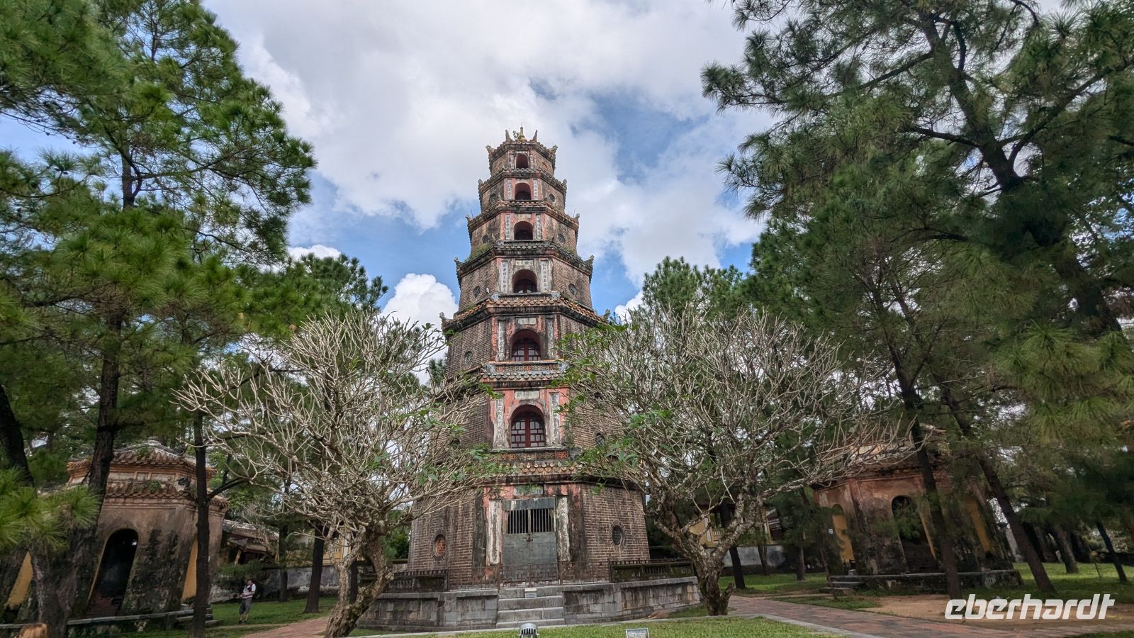 Wir stiegen hier in ein Drachenboot, das uns gemütlich den Fluss hinauf bis zur Thien-Mụ-Pagode brachte. Diese siebenstöckige Pagode ist eines der bekanntesten Wahrzeichen von Hue und gilt als Symbol des Buddhismus in Zentralvietnam.