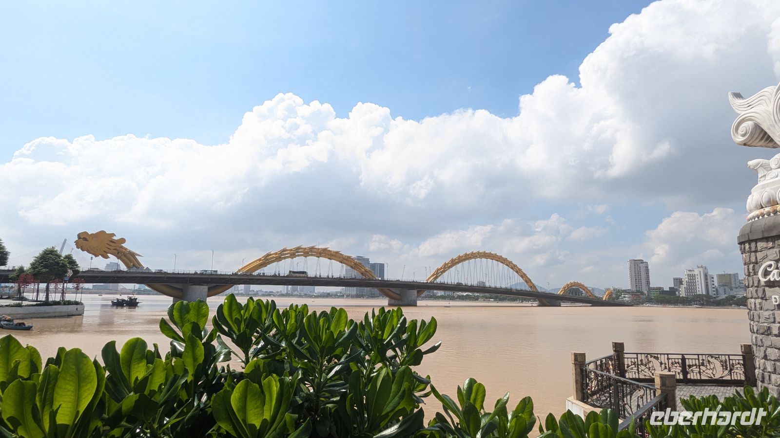 In Da Nang hielten wir anschließend bei der bekannten Drachenbrücke. Sie ist über 660 Meter lang und in Form eines riesigen goldenen Drachen erbaut, ein Symbol für Macht, Stärke und Glück. Besonders eindrucksvoll ist, dass der Drache an Wochenendabenden tatsächlich Feuer und Wasser speit, was die Brücke zu einem echten Highlight der Stadt macht.