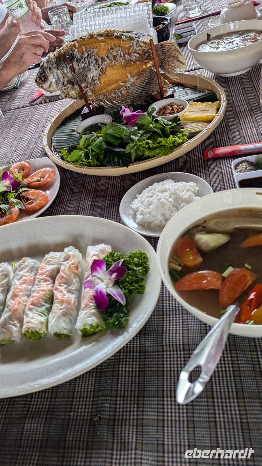 Zum Mittagessen kehrten wir in ein lokales Restaurant ein. Neben uns saß eine große vietnamesische Runde, die alle paar Minuten fröhlich „Mot, hai, ba, yo!“ (1, 2, 3, Prost!) rief, typisch Vietnam und wirklich amüsant! Wir probierten den berühmten Elefantenohrfisch, der wegen seiner knusprigen, aufrecht servierten Zubereitung ein echter Hingucker ist.