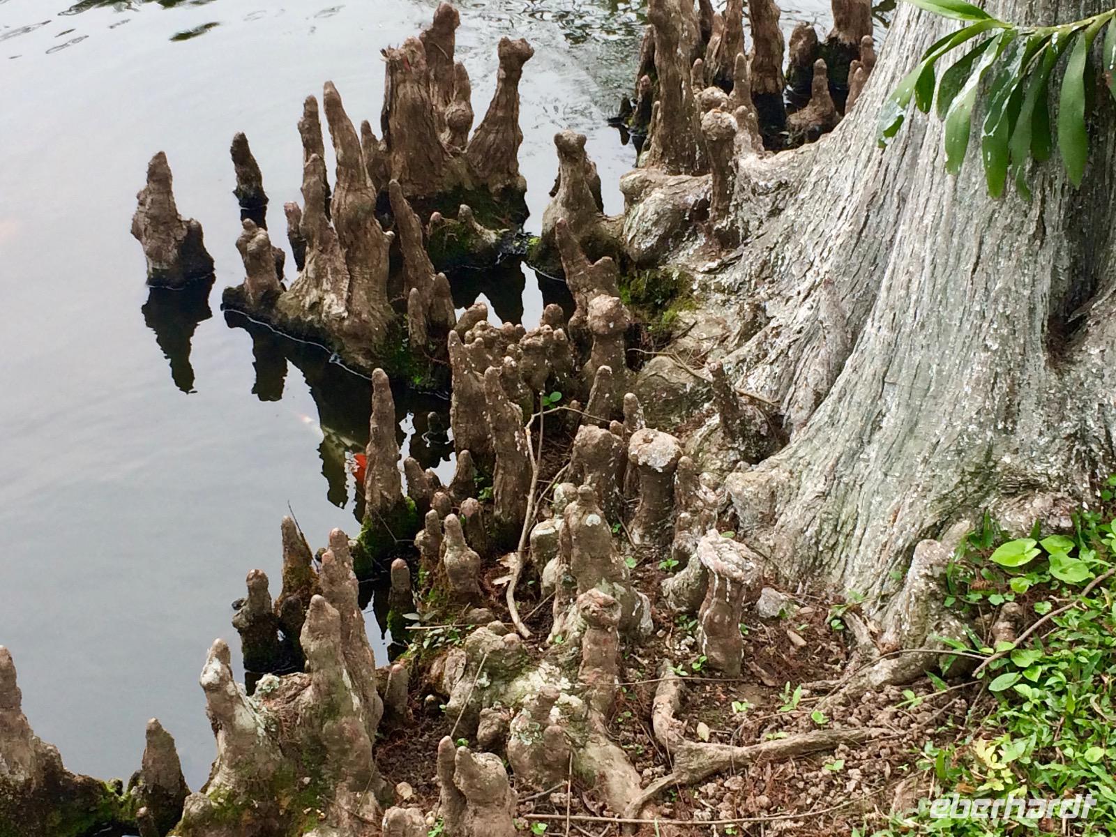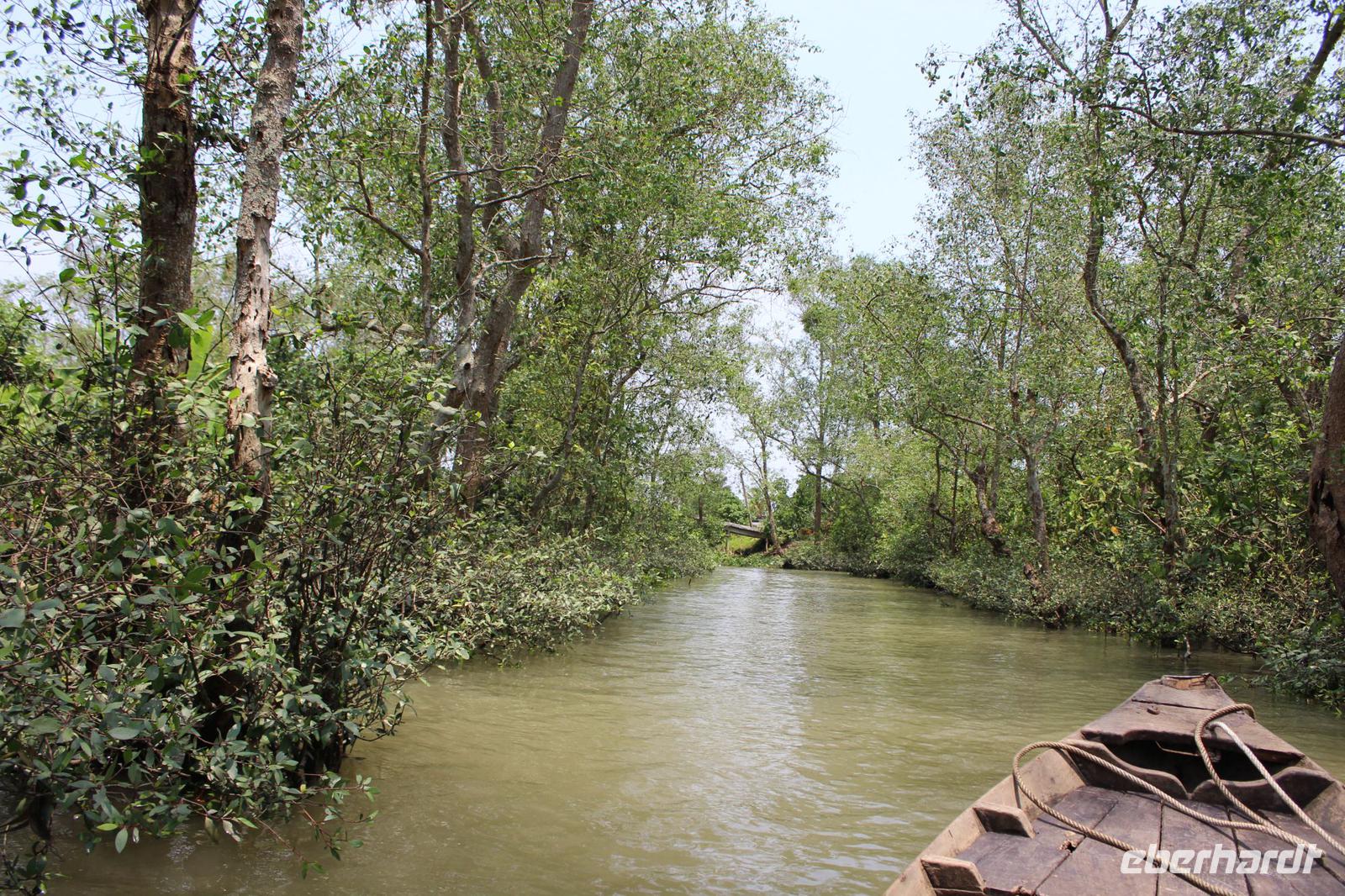 auf dem Mekong. Die Wasserlandschaft wird immer enger, der tropische Wald scheint über uns zuzuwachsen bis wir den Umstieg in die Sampas meistern. Das sind kleine Boote, die von Frauen durch die Fließe gestakt werden, wie im Spreewald, nur komplett anders! Mangroven, Palmen... Unterschiedliche Wasserstände formen aus dem lehmhaltigen Boden bizarre Uferzonen, ausgespülte Wurzeln. Vom Himalaya kommt er, der Mekong und hier breitet er sich als Deltalandschaft ins Meer aus. Wir legen wieder an, die Frauen leisten nicht nur Kraftarbeit, sondern außerordentliches Geschick im Steuern, vor allem in den engen Stellen beim Begegnen. Vorbei am schwimmenden Markt verhandelt Anh um Kokosnüsse für die Gruppe.