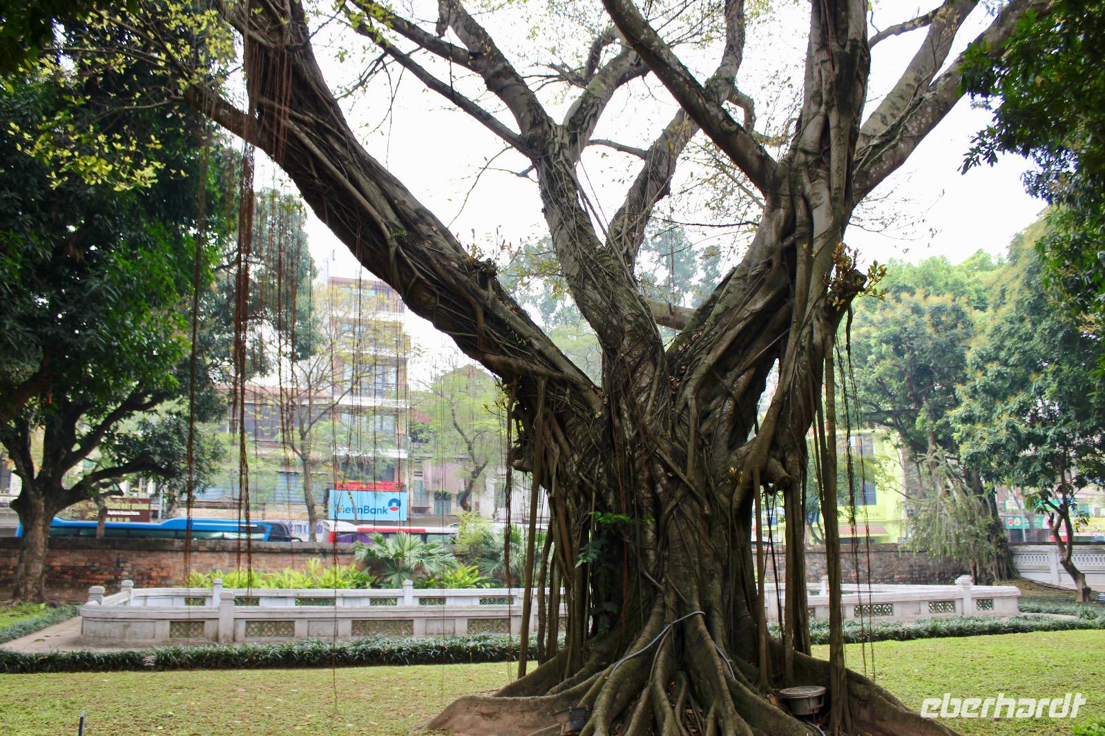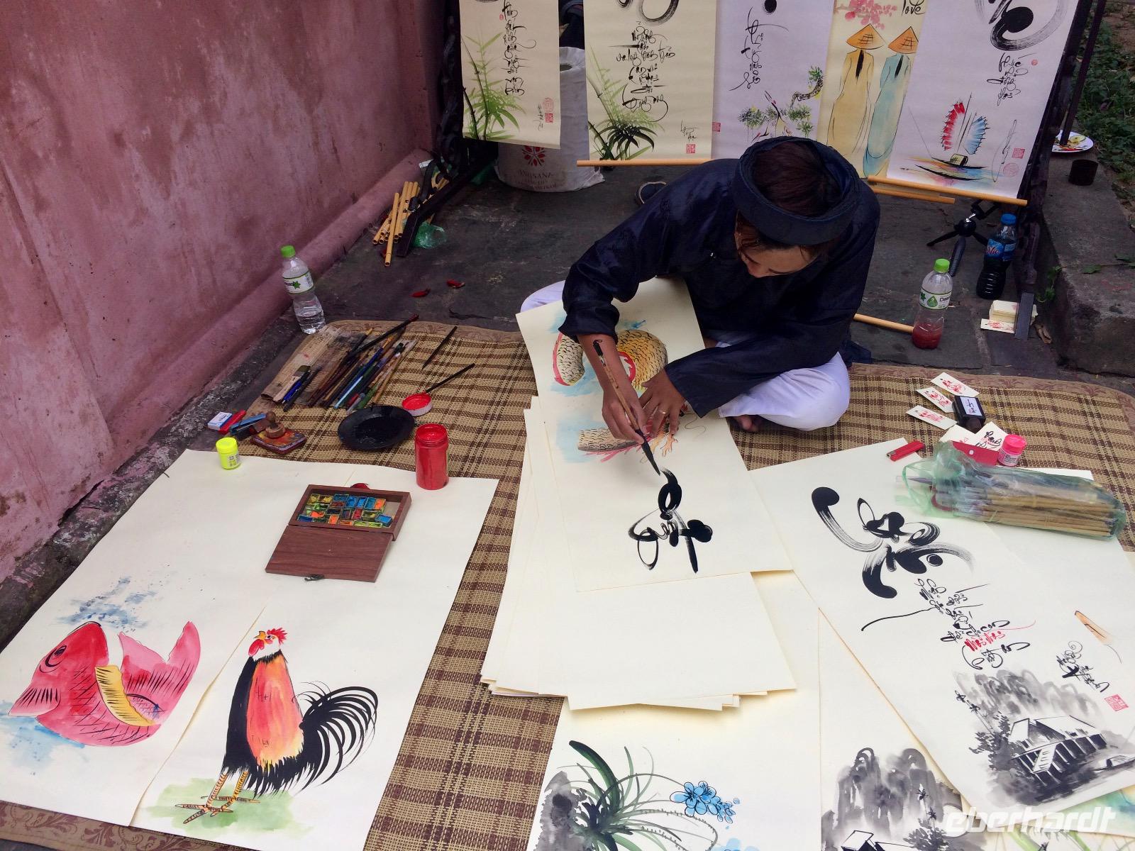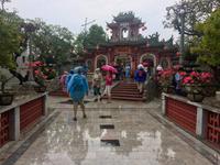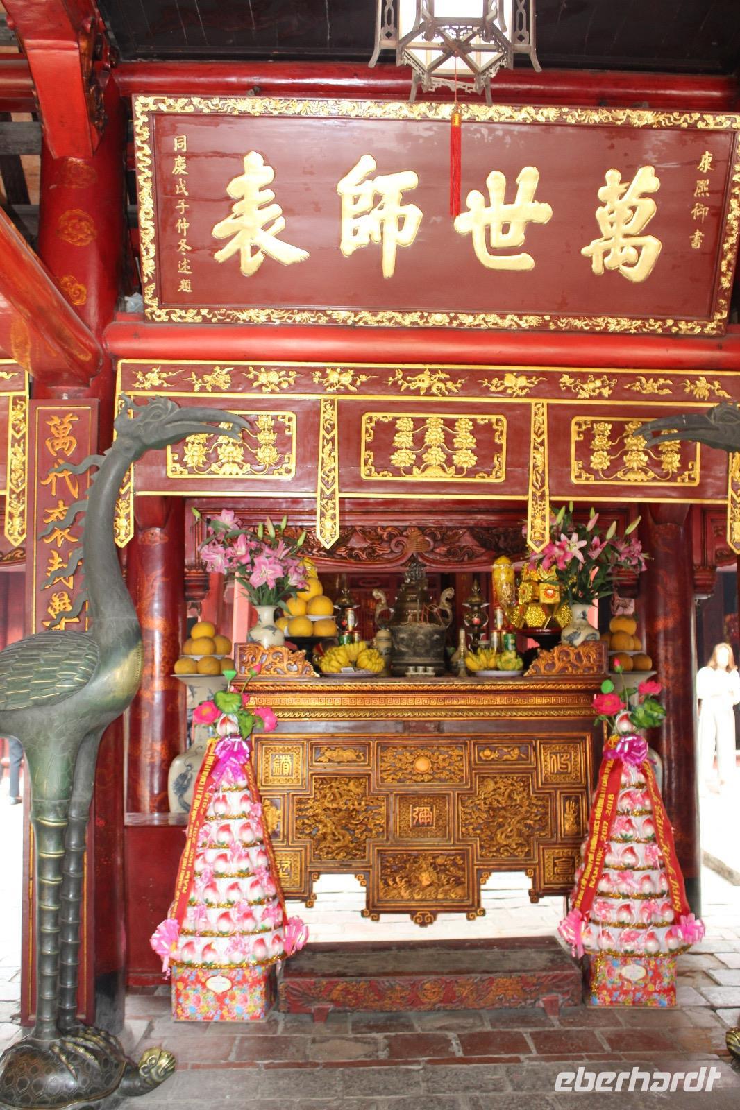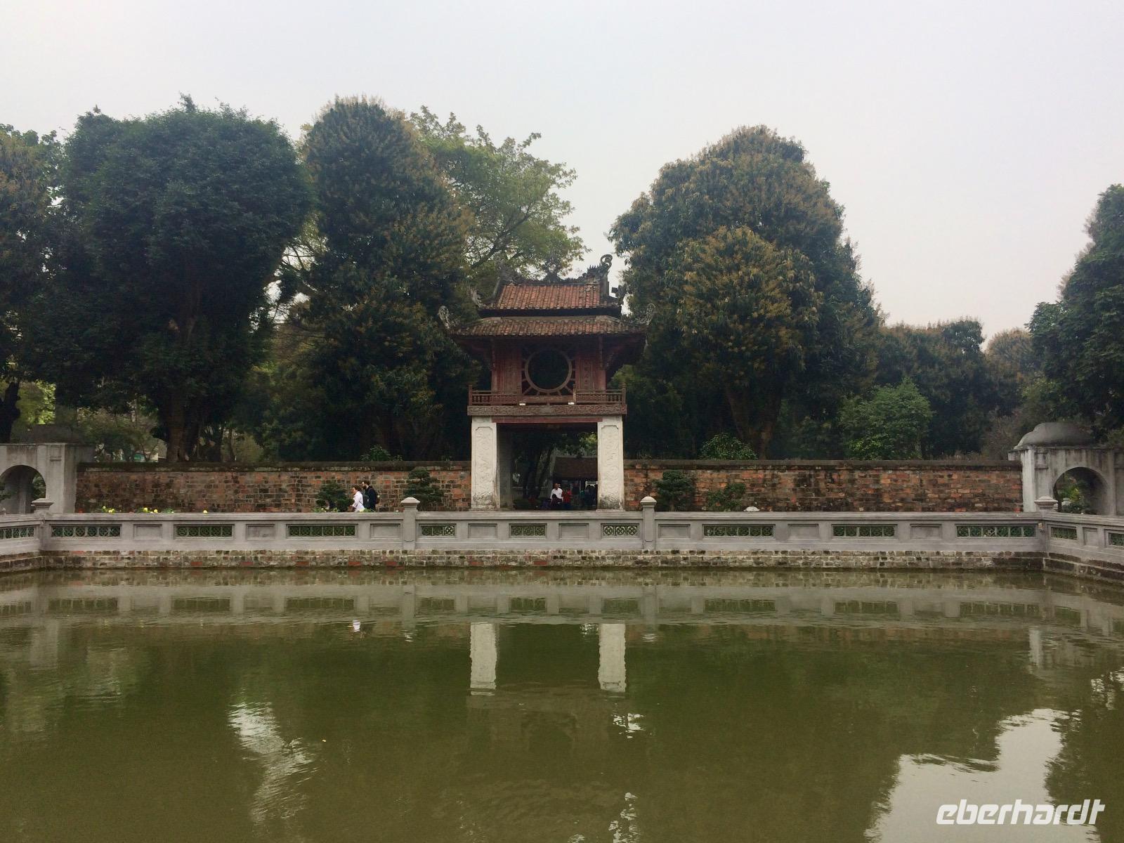 Von der Pagode geht es hinüber zum Tempel der Literatur, welcher zu Ehren von Konfuzius errichtet wurde. Dieses konfuzianische Hauptheiligtum war die erste Universität von Vietnam. Vor fast 1000 Jahren (1070) ließ Kaiser Ly Thanh Tong diese Van Mieu-Pagode erbauen. In der Ly-Dynastie begann die konfuzianische Glaubenslehre den Buddhismus zu verdrängen und Van Mieu entwickelte sich zum intellektuellen und spirituellen Zentrum des Königreiches. Wir finden 82 verbliebene Steinstehlen, getragen auf den Panzern von steinernen Riesenschildkröten. Schildkröten symbolisieren ein langes Leben. Auf den Steintafeln sind die Examina, die Namen der 1036 erfolgreichen Absolventen sowie deren Lebenslauf eingemeißelt. Es ist nicht verwunderlich, dass dieser Platz ein würdiger Ort ist, den man zu besonderen Anlässen aufsucht. Und so werden wir Zeugen eines farbenfrohen Ereignisses: Absolventen feiern ihren Abschlusses ihrer Ausbildung, in der festlichen Kleidung, die Mädchen im „Áo dài" (langes Oberteil). Gegenseitiges fotografisches Festhalten ist im Gange.