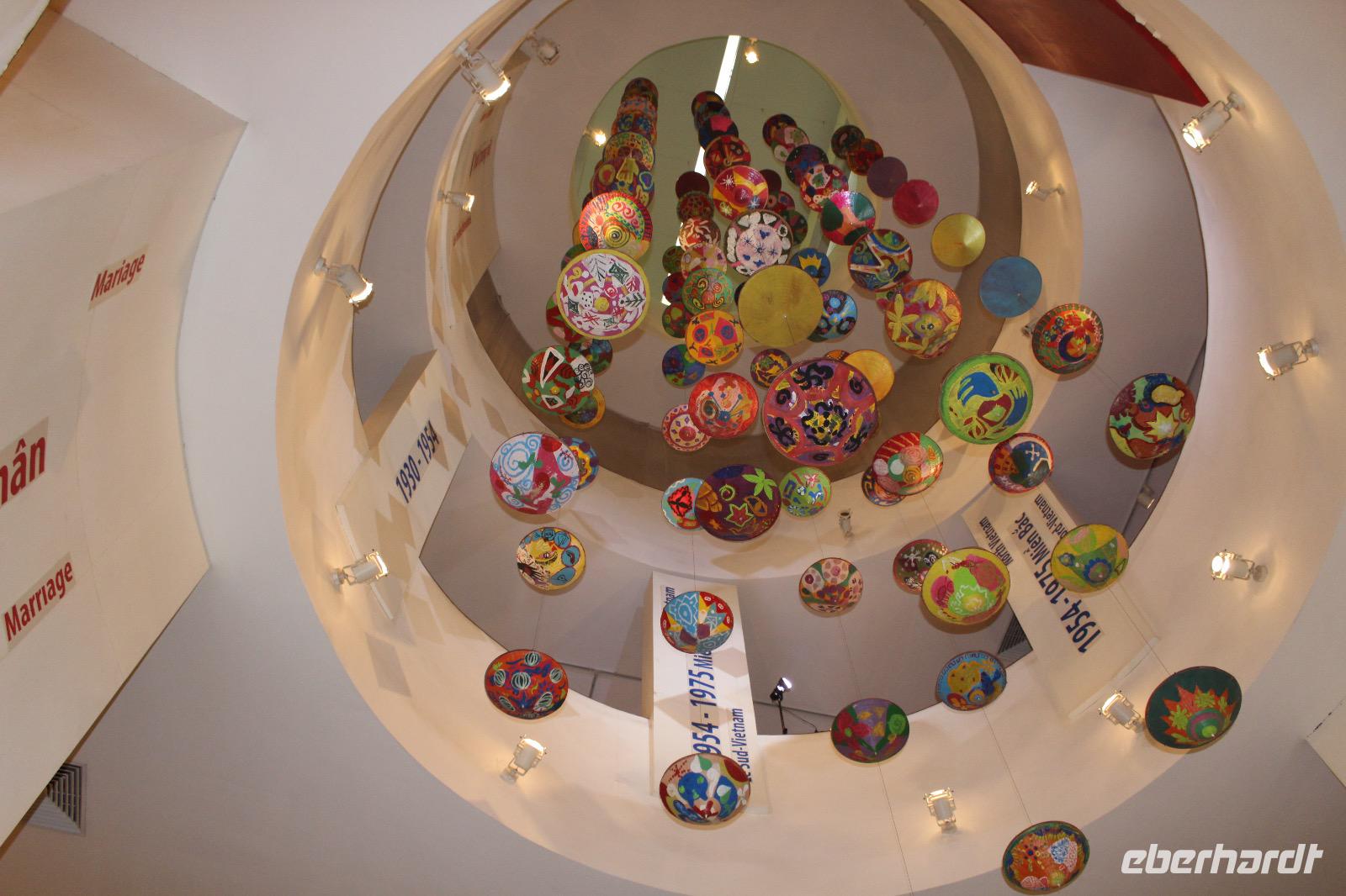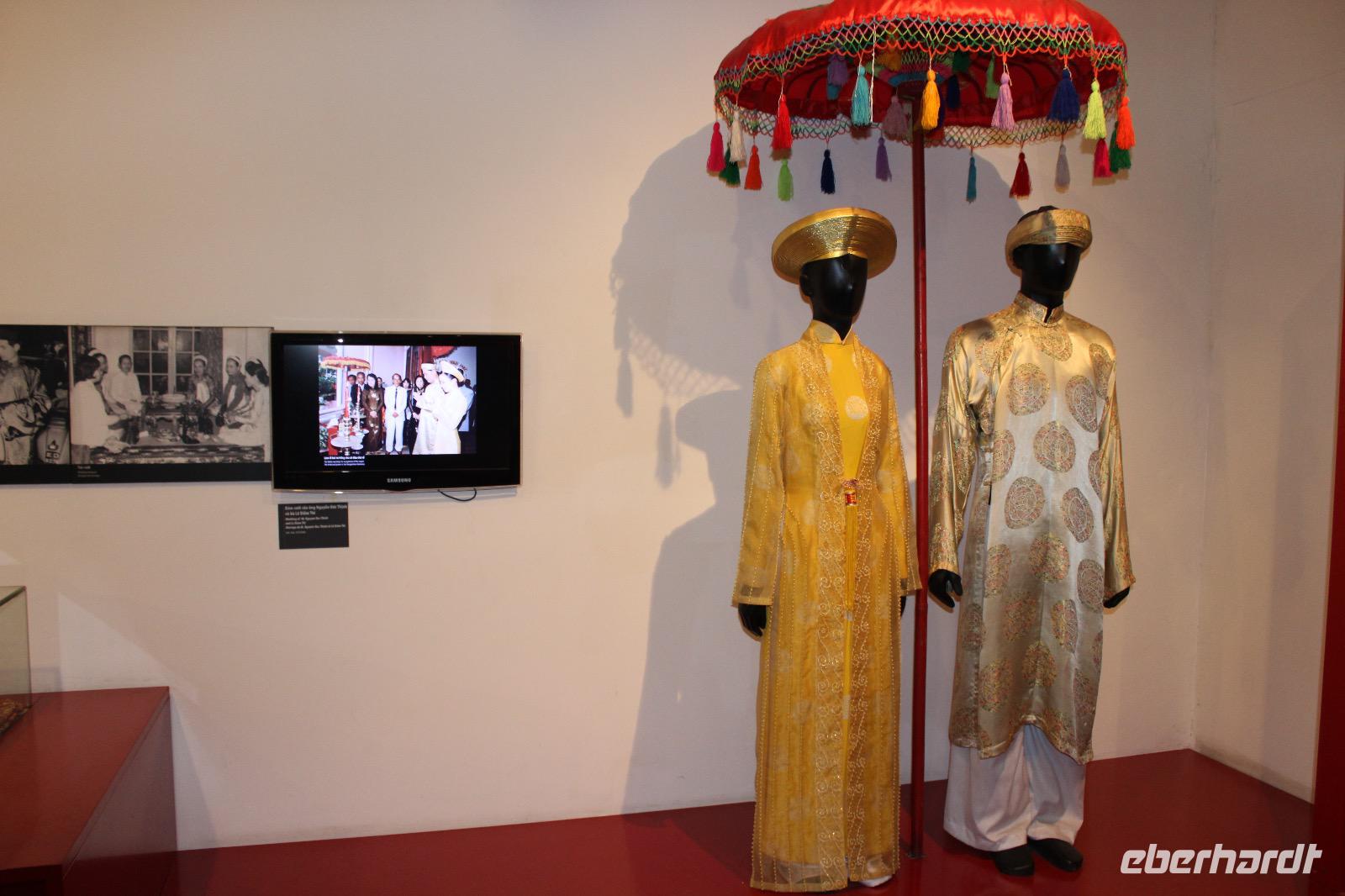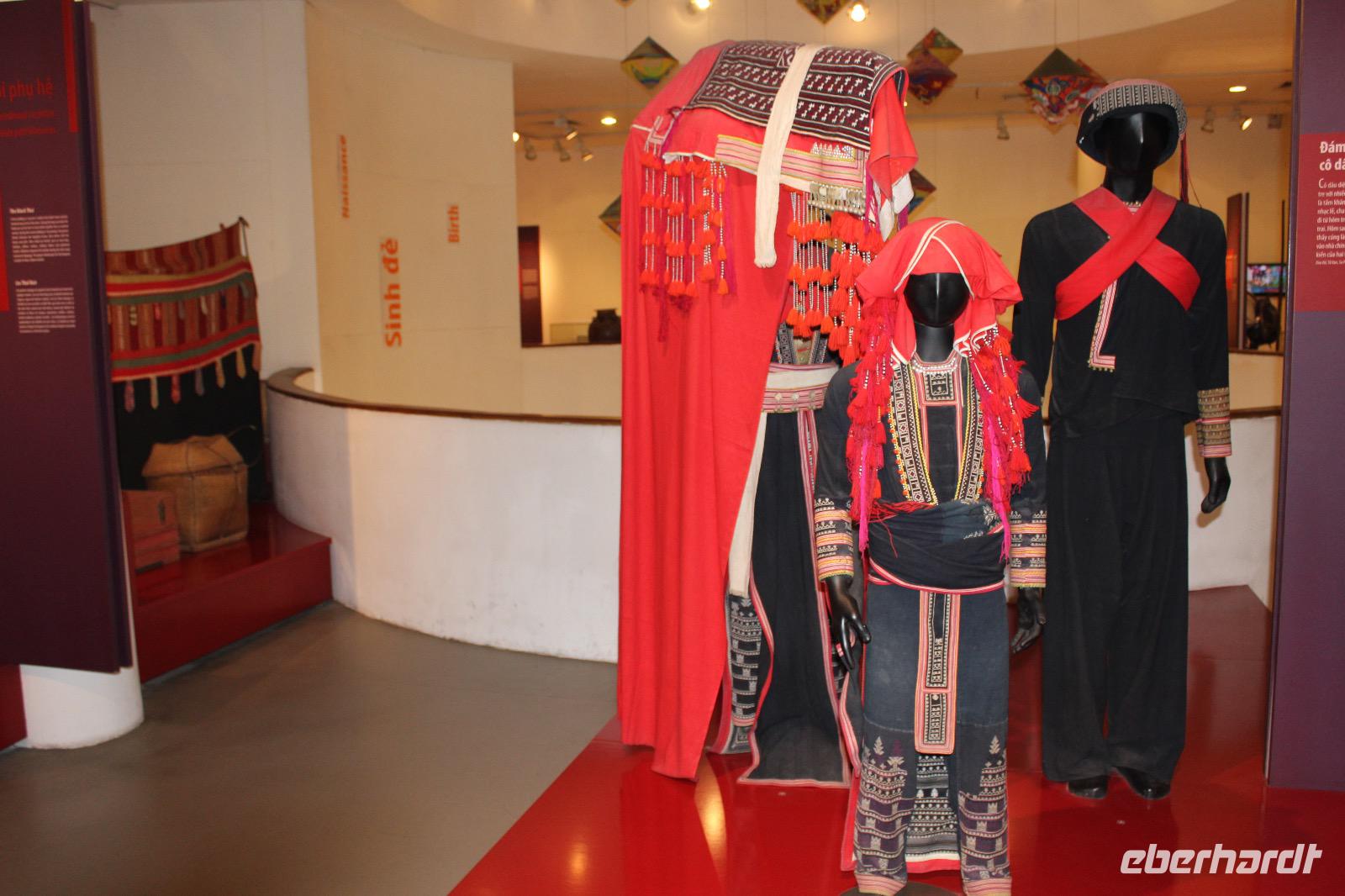 Nach der Erholungspause führt uns Si Anh durch das Frauenmuseum. Mit Staunen und Respekt lernen wir die Rolle der vietnamesischen Frau in der Familie, in der Gesellschaft sowie zu Kriegszeiten kennen. Auch die unterschiedlichen Erwartungen bei den 54 Ethnien werden anschaulich dargestellt. Viele Mädchen heiraten schon mit jungen Jahren von 14 und müssen zur Hochzeit eigenhändig ihre Brautkleider oder Zelte für die Hochzeitsnacht nähen. Haben Sie von der nächsten Tradition gehört? Unverheiratete Mädchen die Haare meist offen tragen. Die Schwiegertochter erhält von der Schwiegermutter zur Hochzeit als Geschenk und Ehrung der Schwiegermutter eine Strähne (meist eine graue Haarsträhne), die sie jeden Tag beim Zusammenbinden ihrer Haare dran klemmt. Was es nicht alles gibt.