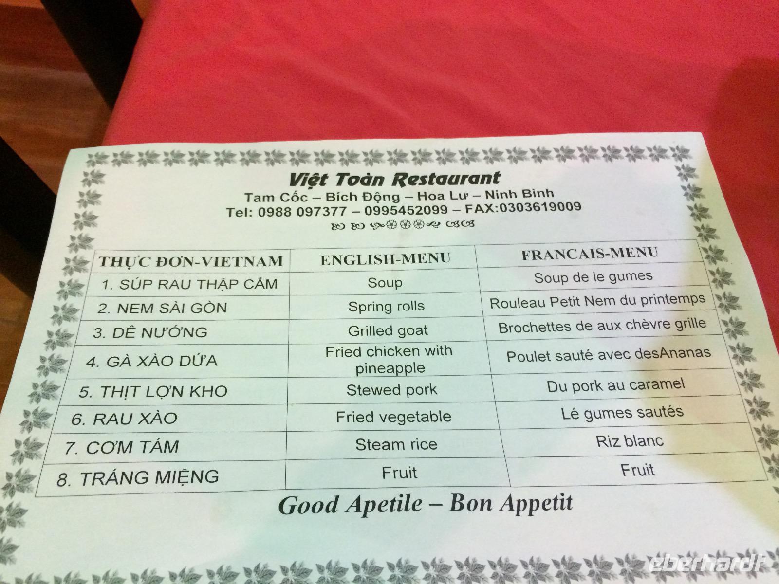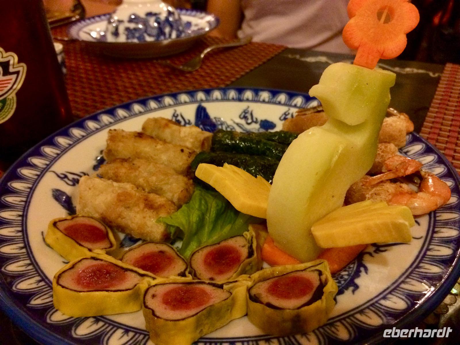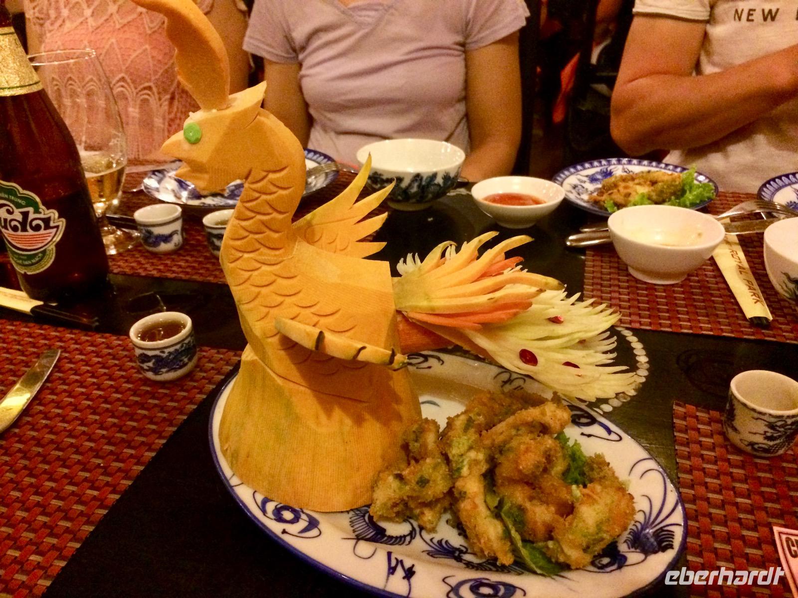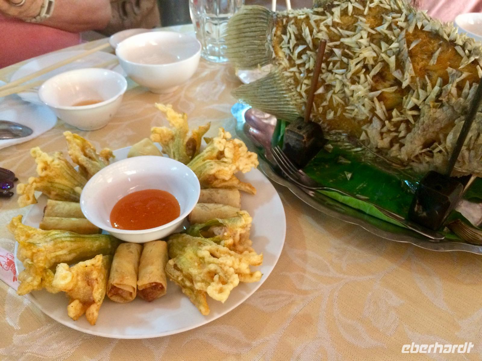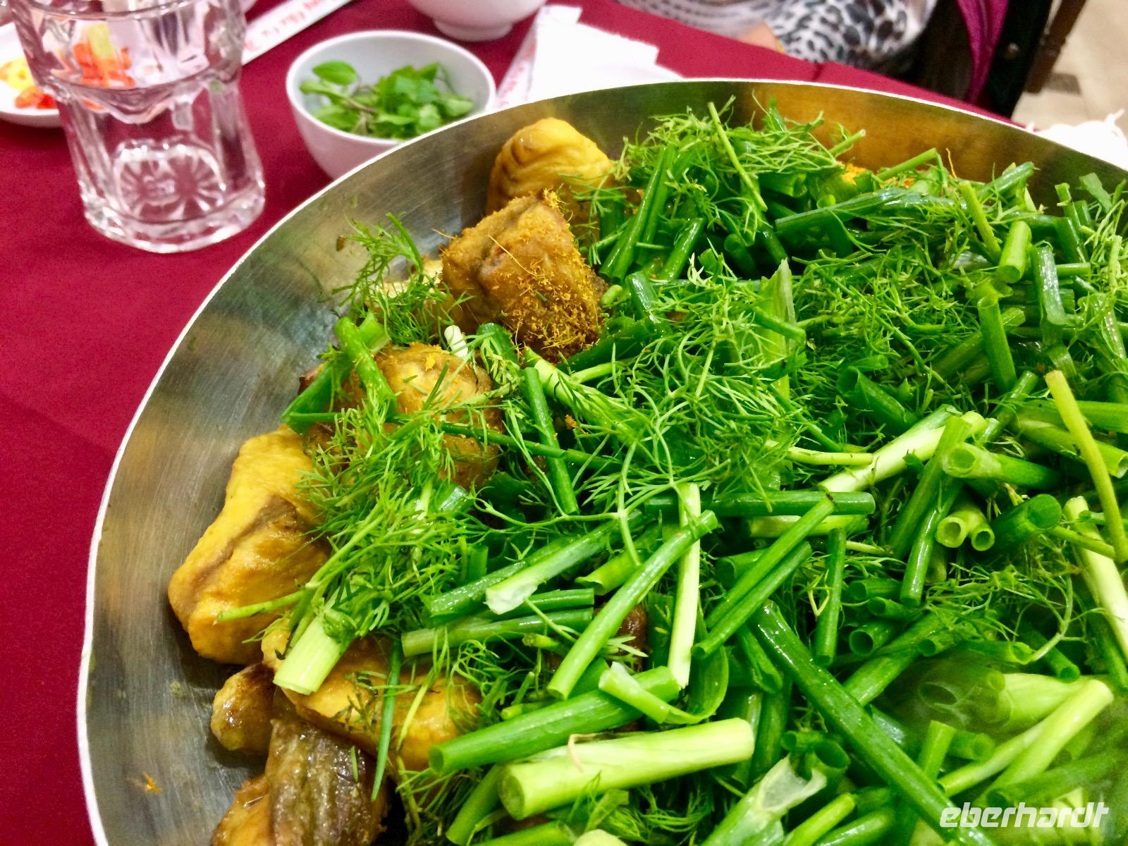Im Gebiet der trockenen Halong-Bucht gilt Bergziege als kulinarische Spezialität. Wir probieren es auf asiatischer Art mit Händen, Reispapier und grünen Bananen sowie Sesamsoße - nicht schlecht! :D