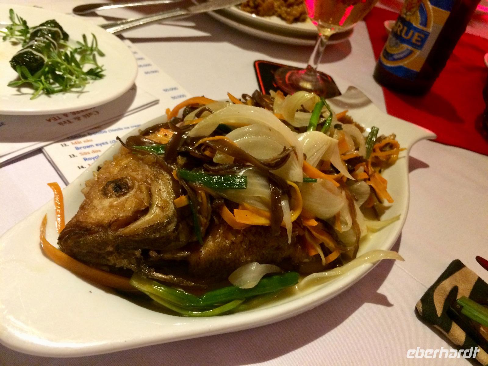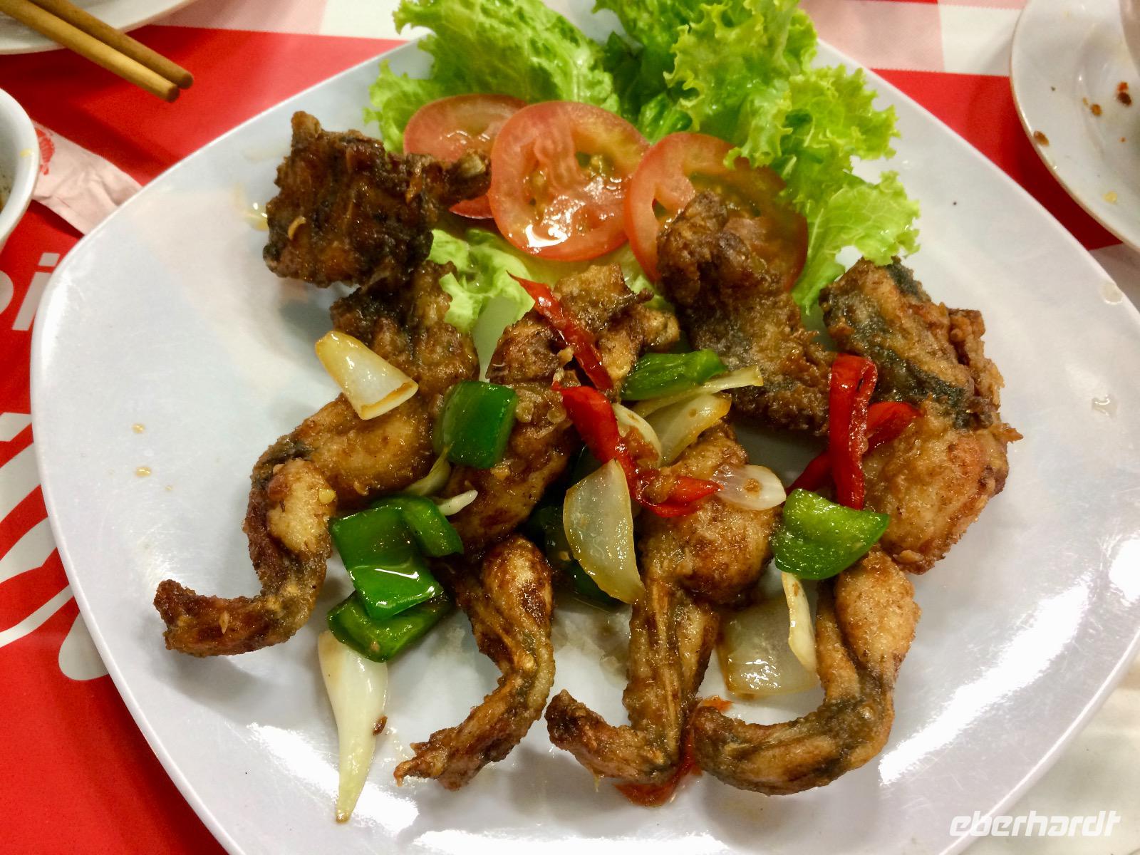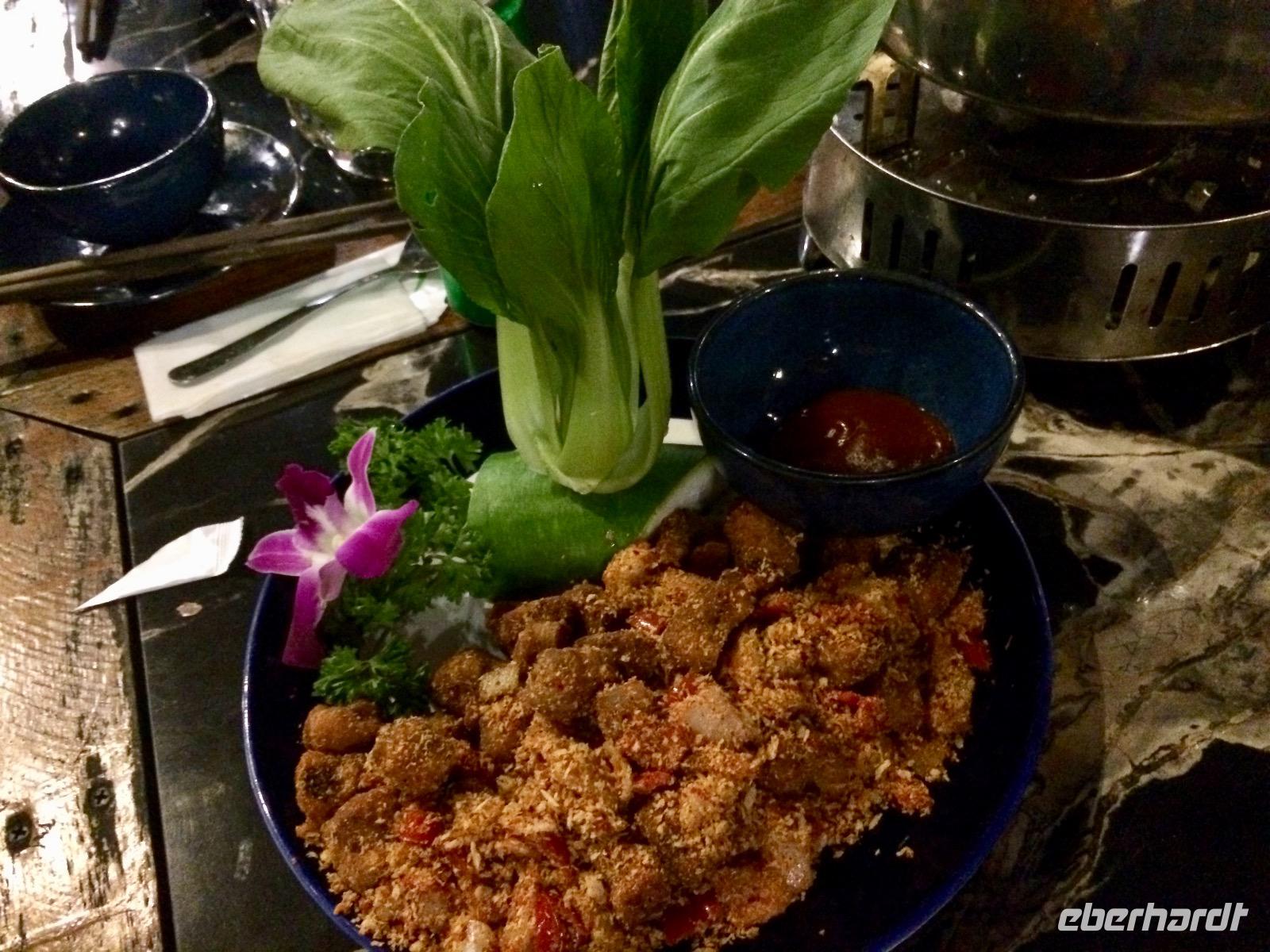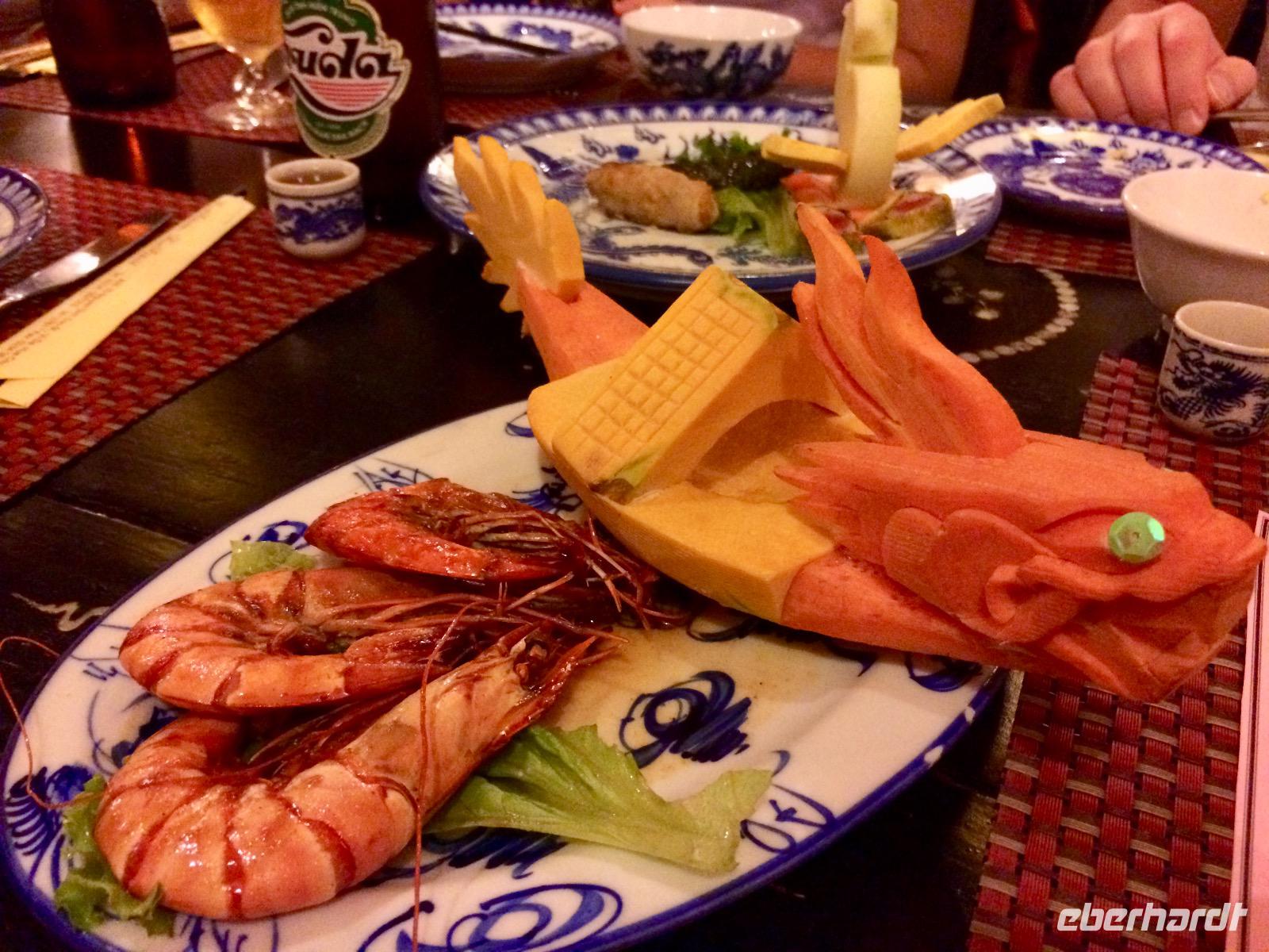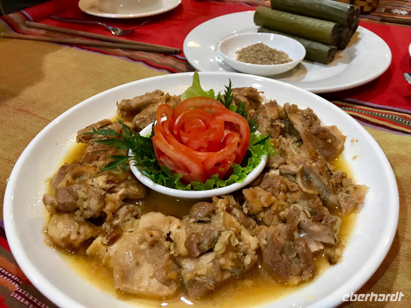 Im Gebiet der trockenen Halong-Bucht gilt Bergziege als kulinarische Spezialität. Wir probieren es auf asiatischer Art mit Händen, Reispapier und grünen Bananen sowie Sesamsoße - nicht schlecht! :D