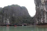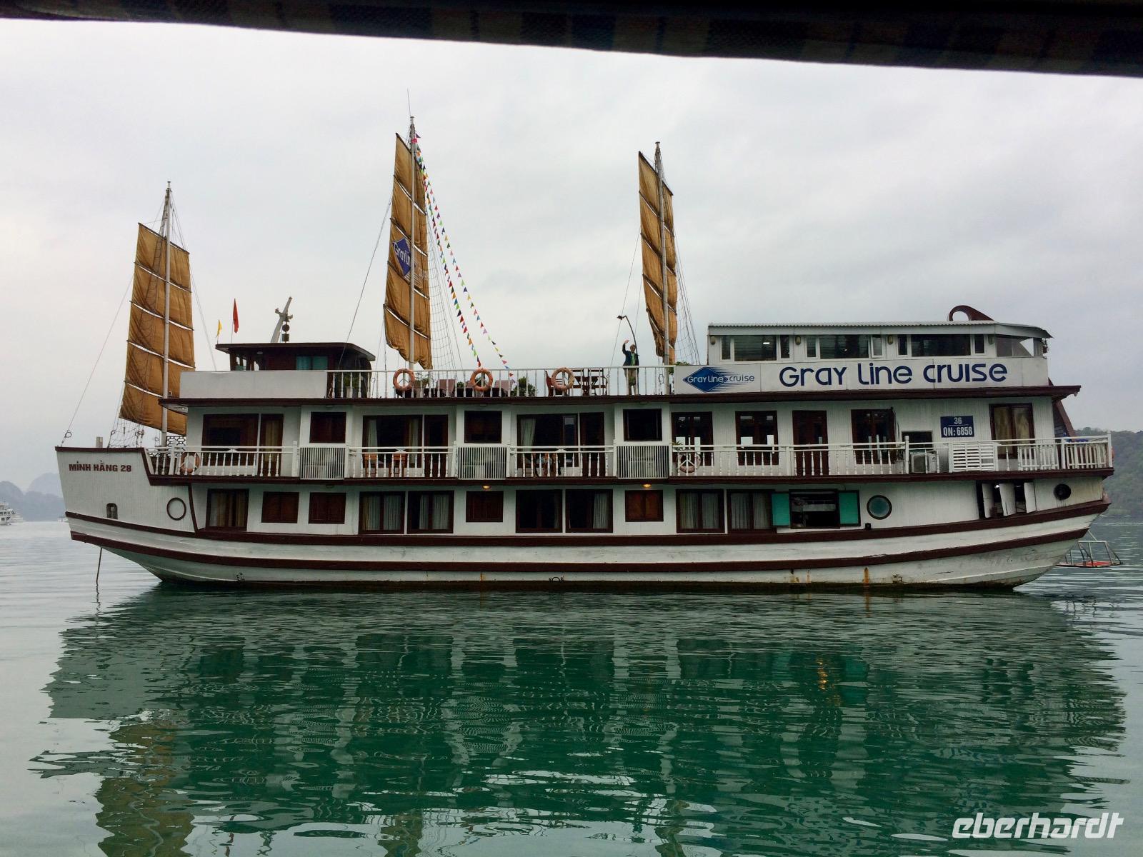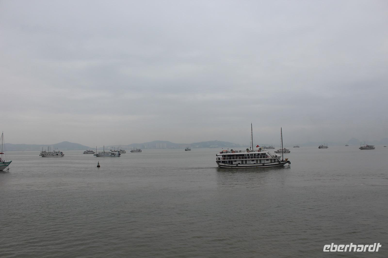 Nach und nach verlassen wir die bewohnten Städte und sehen die ersten deutlichen Karstberge links und rechts. Wir sind schon sehr gespannt, diese aus der Nähe zu sehen. Gegen Mittag erreichen wir den Hafen von Tuan Chau und gehen an Bord unserer Dschunke. Oh, unsere Kreuzfahrt auf der atemberaubenden Landschaft kann beginnen! Schon bei einem leckeren Mittagsessen mit Fisch und Meeresfrüchten sind wir alle beeindruckt von der malerischen Wasserlandschaft, zahlreiche Karstfelsen mit unterschiedlichen Formen wie Riesen, Papagei und Schildkröten ragen aus dem Wasser hervor. In der Gegend der Halong-Bucht gab es anfangs nur drei Metallschiffe vom Staat. Inzwischen fahren bereits ca. 400 Schiffe, fast alle werden privat finanziert. Von 1965 bis 1973 Kriegsschauplatz, ist sie heute Touristenmagnet Nummer Eins und gehört seit 2011 zu einem der neuen Sieben Naturweltwunder.