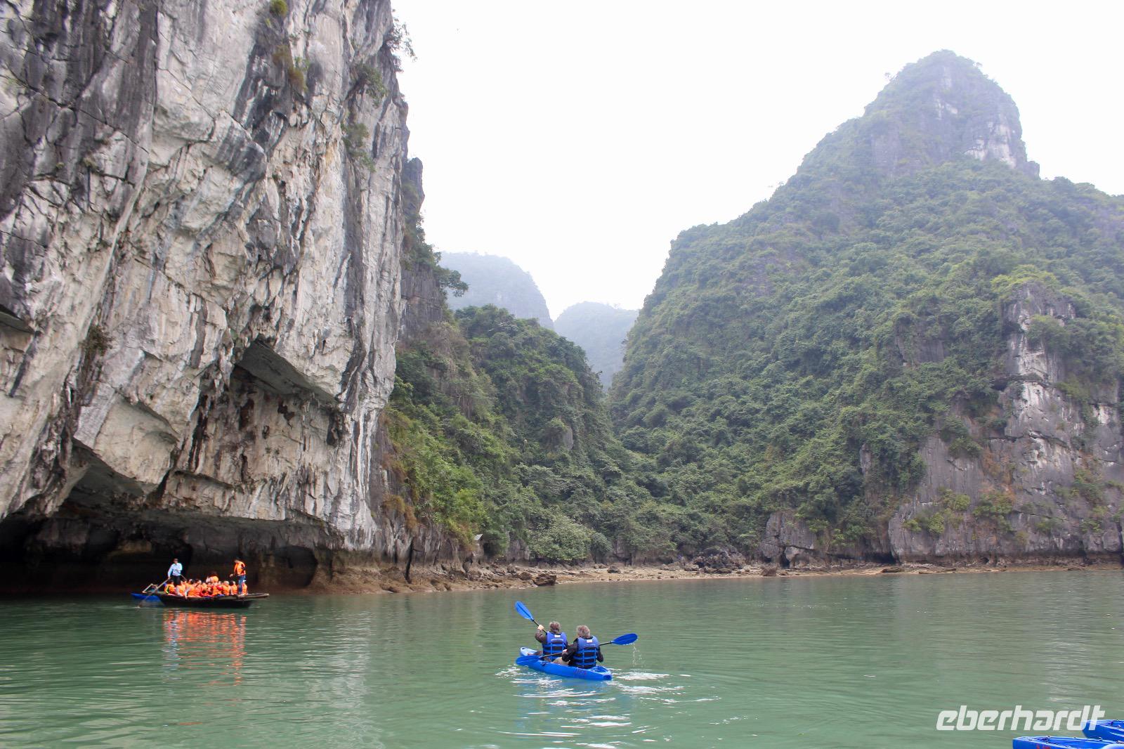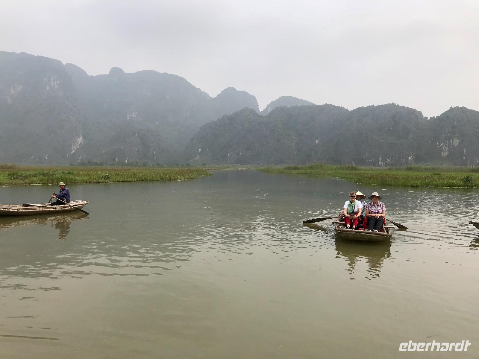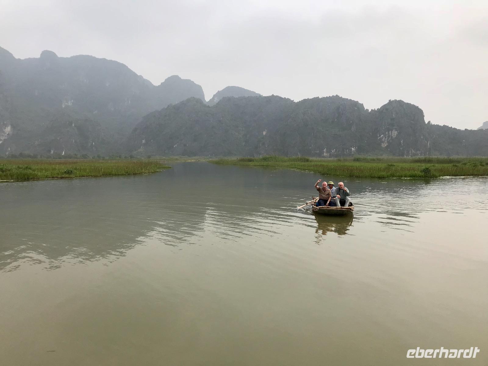 Am Nachmittag bietet sich die Möglichkeit, eine Lagune per Kajak zu erkunden oder sich mit einem Bambusboot staken zu lassen. Die mutigen Sportler unter uns werden belohnt mit einem schönen Erlebnis, sofern Sie es einigermaßen trocken überstanden haben. Die Genießer unter uns mussten sich erst gegen die Invasion der orangenen Vesten verteidigen. Aber unsere Gruppe bleibt standhaft und hartnäckig, wir lassen uns nicht nicht einmal mit vietnamesischem Gebrüll aus dem Boot verjagen... hi, hi! So dürfen wir schließlich die wohltuende Ruhe in der Lagune genießen.