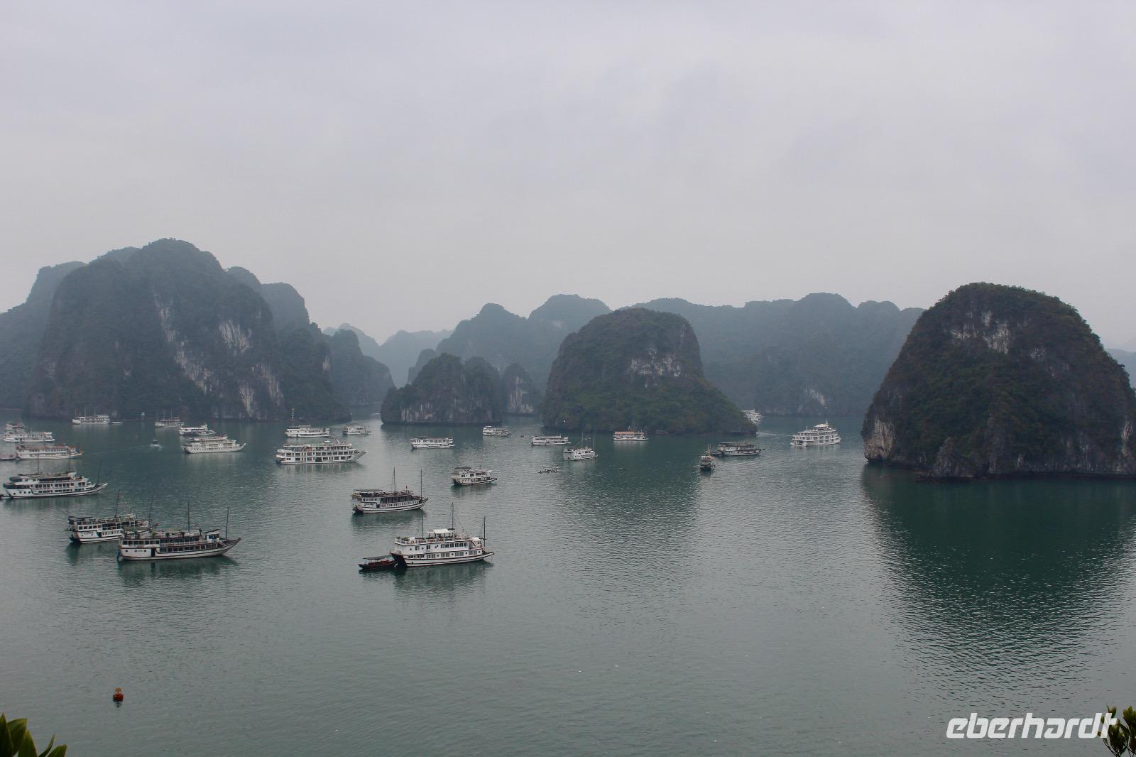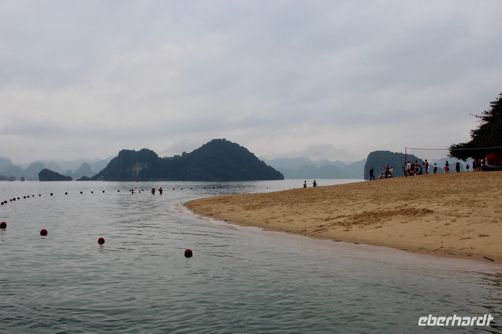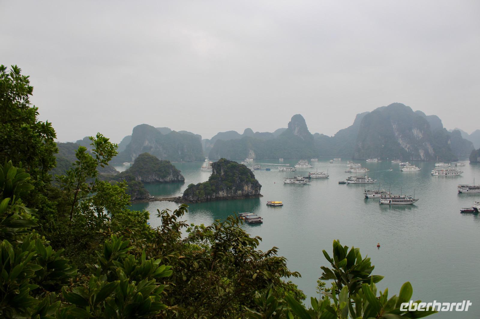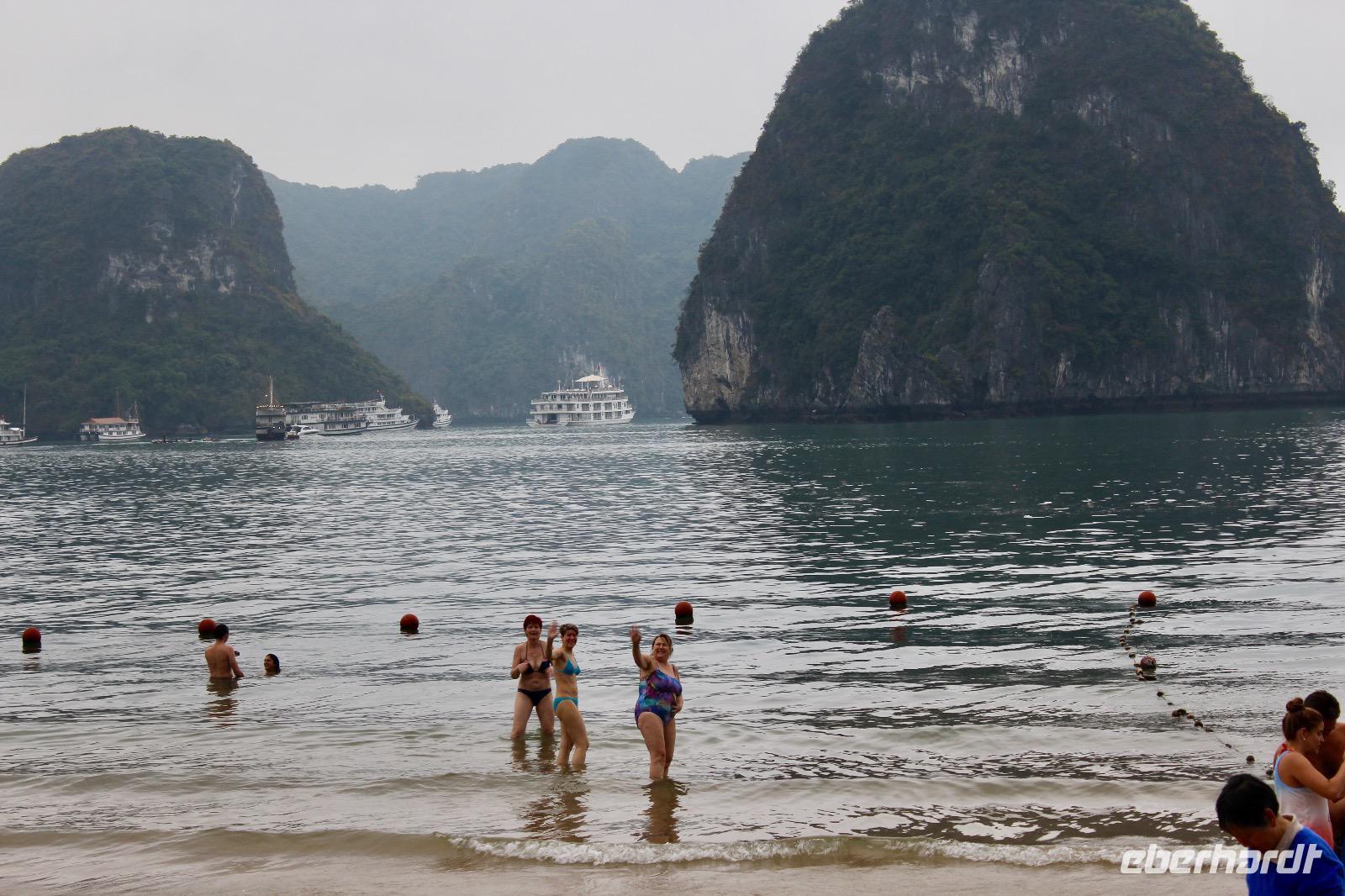 Entscheidungen sind zu treffen: an prominenter Stelle ein Bad nehmen oder/und zahlreiche Stufen aufwärts zum Aussichtspunkt überwinden. Beides hat was. Auf der halbmondförmigen Titow-Insel legen wir einen Badestopp ein. Der Sandstrand war einer der Lieblingsorte von Onkel Ho. Er traf sich dort 1962 mit dem sowjetischen Kosmonauten German Titow; seitdem trägt die Insel dessen Namen. Wer an dieser prominenten Stelle nicht in das gefühlte 16 Grad Wasser steigen möchte, überwindet ca. 450 Stufen und viel Widerstand durch Gegen- bzw. Vor- & Rückverkehr aufwärts zum Aussichtspunkt. Die Anstrengung wird mit einem sagenhaften 360-Grad-Panoramablick über die Halong-Bucht belohnt.