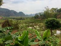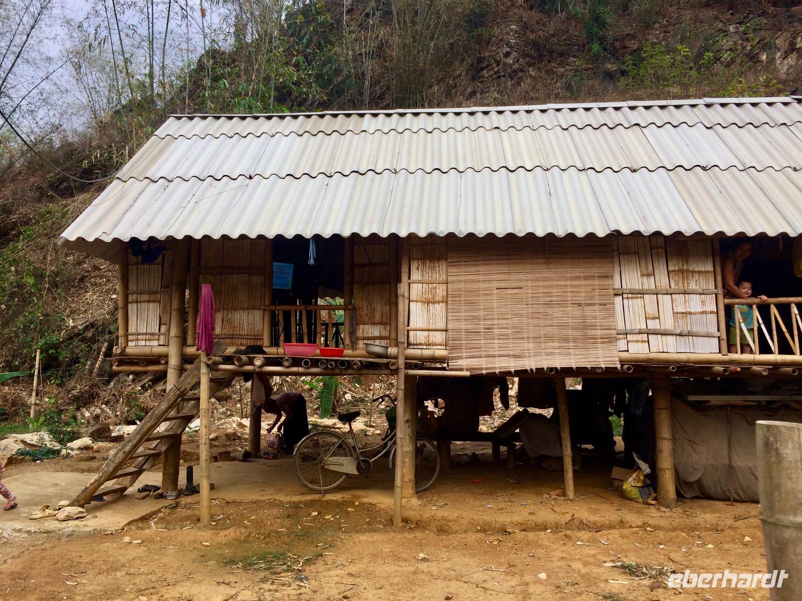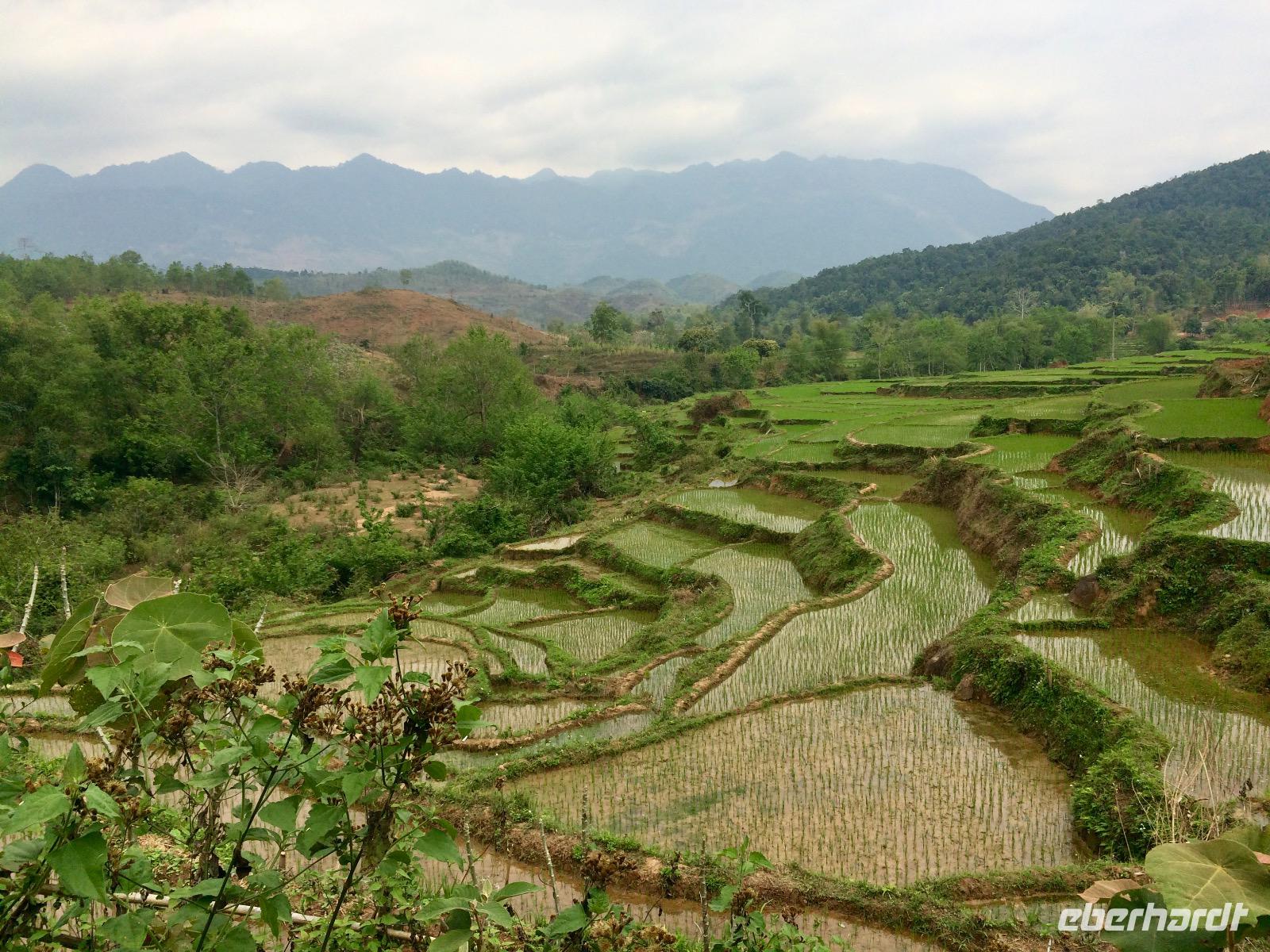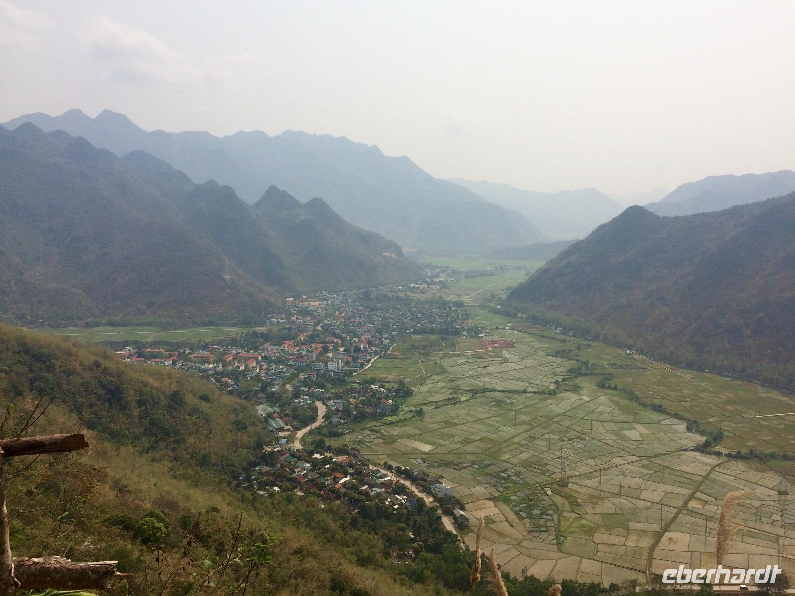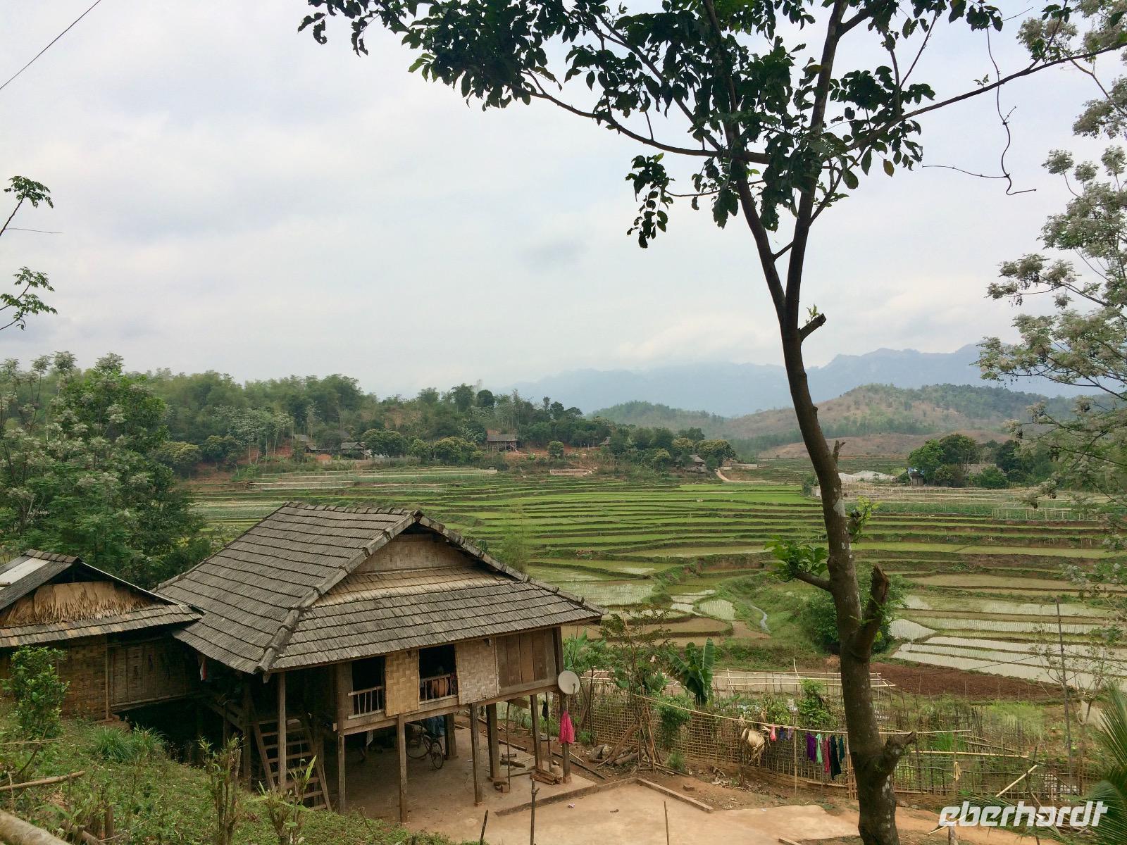 Nun geht es bergauf in die Provinz Hoa Binh auf ca. 1.200 Meter Höhe. Oben auf dem Pass legen wir eine Rast mit Blick auf das Tal von Mai Chau. In der Provinz leben etwa 1 Millionen Einwohner. Die Menschen hier sind sehr arm, sie leben nur von ihren selbst angebauten Erzeugnissen, Fischfang, Jagen und Sammeln oder leider auch vom illegalen Drogenanbau. Tourismus gibt es erst seit zwei/drei Jahren, denn wer außer uns verläuft sich schon hierher?