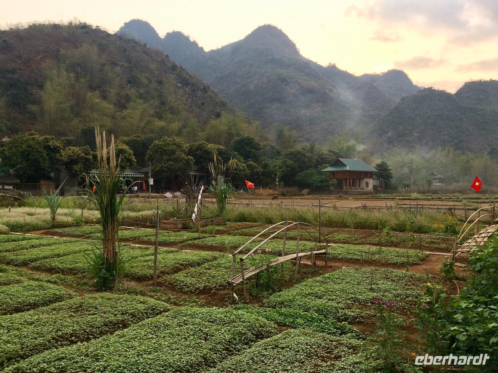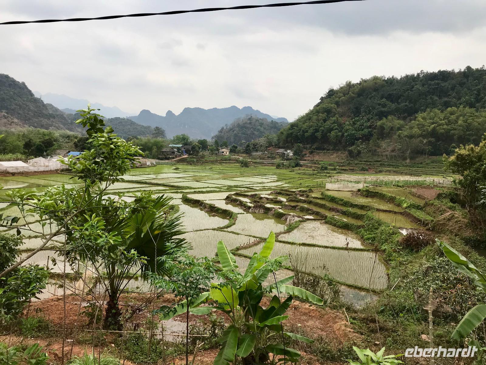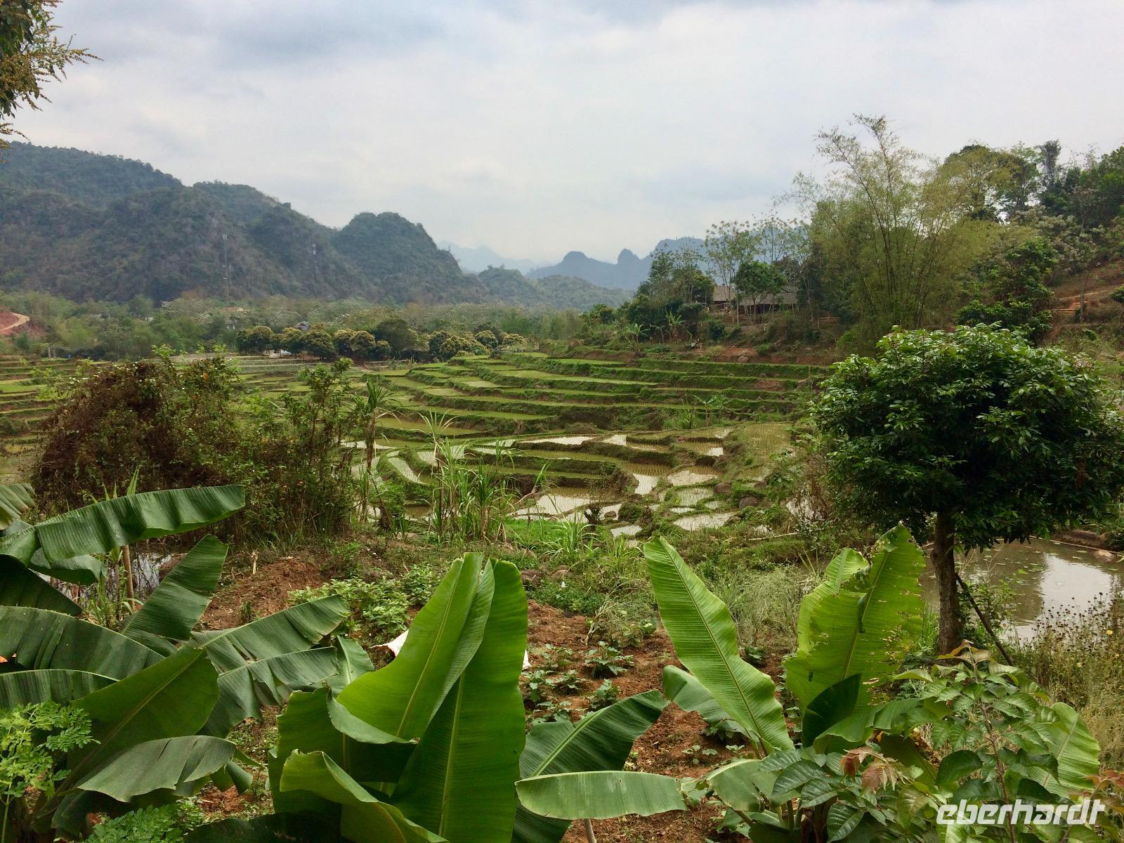 In der schönen Hach, die friedliche Stille tut unserer Seele gut. Wir erobern in Lichtgeschwindigkeit den Pool in der schönen Mai Chau Lodge. Anschließend schwingen wir uns auf die Hollandfahrräder und radeln ein gemütliche Runde durch die Dörfer mit prachtvollen Blumengärten, grünen Reisfeldern und dem Wegbegleiter Eberhardt, ein Schäferhund.