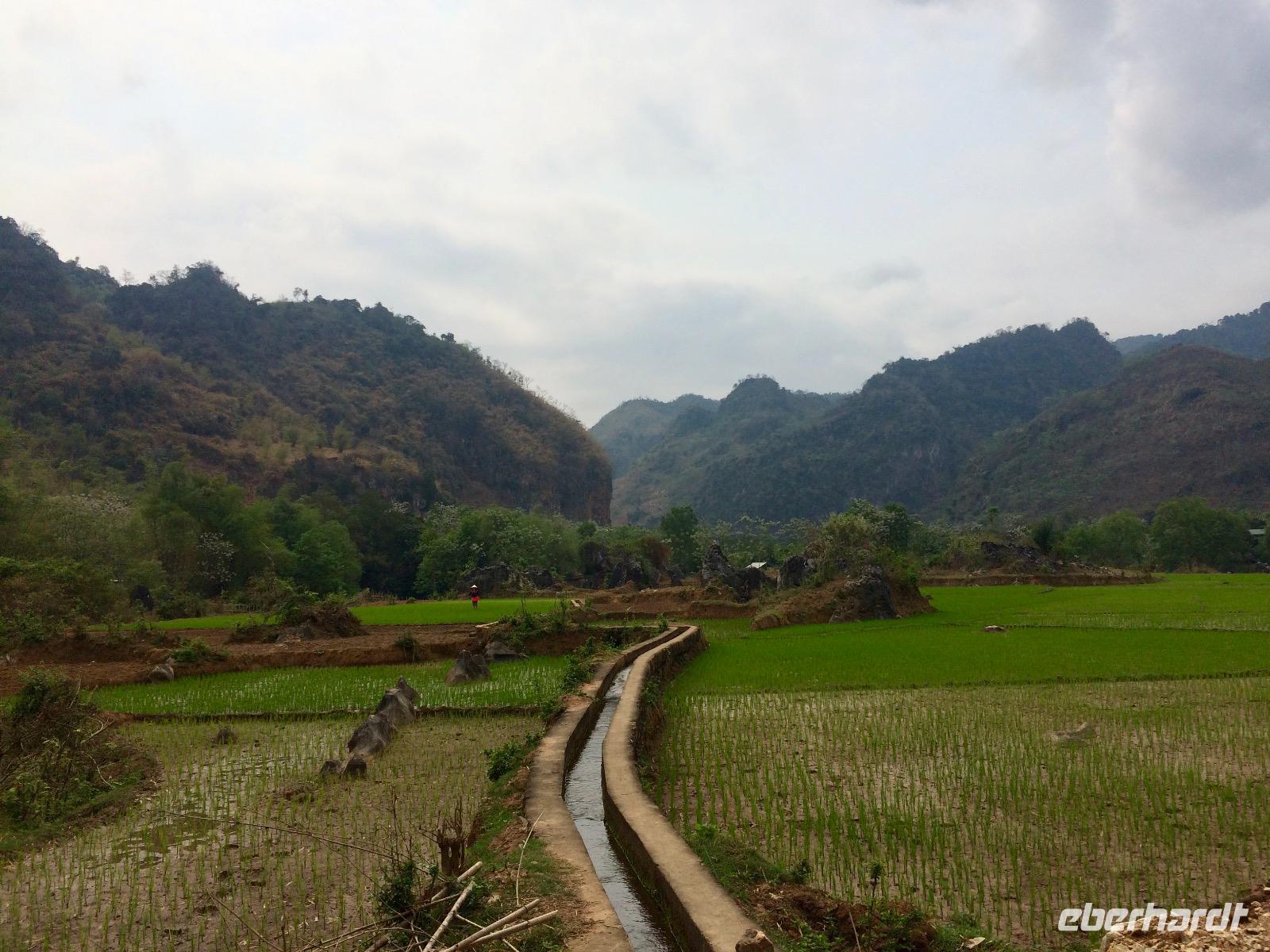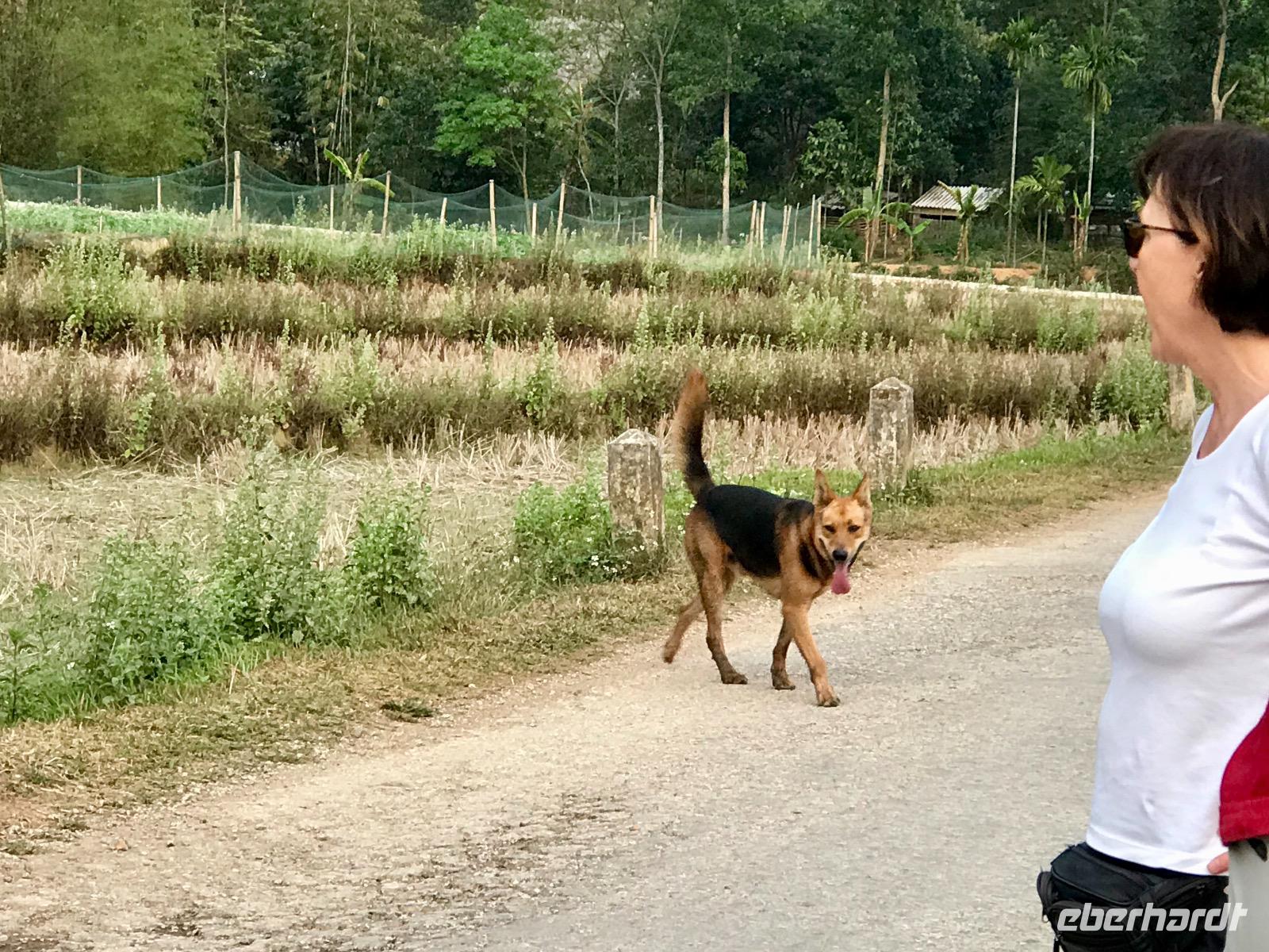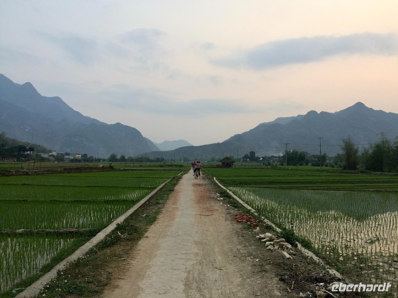 In der schönen Hach, die friedliche Stille tut unserer Seele gut. Wir erobern in Lichtgeschwindigkeit den Pool in der schönen Mai Chau Lodge. Anschließend schwingen wir uns auf die Hollandfahrräder und radeln ein gemütliche Runde durch die Dörfer mit prachtvollen Blumengärten, grünen Reisfeldern und dem Wegbegleiter Eberhardt, ein Schäferhund.