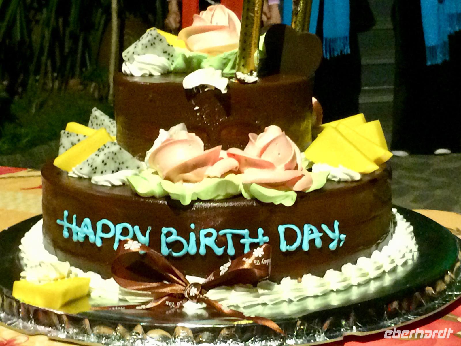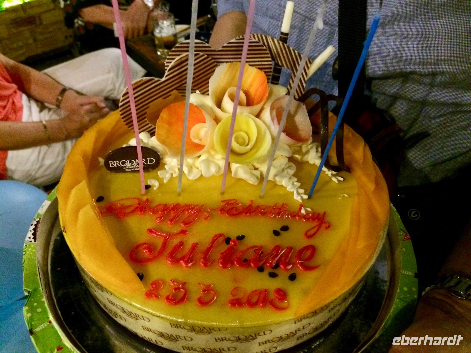 Ein abendlicher Spaziergang durch Saigon führt uns durch die belebten Straßen zu einem Grillrestaurant. Auf einer Dachterrasse bekommen wir den Lichterglanz der Stadt in voller Pracht zu bewundern. Geduldig lassen wir unser Essen auf dem Grill garen und verputzen in der Zwischenzeit einen Feuertopf aus Passionsfruchtsud sowie den Passionsfruchtcreme-Kuchen zu Julianes Geburtstag. Lecker, mit Mango!