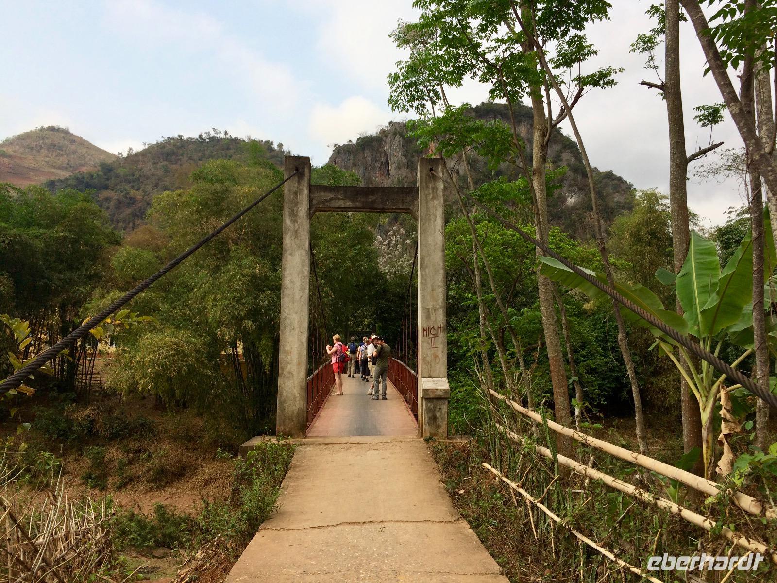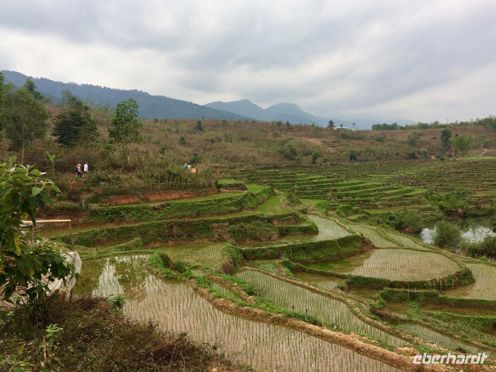 Sind erst einmal die Riesen-Mandarinen und Ananas eingesteckt, wandern wir entlang von Wasserläufen durch Reisfelder und kleine Dörfer. In dieser herrlichen Umgebung gibt es keinerlei Autos und Hektik. Die Bauern sind fleißig, der Reis ist bereits gesetzt und schon 20 Tage alt. Jetzt heißt es, Unkraut entfernen und den Boden lockern, damit demnächst gedüngert werden kann. Hier und da grüßen sie uns mit neugierigen lächelnden Gesichtern. Aufregend überwinden wir ein paar Hängebrücken - das Gleichgewicht nicht verlieren und möglichst keine Höhenangst haben! Dann werden wir mit schönen Ausblicken von leuchtend grünen Reisterrassen belohnt. Gegen Mittag tuen uns schon die Füße weh... Aufgrund der hervorlugenden Sonne gibt es kaum ein schattiges Plätzschen, um mal eine Rast einzulegen, also ziehen wir es durch bis zum Etappenziel: dem Pfahlhaus einer Thai-Familie im Dorf Ban Buoc.