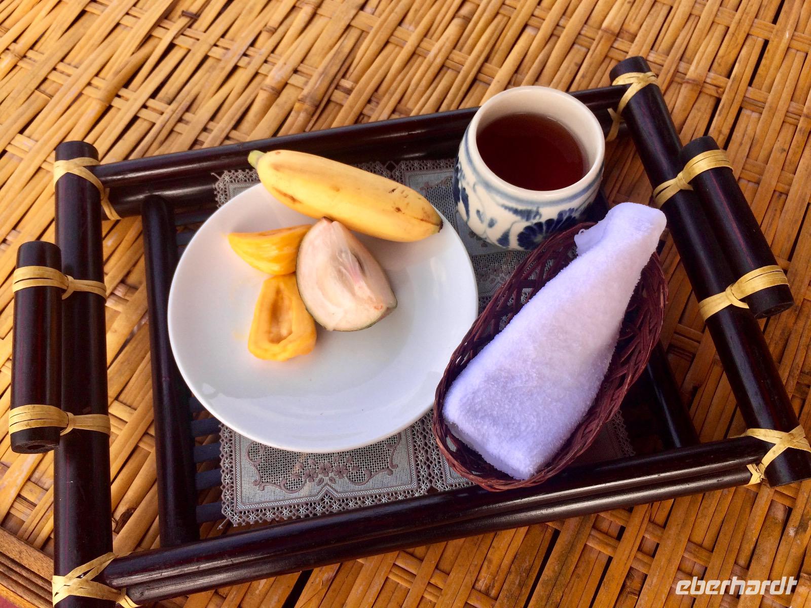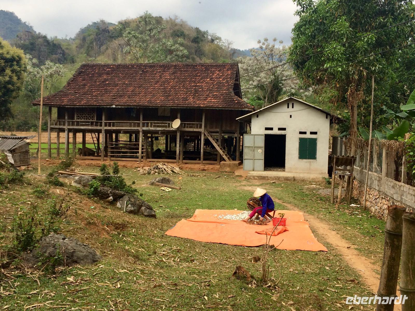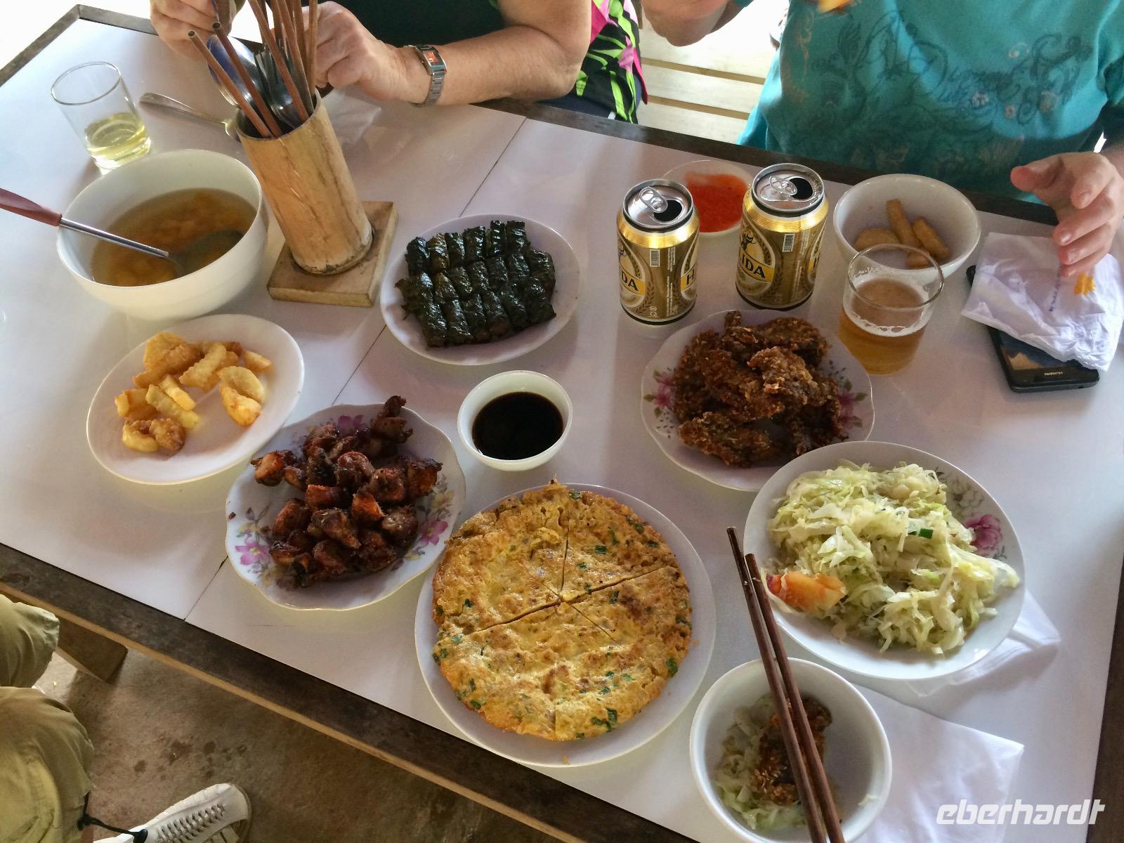 Die vietnamesischen zehn Wanderkilometer haben uns einen riesen Apetit bereitet und so erfreuen wir uns an dem Mittagessen der Familie mit Fisch aus den nahen Gewässern, Ei, am Feuer gegrilltes Fleisch und Gemüse aus dem Garten. Die Oma des Hauses gibt uns eine kleine Darbietung, wie sie schon zu Kindeszeiten am Webstuhl die Tücher und Gewänder webte.