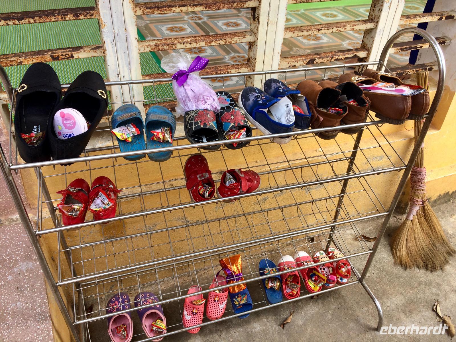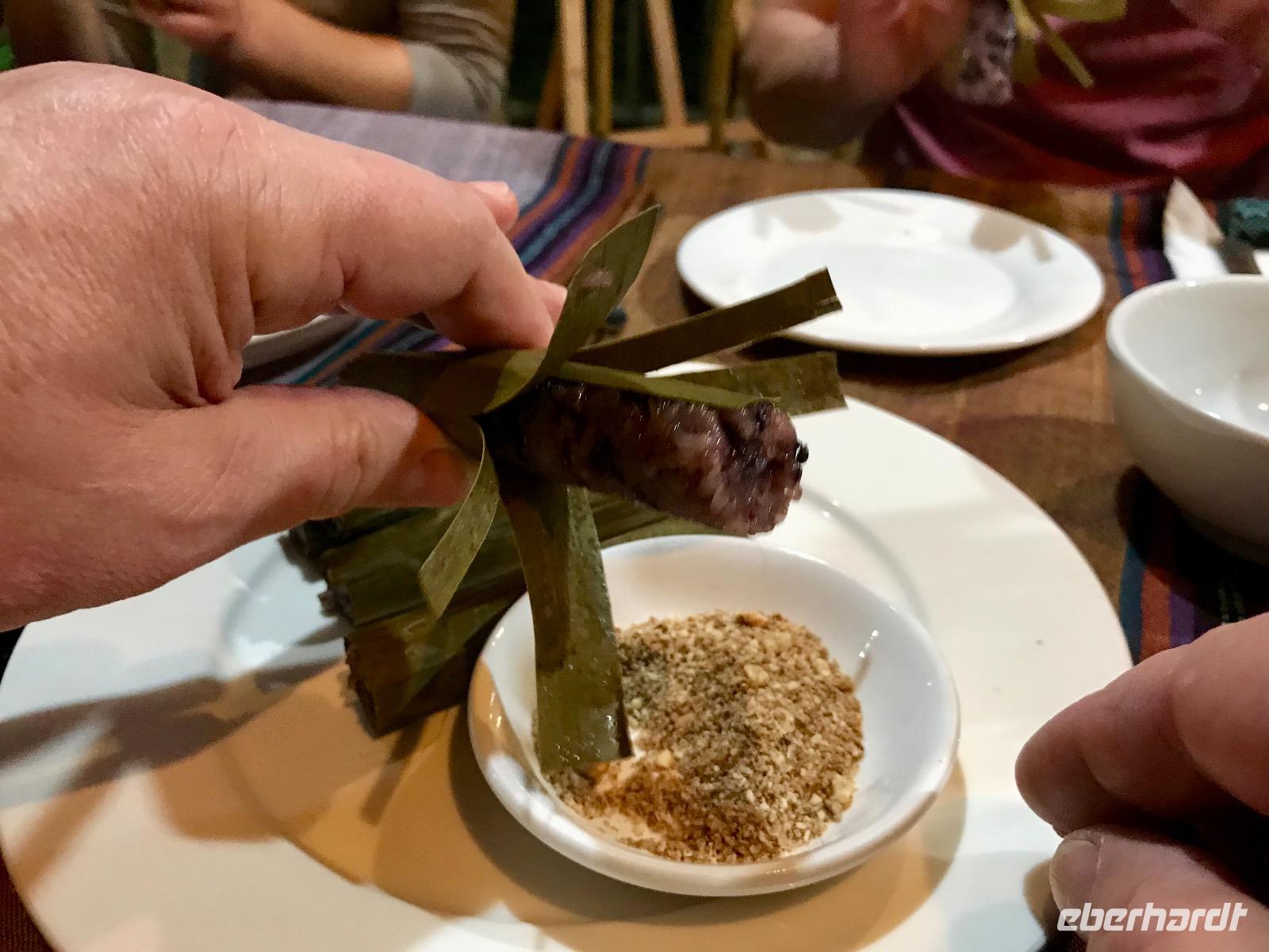 Da wir noch einige Naschereien und Stifte sowie Malhefte für die Einheimischen im Rucksack haben, beschließen wir kurz am Kindergarten vorbeizufahren. Um die Kinder nicht aus ihrem Schlaf zu wecken, spielen wir Nikolausfrauen und legen die Geschenke in ihre Pantoffelchen. Die Erzieherinnen werden sich bestimmt auch über deutsche Kosmetik in ihren Schuhen freuen. Leise entfernen wir uns vom Kindergarten... schon schaut ein Köpfchen heraus, dann zwei, dann drei, dann rennen die Kleinen mit verschlafenen Augen zu ihren Schühchen und können die Überraschung kaum fassen. Das Teilen mit den Dorfkindern zaubert ihnen ein breites Grinsen auf den Gesichtern, deren Lachen ist so betörend, dass unsere Herzen aufgehen. Ach, wie niedlich! Inzwischen kommt auch Walter von seinem Mopedtaxi-Abenteuer zur Gruppe und wir legen am Nachmittag noch ein bisschen die Füße hoch. Wer mag, dreht noch eine kleine Runde durch die Dörfer mit dem Elektrofahrzeug oder dem Fahrrad. Einige schließen sich Anh an und kosten im Dorf im Bambusrohr gegrillten Klebreis in lila und schwarzer Farbe, dazu Erdnüsse. Yummy!