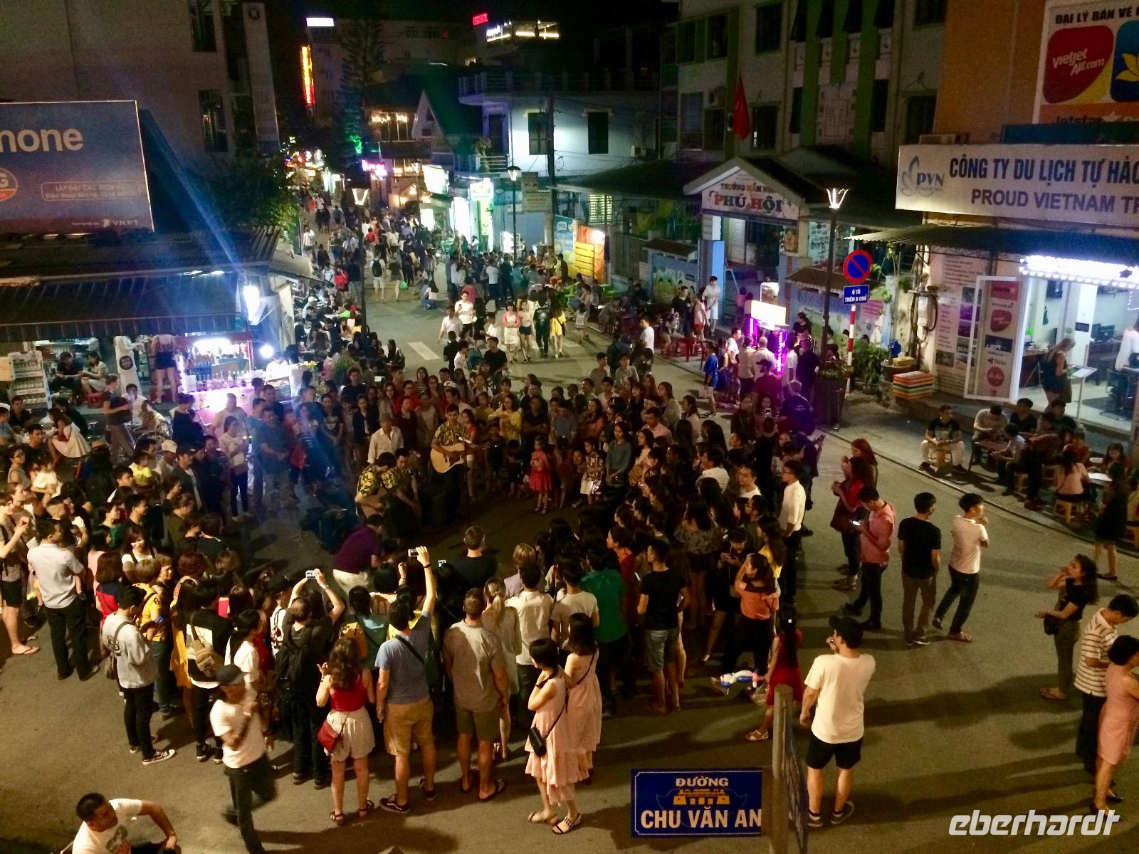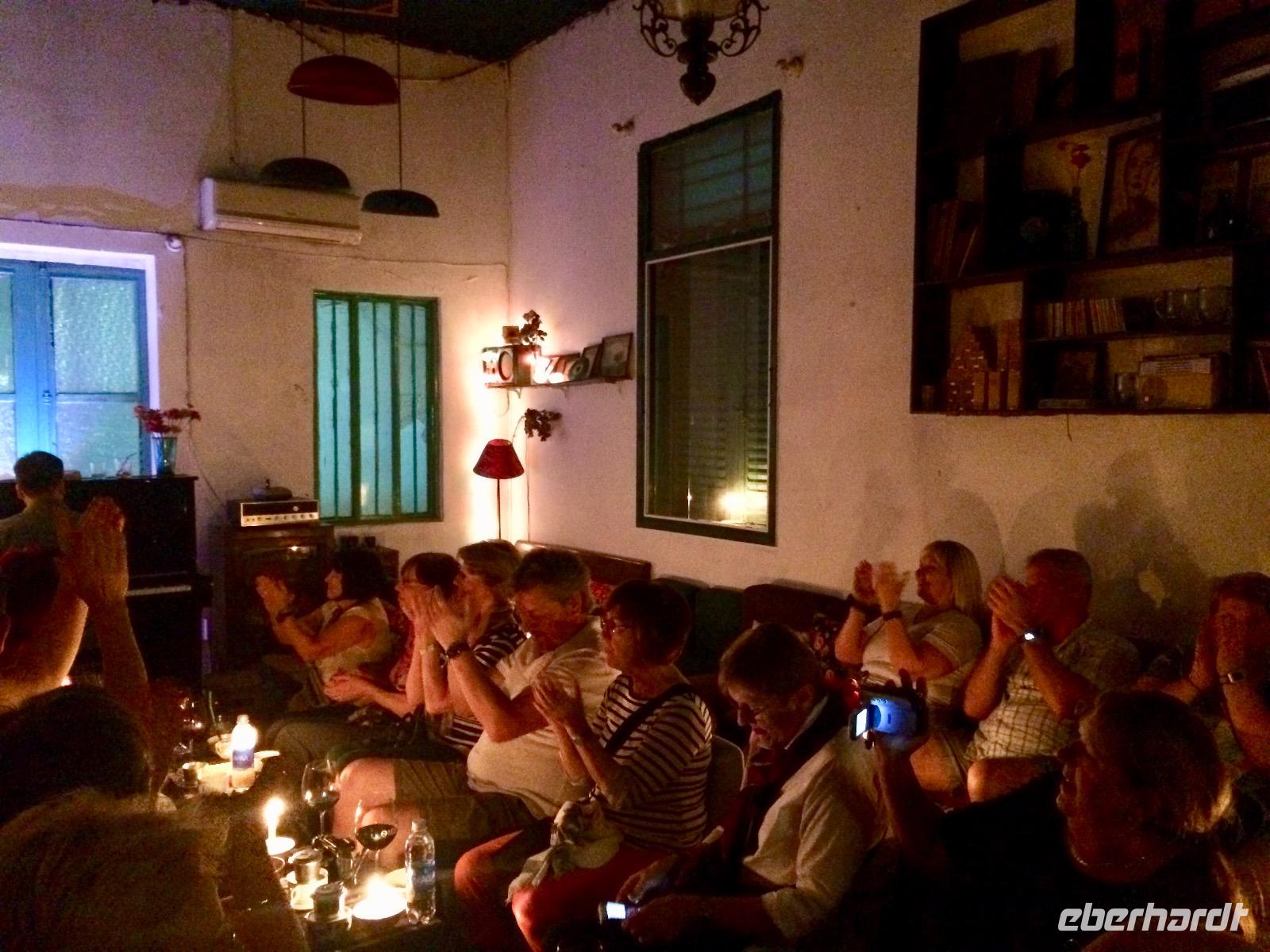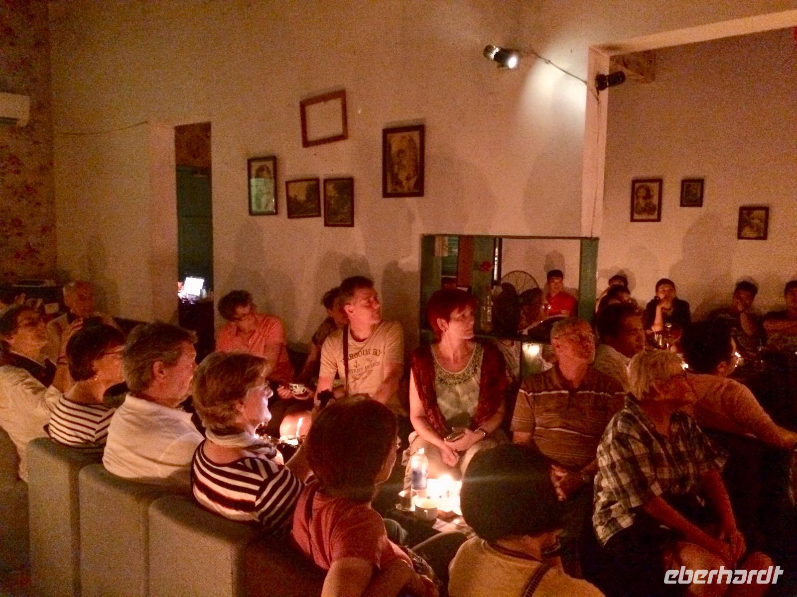 Mit Vergnügen steigen wir wieder auf die Vespas, um nun zum Dessert zu kommen. Auf der Fahrt erzählt mir mein Chauffeur, dass alle Vespas aus Italien kommen und einige sogar original aus 1975 stammen. Dann fahren wir plötzlich von der Hauptstraße ab und landen in einer dunklen Ecke. Unsere Reisegäste schauen Anh skeptisch an... Wir gehen durch einen leeren Markt, steigen schmale Treppen hinauf und lugen durch eine Tür. Hinter ihr befindet sich eine kleine Bar, in dem Musiker auf einer Violine, einem Klavier und einer Gitarre spielen. Dazu singen vietnamesische Jugendliche internatione Pop-Lieder. Zum Dessert dürfen wir uns Eis und Kaffee wünschen.