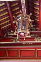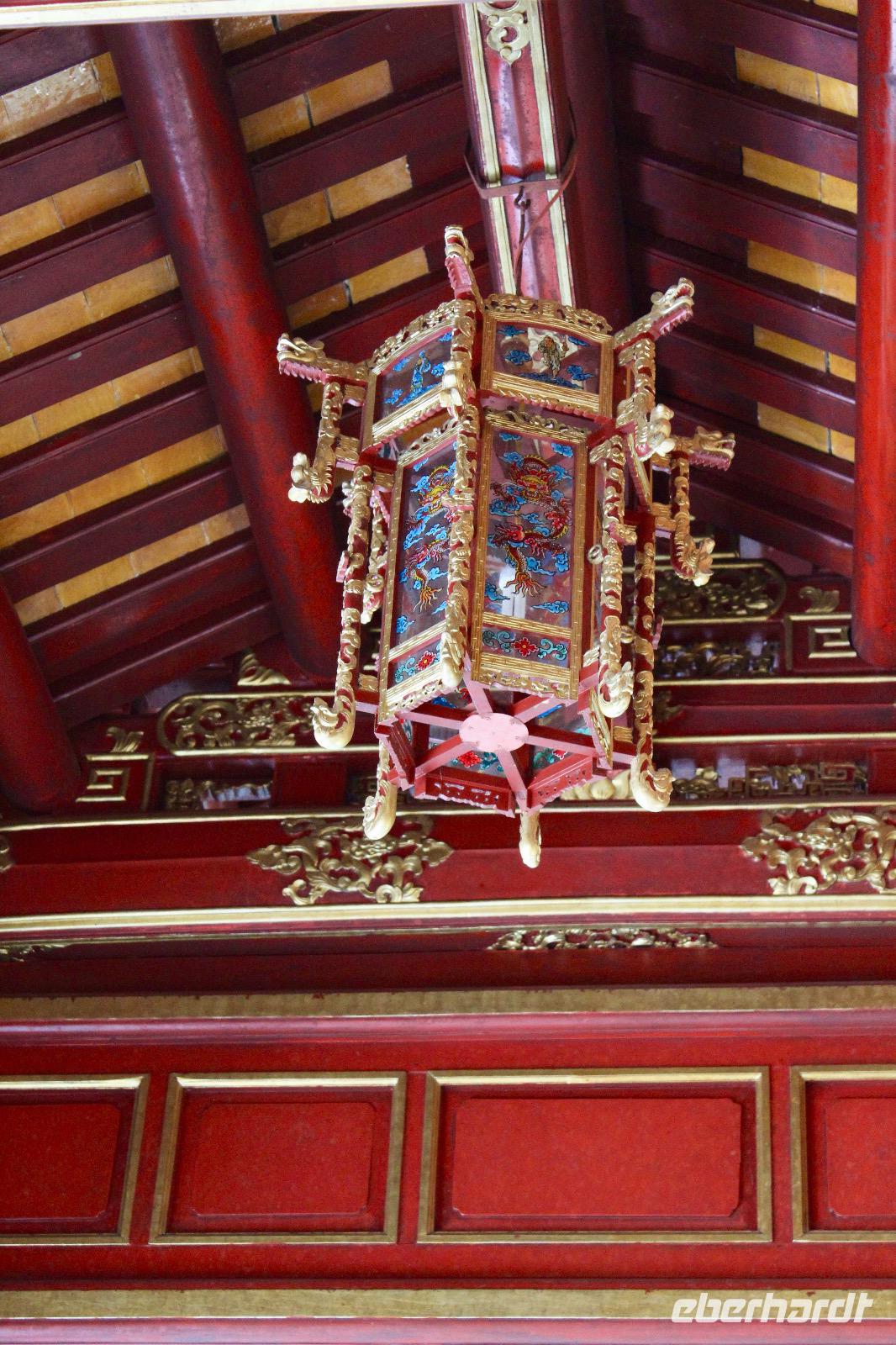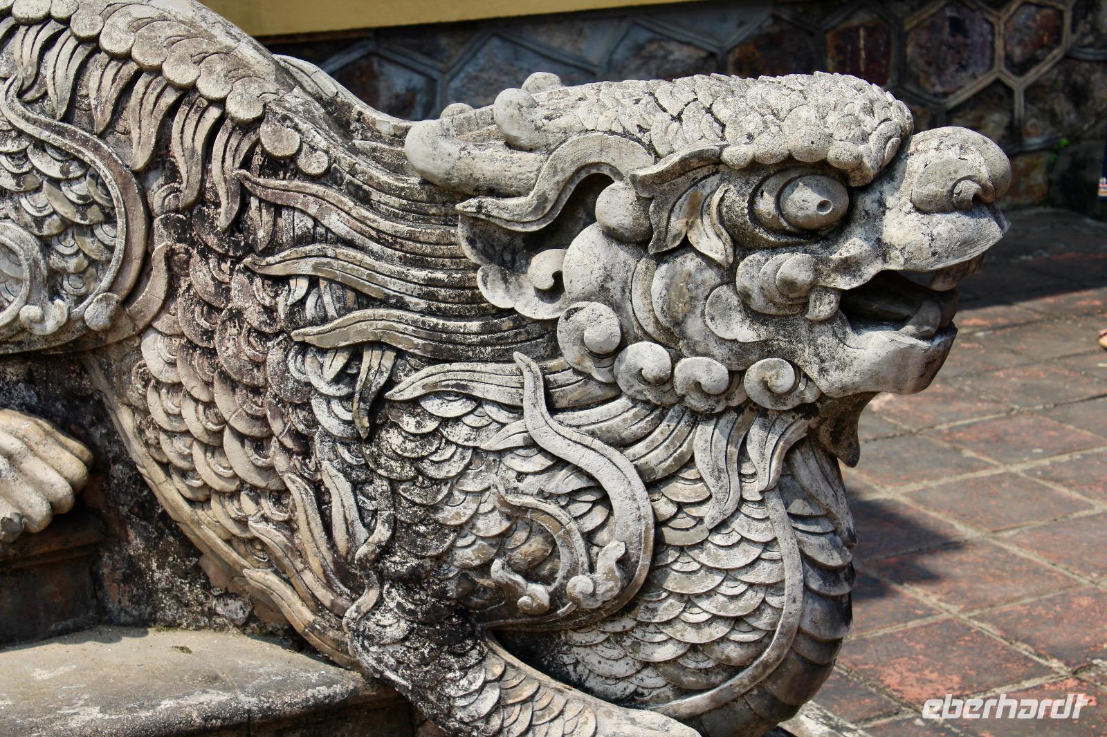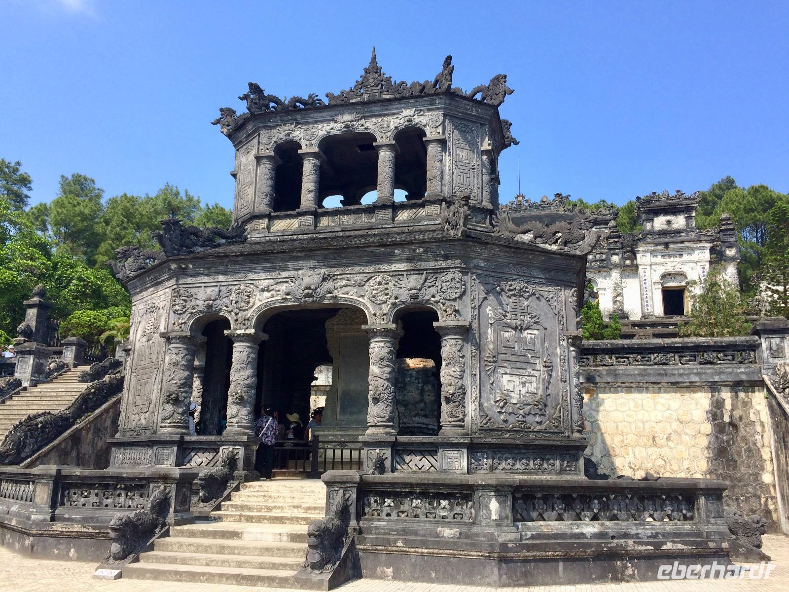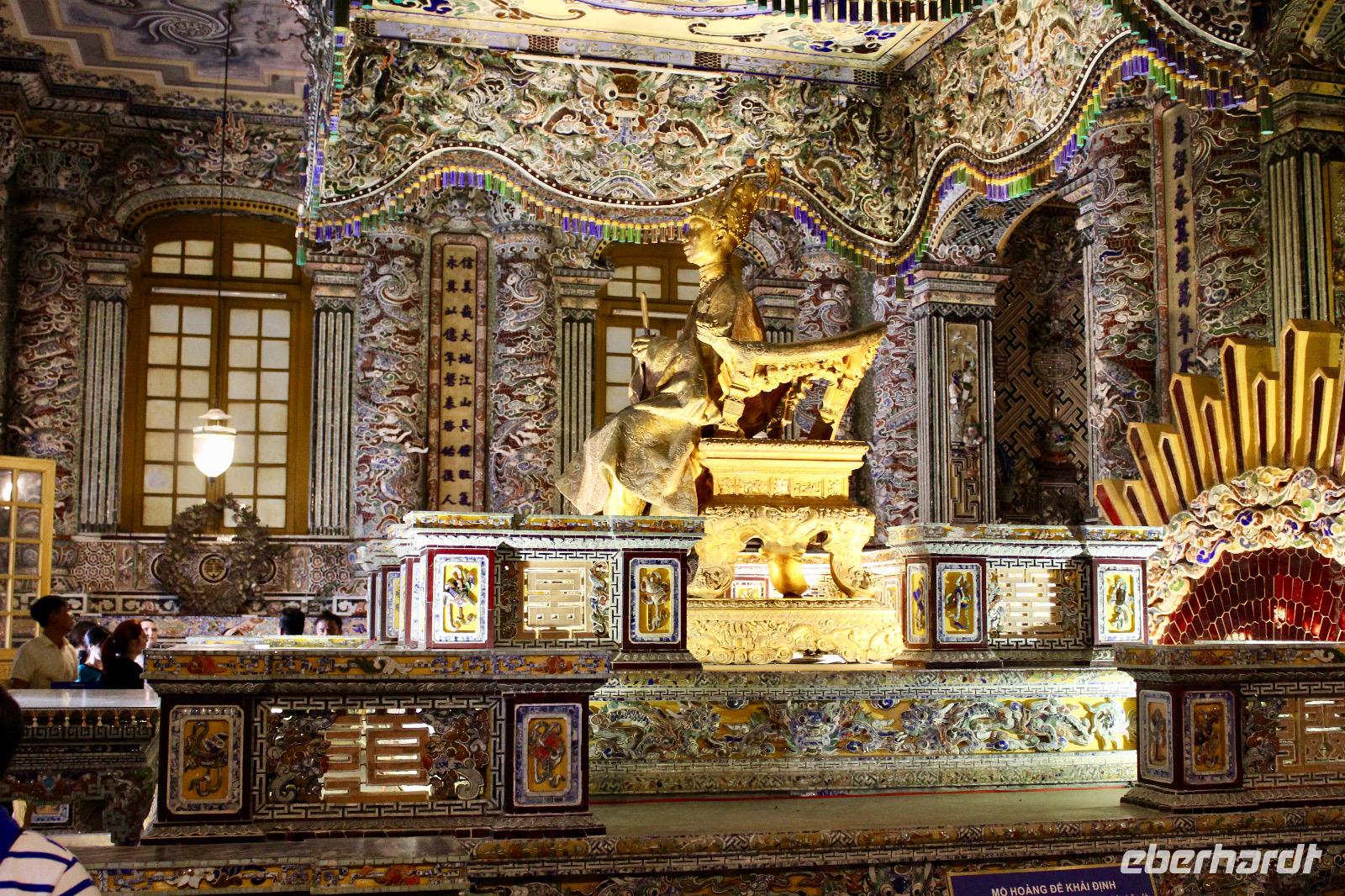 Wir machen nochmal einen Zeitsprung nach vorn und begeben uns in die Zeit des vorletzten Königs. 143 Jahre lang regierten dreizehn Kaiser der Nguyen-Dynastie in Hue, umgeben von einem feudalistischen Hofstaat chinesischer Prägung, zuerst in glanzvoller Pracht, dann in Dekadenz und letztendlich in Unterwerfung unter die Kolonialmacht Frankreichs. Khai Dinh war der zwölfte und vorletzte Kaiser, dessen Grabanlage wir uns genauer ansehen wollen. Wo die Trauer lächelt, und die Freude weint - Treffender kann man die Stimmung dieser Orte kaum wiedergeben. Die großzügig angelegte Anlage in einem Park repräsentiert einen völlig anderen Baustil als der Kaiserpalast. Sehr groß und prunkvoll wurde sie auf einem Berg errichtet. Wir steigen zahlreiche Stufen hinauf, um ein originalgetreues Abbild aus Gold von ihm zu sehen, dem vorletzten Nguyen-Kaiser, der nur noch eine Marionette der Franzosen war. Unverkennbar ist das Zusammenspiel aus japanischen, chinesischen und europäischen Einflüssen der grandiosen Anlage, welche über 10 Jahr lang gebaut wurde.
