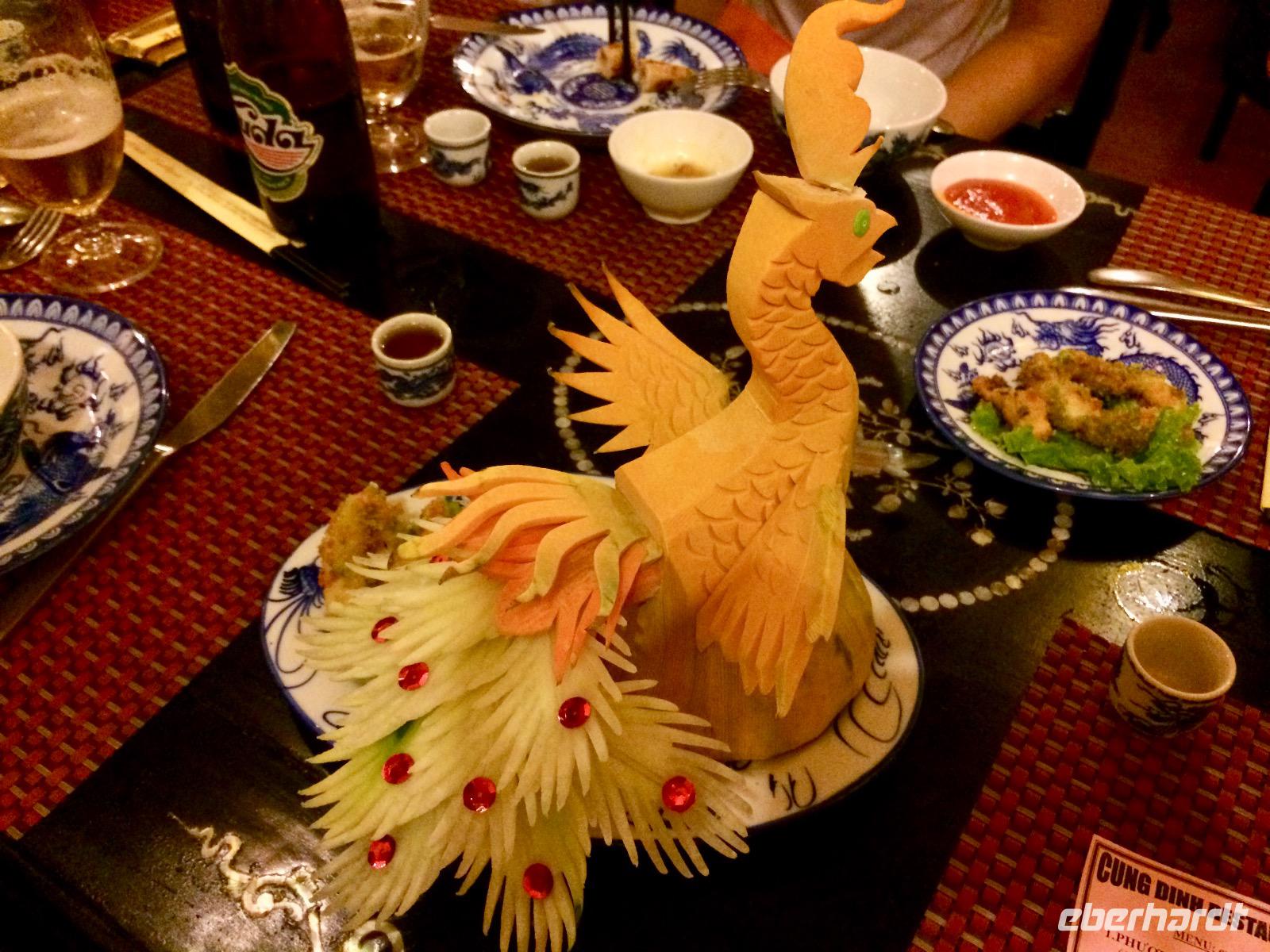 Nach so viel Geschichte haben wir uns heute einen schönen Abend verdient. Wir gönnen uns eine befreiende Massage, denn die Pflege des Körpers und der Seele darf nicht zu kurz kommen. Danach entscheidet das Los, dass Andrea unsere Königin des Abends ins und wir kühren Jürgen als König. Wenn das Volk gemeinsam ruft, hat auch der König keine Chance, he, he, he... Wir anderen dürfen als gutaussehende Mandarinen zum Gruppen-Fotoshooting erscheinen. Unser kaiserliches Abendessen wird mit folkloristischer Livemusik untermalt und wir lernen traditionelle Instrumente kennen 16-Saiten Dan Tranh, zwei Teetassen sowie das berühmte Instrument Dan Bau mit nur einer Saite.