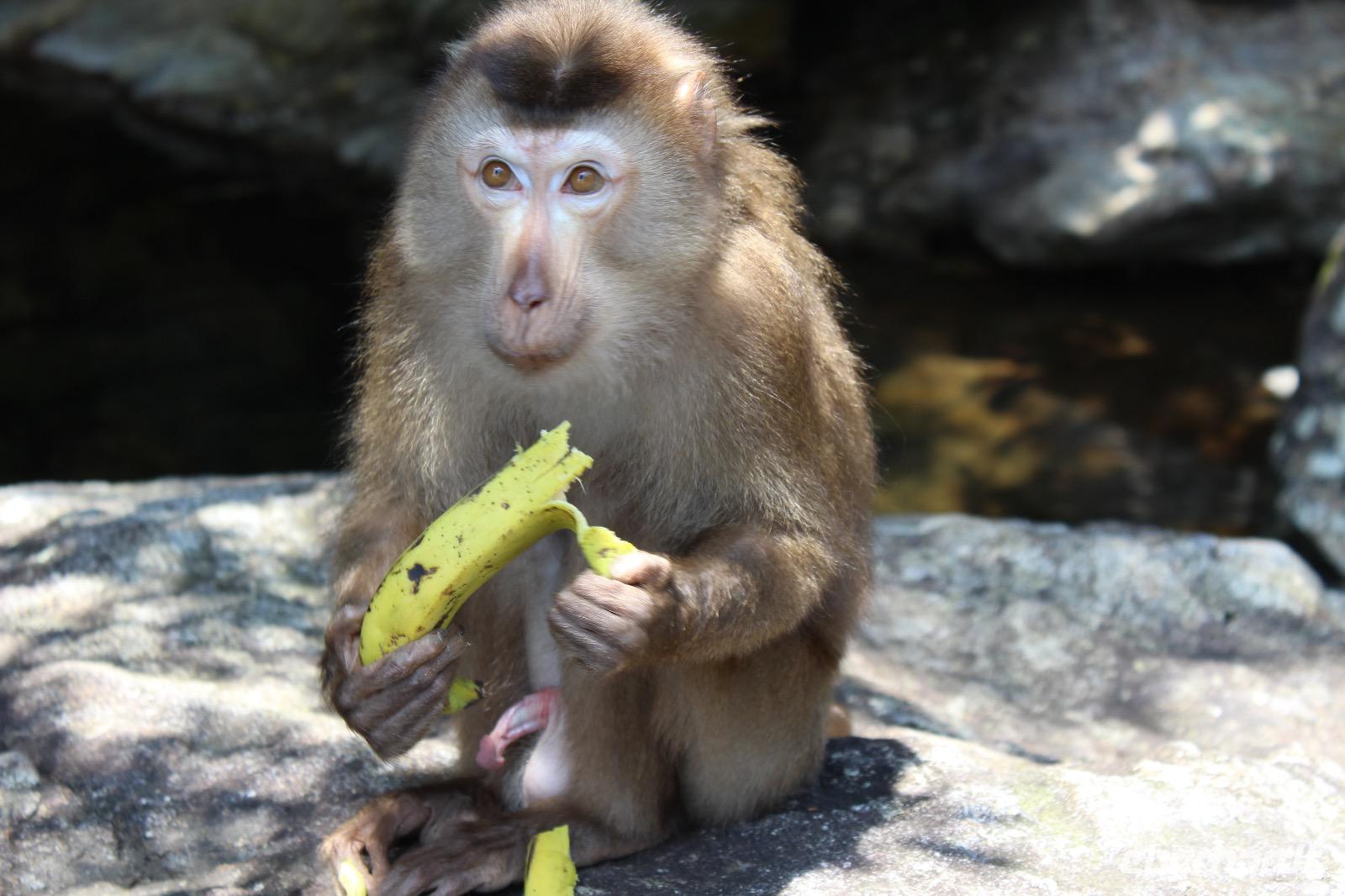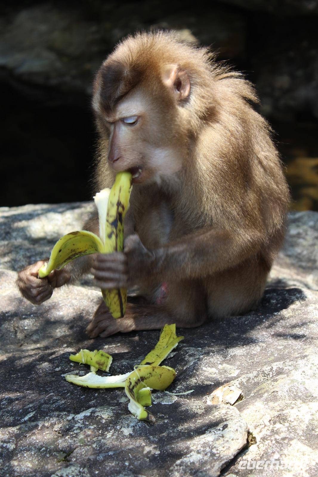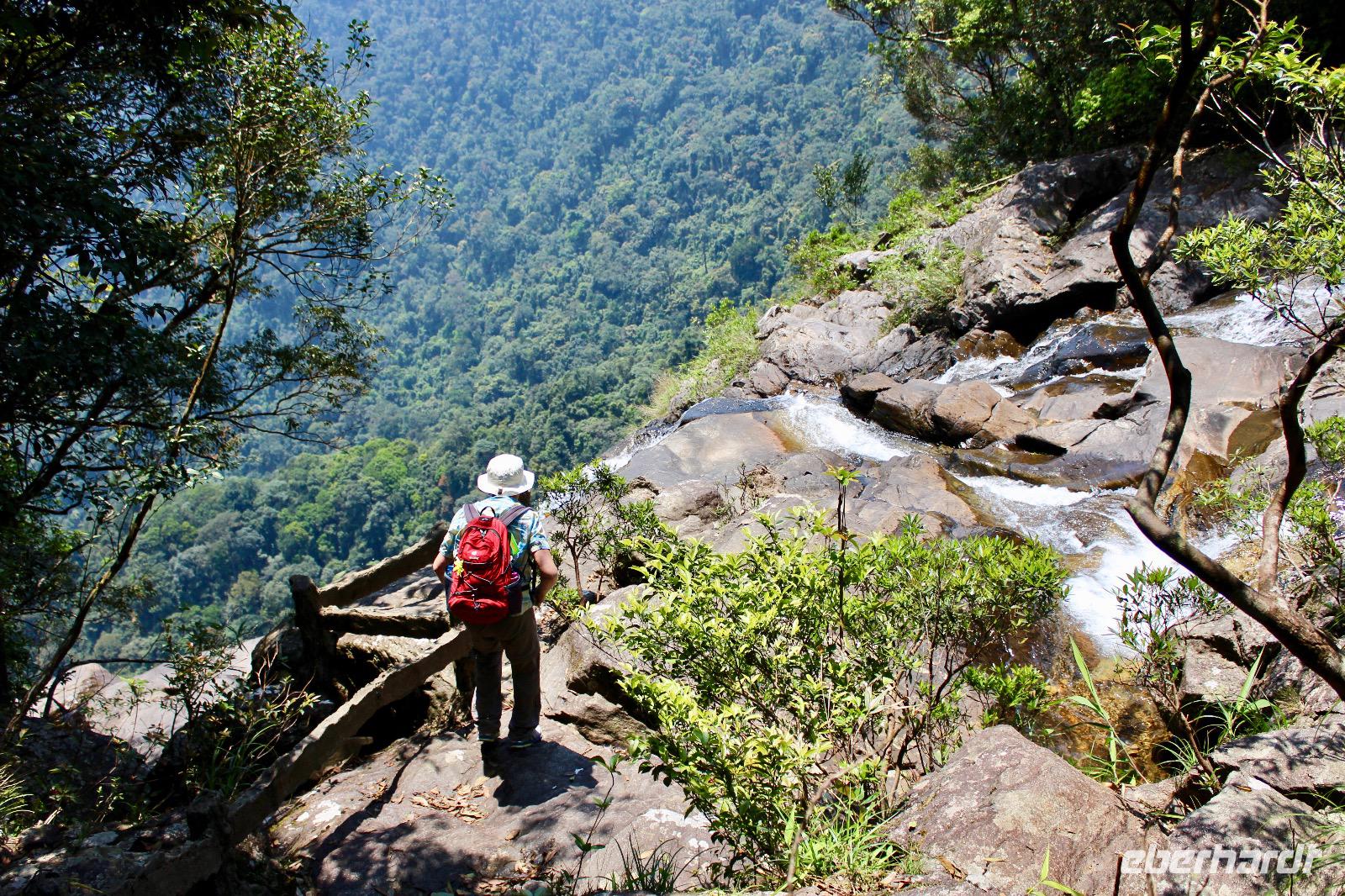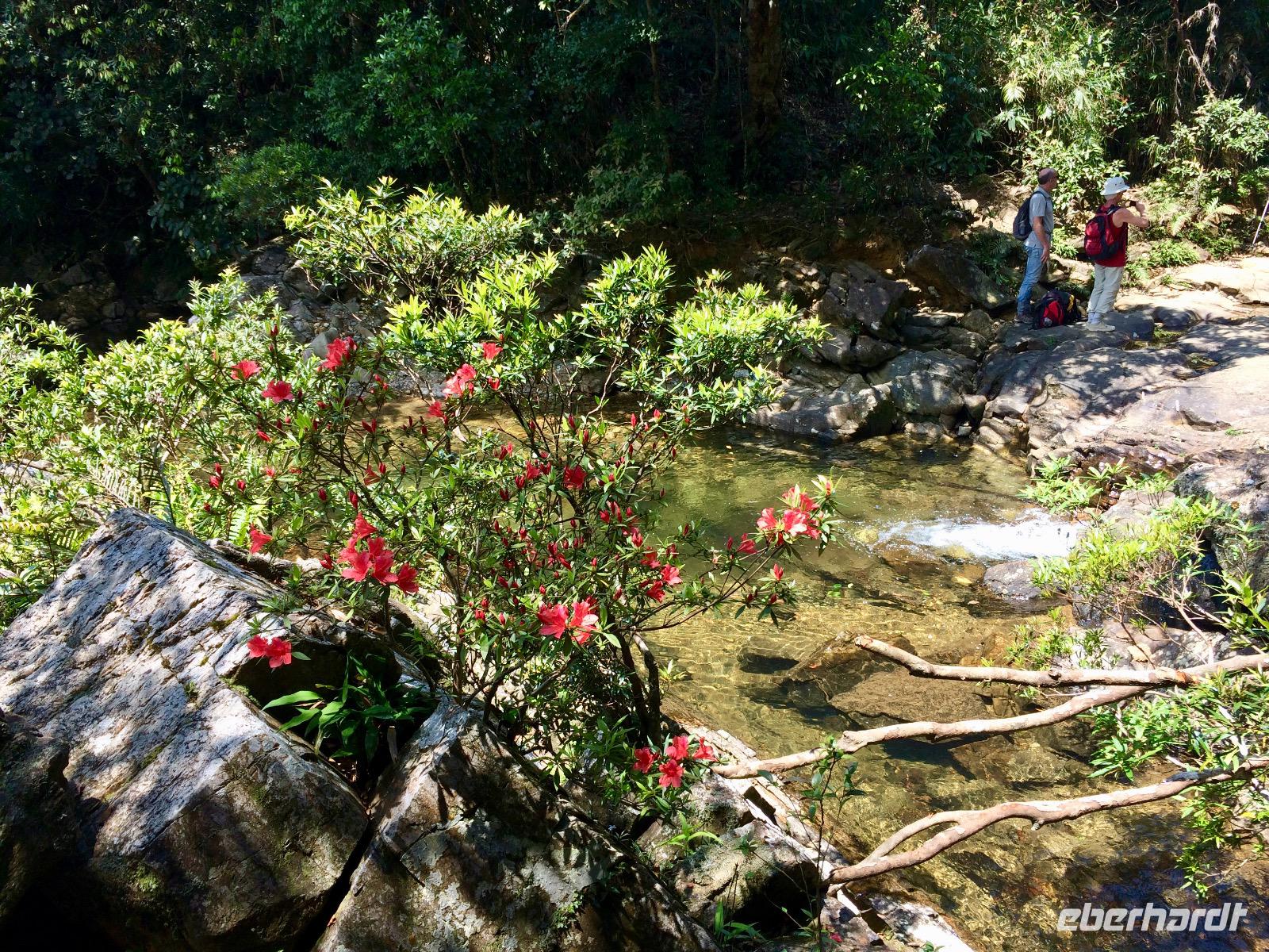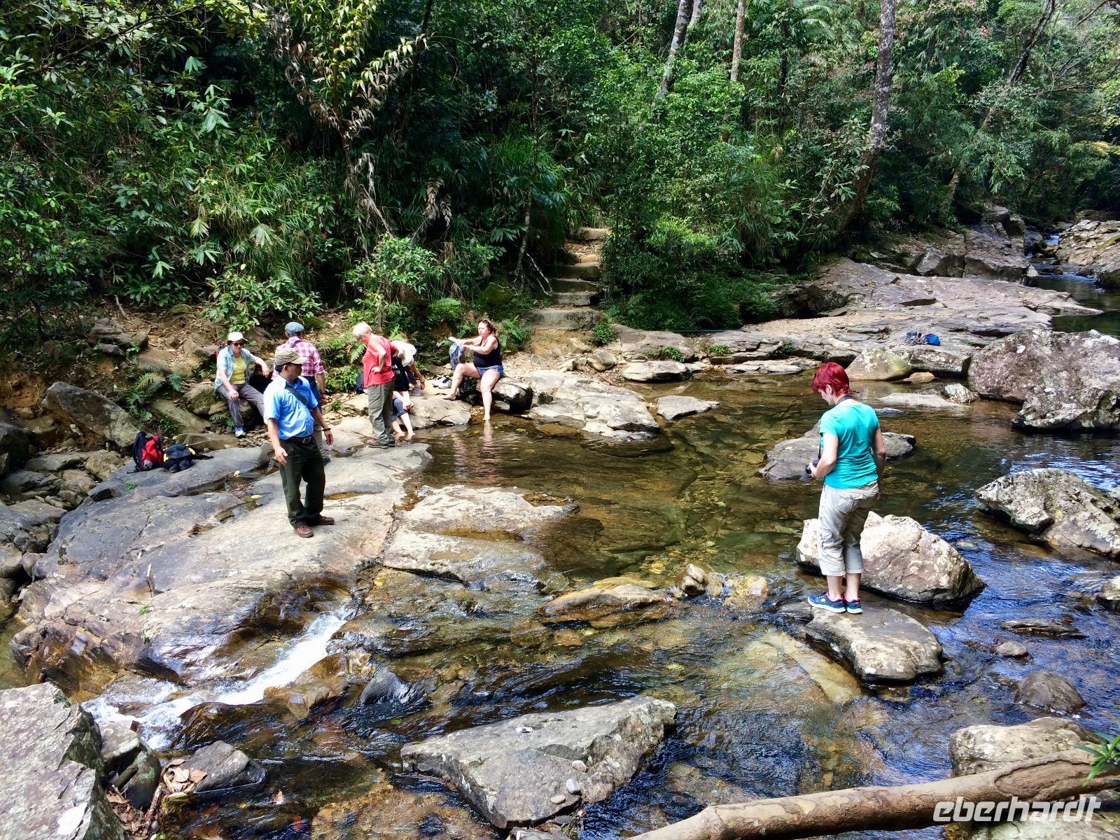 Wir benötigen ein paar Handtücher, denn wir wollen oben im Park in kleinen Seen baden. So spazieren wir durch einen lokalen Markt mit super frischen Produkten. Frischer geht es fast kaum, denn es gibt lebende Hühner, Enten, Frösche, aus dem Garten gepflücktes Gemüse und schwimmende Fische. Das Obst macht uns mehr an, sodass Anh saftig süße Longang (Drachenaugenfrucht) für die Gäste einkauft. Am Fuße des Berges am Bach Ma-Nationalpark steigen wir in zwei Kleinbusse um. Sie huckeln die schmalen Straßen den Berg hinauf und schnell verstehen wir, warum wir unseren Reisebus schonen sollten. Oben haben traumhafte Ausblicke auf die sich weit erstreckende Dschungellandschaft. Förster Cam lebt schon viele Jahrzehnte mit dem Wald und erklärt uns viel Interessantes über Heilpflanzen. Juliane sagt, hier bräuchte man gar keine Apotheke mehr, denn alles gibt uns der Wald. Dem Rhododren-Pfad folgen wir bis zur obersten Stelle eines Flusses, wo wir unseren Mut beweisen und von Stein zu Stein bis zum Wasserfall zu hopsen. Nichts ahnend feiern unseren Erfolg und genießen die Aussicht. Plötzlich sitzt ein kleiner Affe zu unseren Füßen und lässt sich ungestört fotografieren. Ein Mal eine Banane ausgepackt, lässt er sich nicht mehr abwimmeln, nascht gern von unseren Reiswaffeln und Drachenaugenfrüchten.