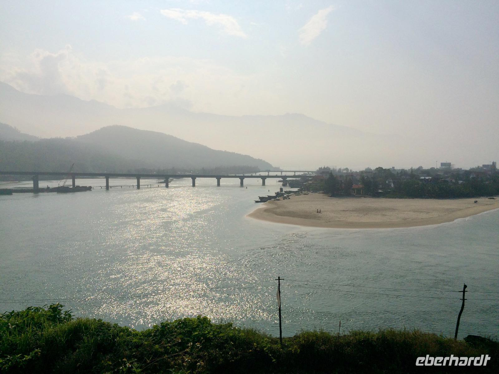 Der Wasser-Wolkenpass Hai Van bildet die natürliche Grenze und Wetterscheide zwischen Nord- und Süd-Vietnam. Er ist etwa 20 Kilometer lang und erreicht 496 Meter Höhe. Auf der Passhöhe angekommen, gestehen wir, dass Pass seinen Namen alle Ehre macht. Nur mit sehr guten Kameras ist die Silhoutte der Skyline von Danang zu fotografieren. Unser Chauffeur schlängelt durch die Stadt Danang, sodass wir die Drachenbrücke sehen können, die an Wochenende sogar Feuer spucken kann.Da Nang ist die viertgrößte Stadt Vietnams und durch seinen Naturhafen zum Pazifischen Ozean auch eine wichtige Handelsstadt.