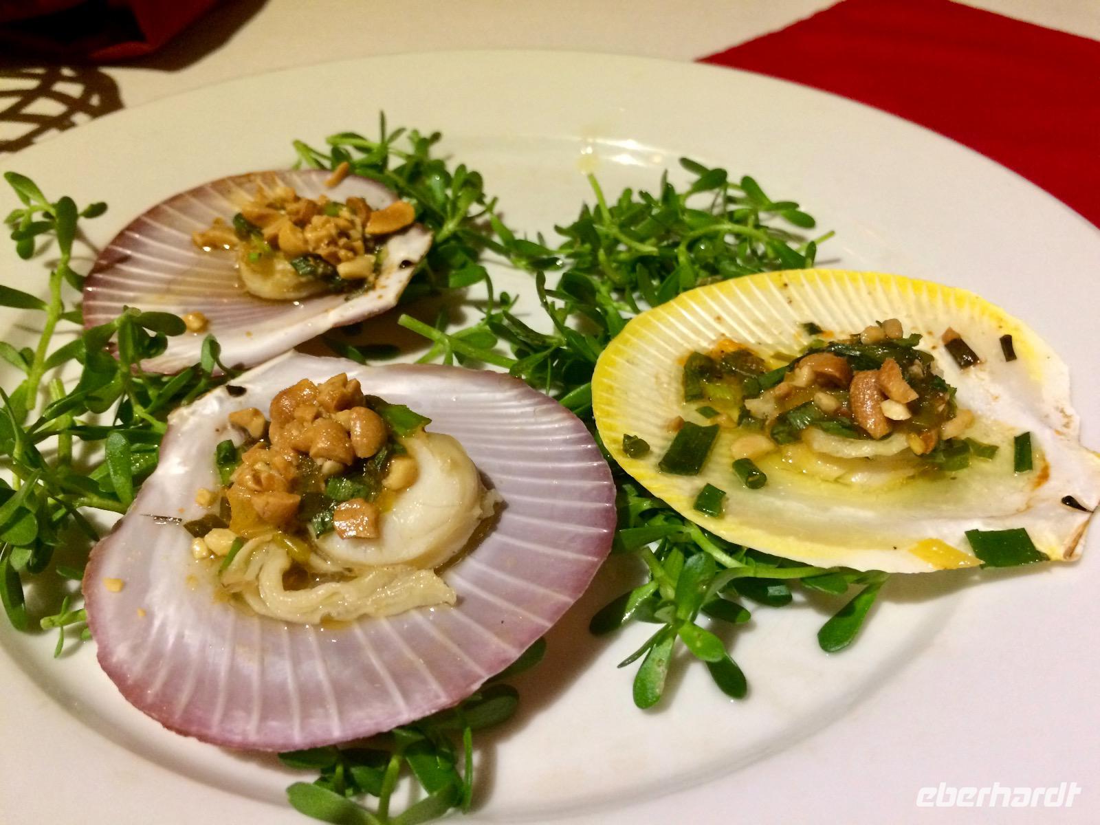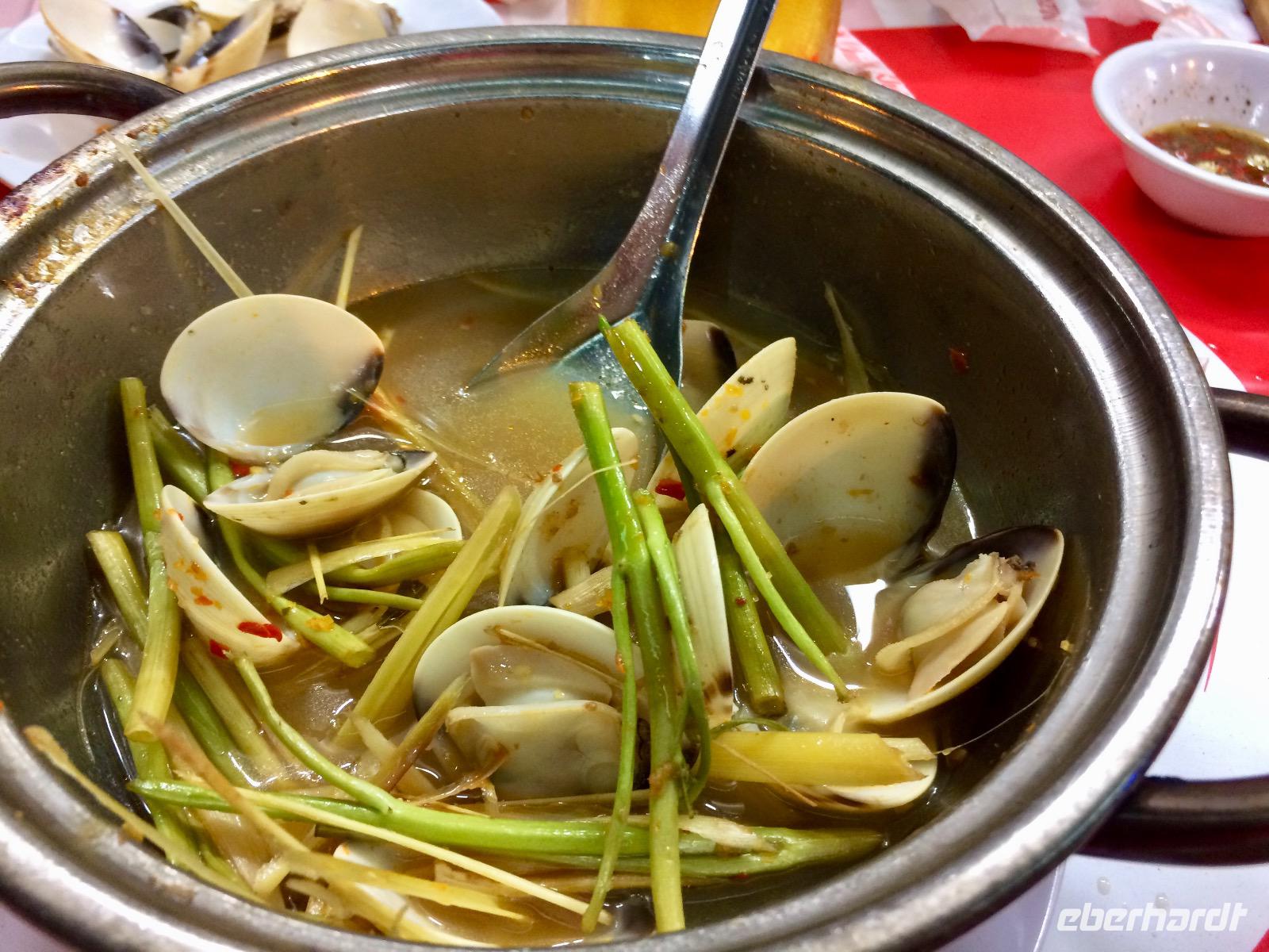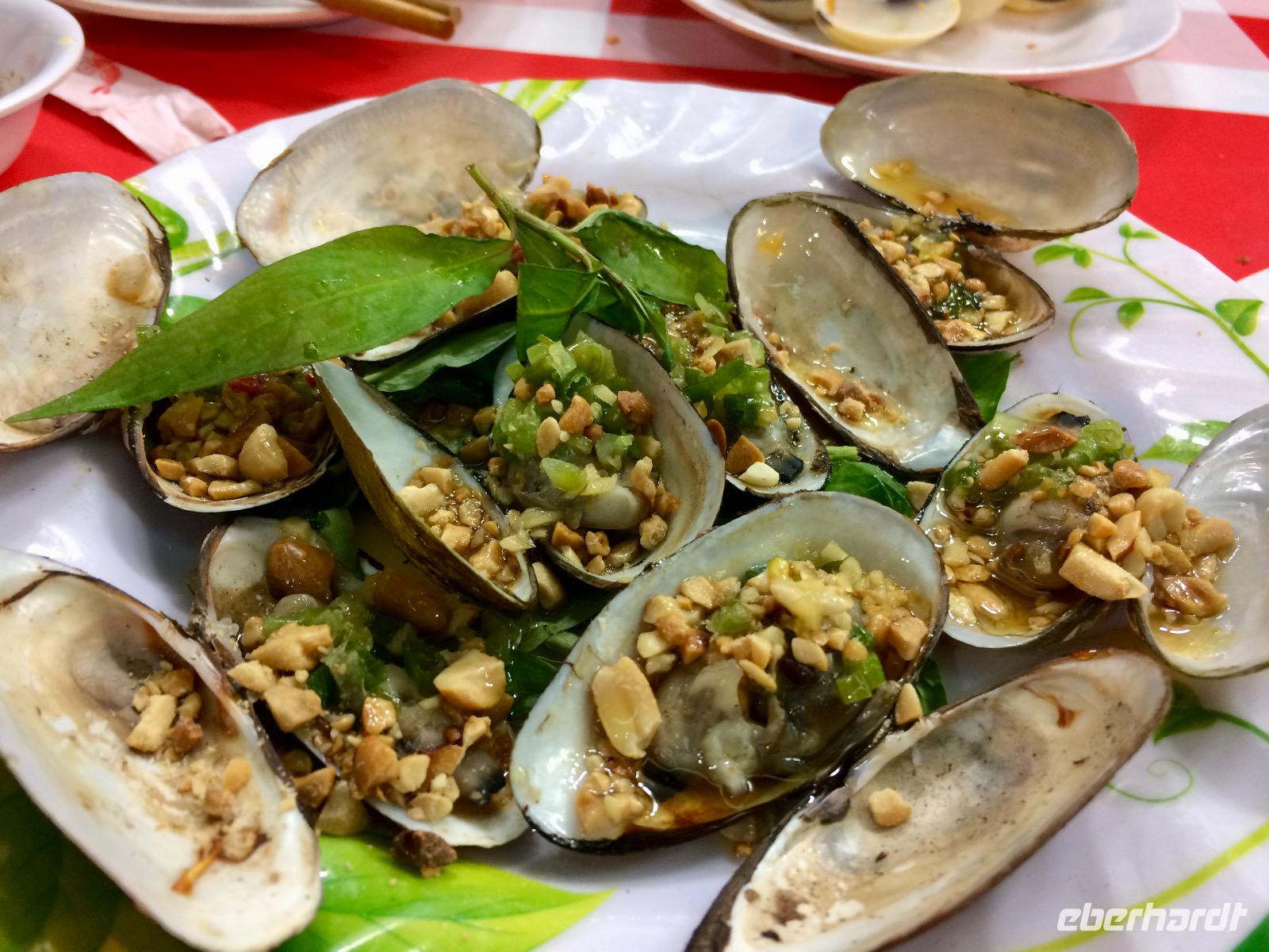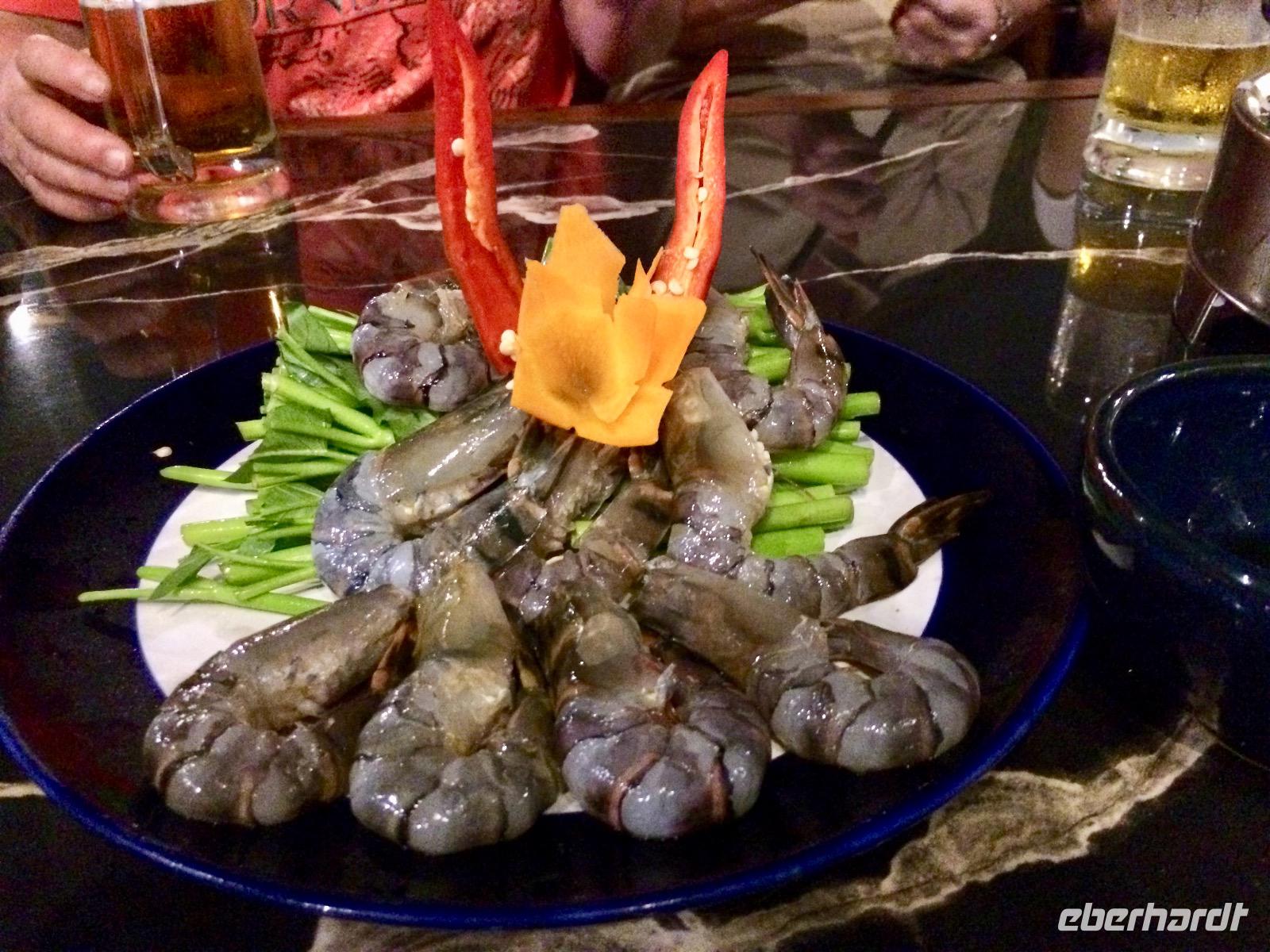 Auf dem Roller durch die Stadt zu fahren wirkt von außen viel hektischer als es eigentlich ist. Und so sitzen wir bequem, wie auf einem Sofa hinter unserem Chauffeur, schießen hunderte Bilder und genießen in vollen Zügen dieses außergewöhnliche Flair! Das Schöne bei dieser Tour ist, dass wir die Möglichkeit haben, diverse Insider der Stadt auf eine spektakuläre Art und Weise kennenzulernen. Die einzelnen Stopps repräsentieren alle ein unterschiedliches Bild des Saigoner Nachtlebens. Es wird zwar am Tisch und auf Stühlen gespeist, doch direkt neben der Straße in einem kleinen Lokal, das sich auf Meeresfrüchte spezialisiert. Auf unserer Speisekarte stehen unter anderem Krabben, Muscheln und Frosch - alles sehr frisch und würzig zubereitet.
