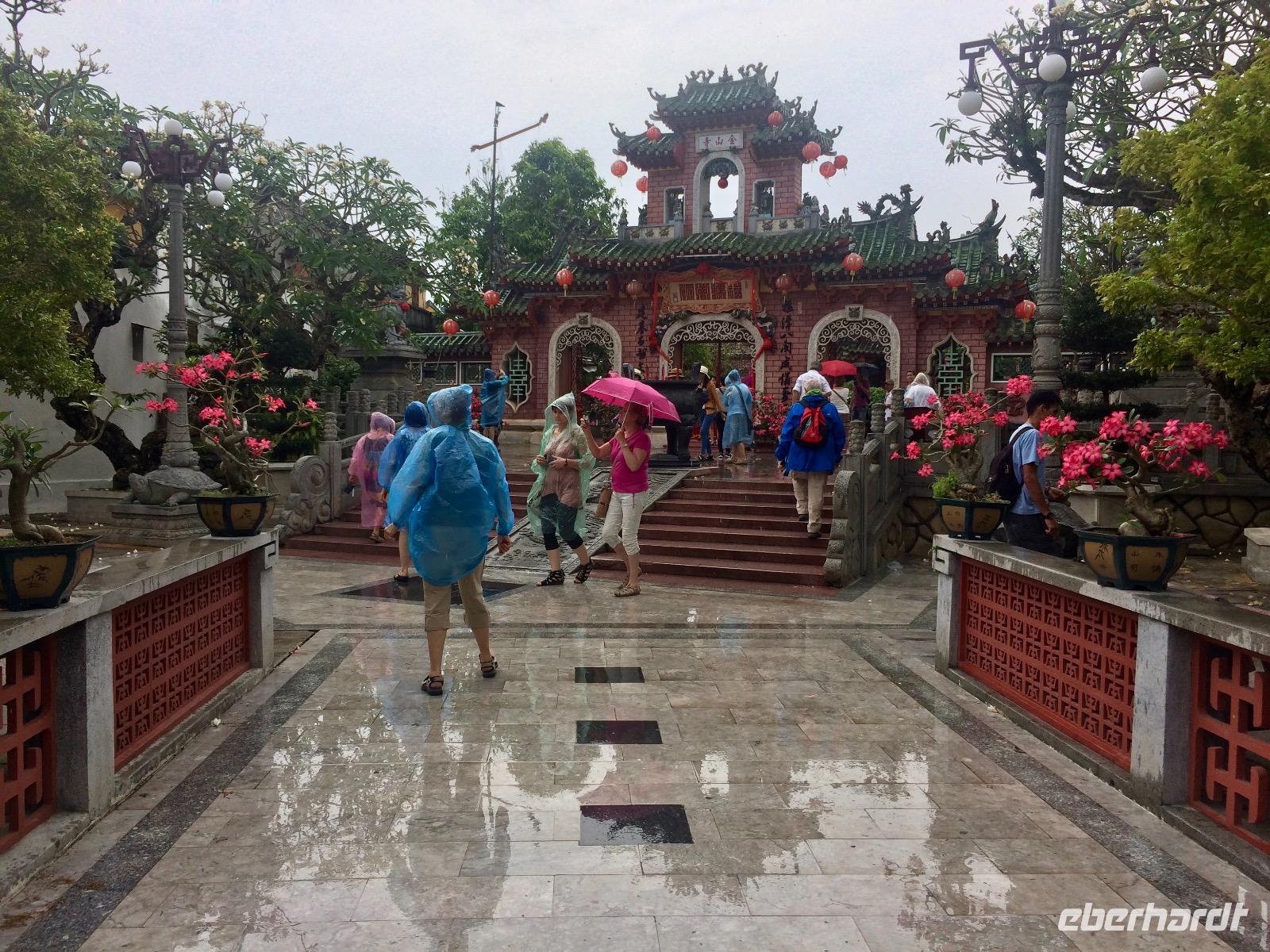 Nächster Stopp: Versammlungshalle der Chinesen aus Kanton. Ursprünglich diente diese Anlage als Treffpunkt der eingewanderten Chinesen und manchmal auch als religiöses Zentrum zur Verehrung der Meeresgöttin. Im Inneren steigt uns sofort Weihrauchduft in die Nasen. Viele Räucherspiralen mit Wunschzetteln hängen an der Decke der Pagode. Man glaubt, dass der Weihrauch die Wünsche hinauf zur Himmelsgöttin trägt und so in Erfüllung gehen.