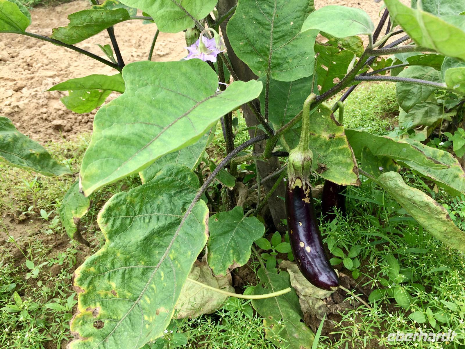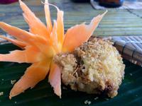 Unser Restaurant steht mitten auf grünen Reisfeldern, abseits jeglichem Städtelärm. Ach wie wundervoll! Gut gelaunt stellt uns der Chefkoch Moringa-Salat sowie gefüllte Auberginen a la tempura vor. Wir schnippeln fleissig mit, rollen Tomatenrosen und schauen der neuen Auszubildenden beim Schnitzen von Blümchen aus Karotte über die Schulter. Jürgen kribbelt es under den Fingern und probiert es ebenfalls. Beifall für sein Schaffen!