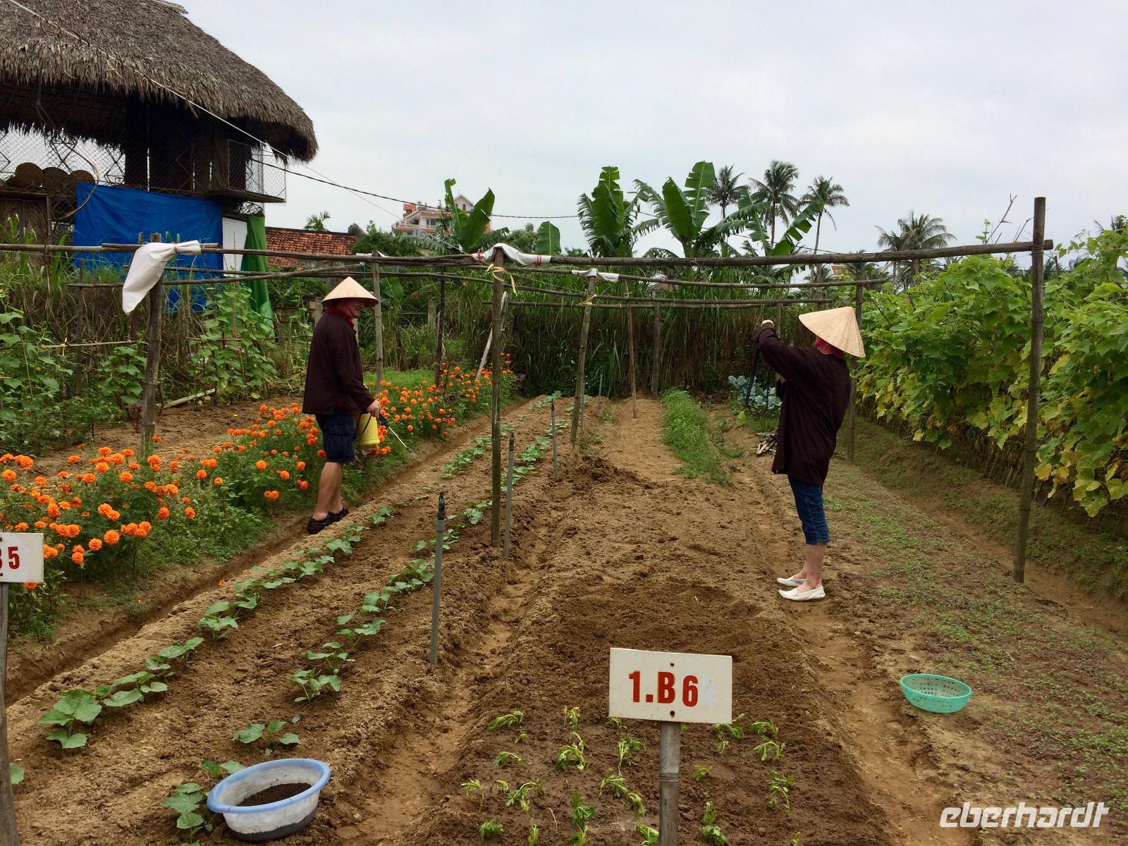 Am Freizeittag lassen wir es uns so richtig gut gehen. Ausgeschlafen, in aller Ruhe gefrühstückt genießen wir die Ruhepause nach den zahlreichen Erlebnissen. Bei Sonnenschein und angenehmen 25 Grad fahren viele mit dem Fahrrad zum Strand. Manch einer muss doch auf Taxi umsteigen, wenn die Hollandfahrräder nicht mehr wollen. Bei schönem Meeresrauschen lassen wir die Seele baumeln und entspannen am feinen Sandstrand. Viele von uns sind dennoch fleißig. Nach dem radeln durch den Verkehrswirrwarr gelangen wir zu einem Gemüsegarten. Bauer Chuong stellt uns mit Stolz den organischen Garten vor, in dem 10 Familien zusammen arbeiten. Ein paar Tomaten werden vernascht und Sojabohnenwasser getrunken, aber auch Wissenswertes für unseren eigenen Strebergarten nehmen wir sogar mit. Die Bienchen und Ameisen unter uns setzen Kegelhut auf, packen Schaufel an oder setzen Setzlinge ins Gemüsebeet.