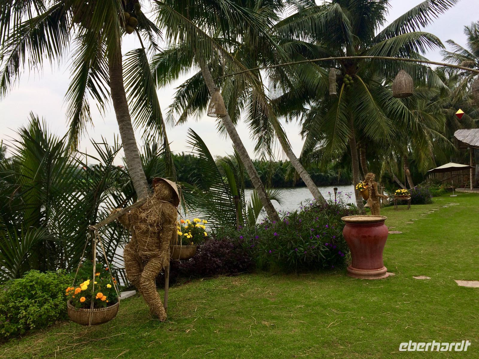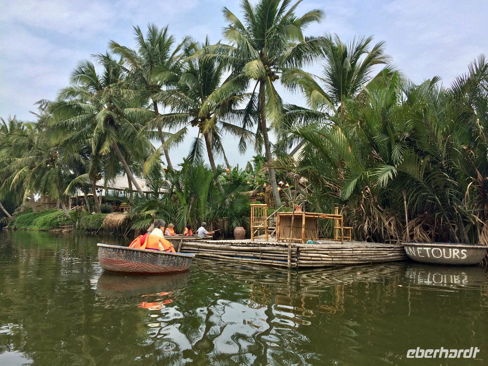 Nun haben wir genug geackert. Wir steigen über eine Bambus-Affenhängebrücke in kleine runde Boote. Auf dem Coco-Fluss paddeln wir entlang Wasserpalmen und einem kleinen Entenschwarm zum Restaurant. Das paddeln mit den runden Booten ist zu zwei nicht schwer, allein aber um so schwieriger, sich nicht nur im Kreis zu drehen. Wissen Sie noch, warum es runde Boote in Vietnam gibt?