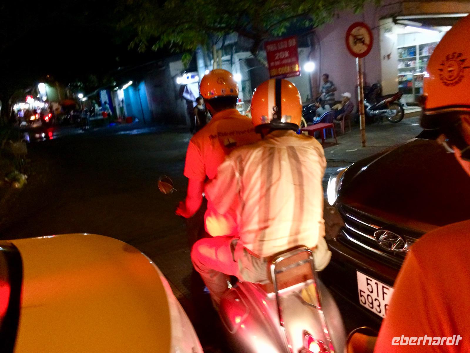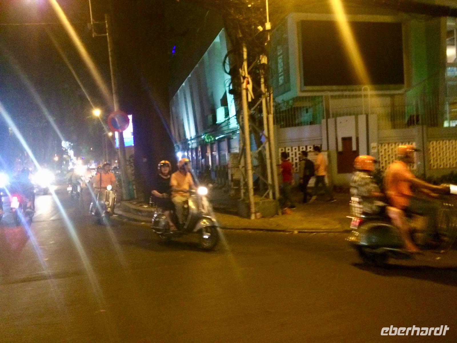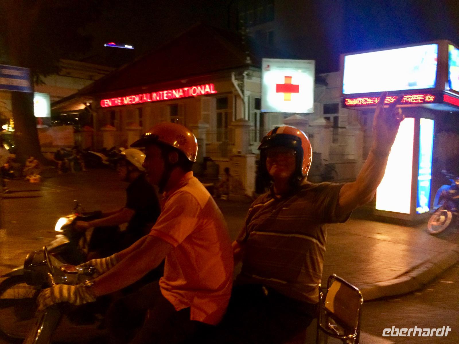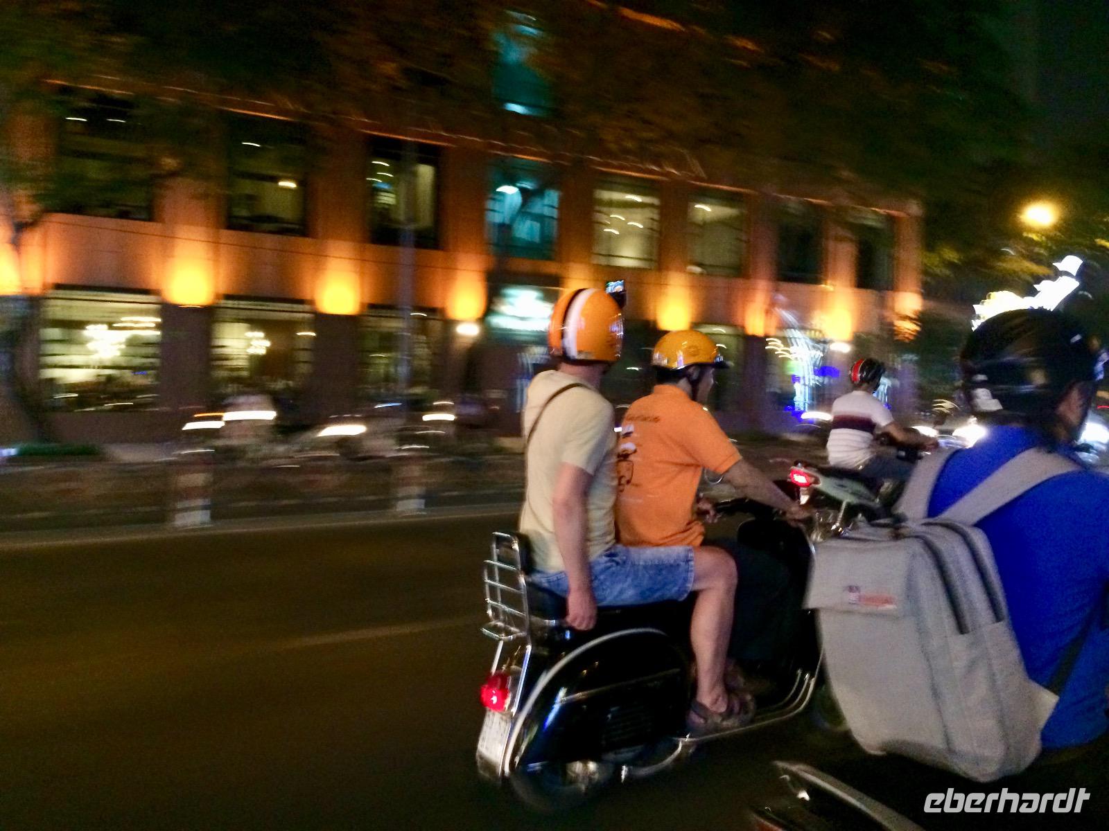 Wir düsen wieder auf unseren Vespas durch die Nacht und bewundern unterwegs die wundervoll beleuchtete City mit ihren beeindruckenden Wolkenkratzern. Für einen Moment vergessen wir, dass wir in Vietnam sind, bis uns das Hupen des nebenfahrenden Mopeds wieder zurück holt. Naja, wir haben uns ohnehin an das etwas andere Verkehrsgeschehen gewöhnt, das allgegenwärtige Hupen ist keine Nötigung, sondern nur Warnung „Achtung, ich komme" und man arrangiert sich, ohne auf sein Recht zu bestehen. Kleine Kinder dürfen diese Aufgabe von Mutti oder Vati während der Mitfahrt auf dem Moped übernehmen und haben eine helle Freude dabei. Es gibt keine bösen Minen, alles ist im Fluss. Oh man, das Gefühl auf dieser Vespa ist etwas ganz Besonderes - man fühlt sich frei, heiter und wild!