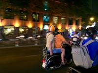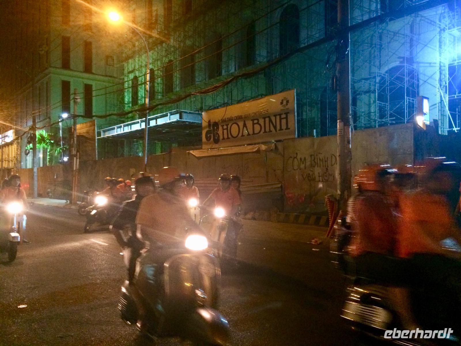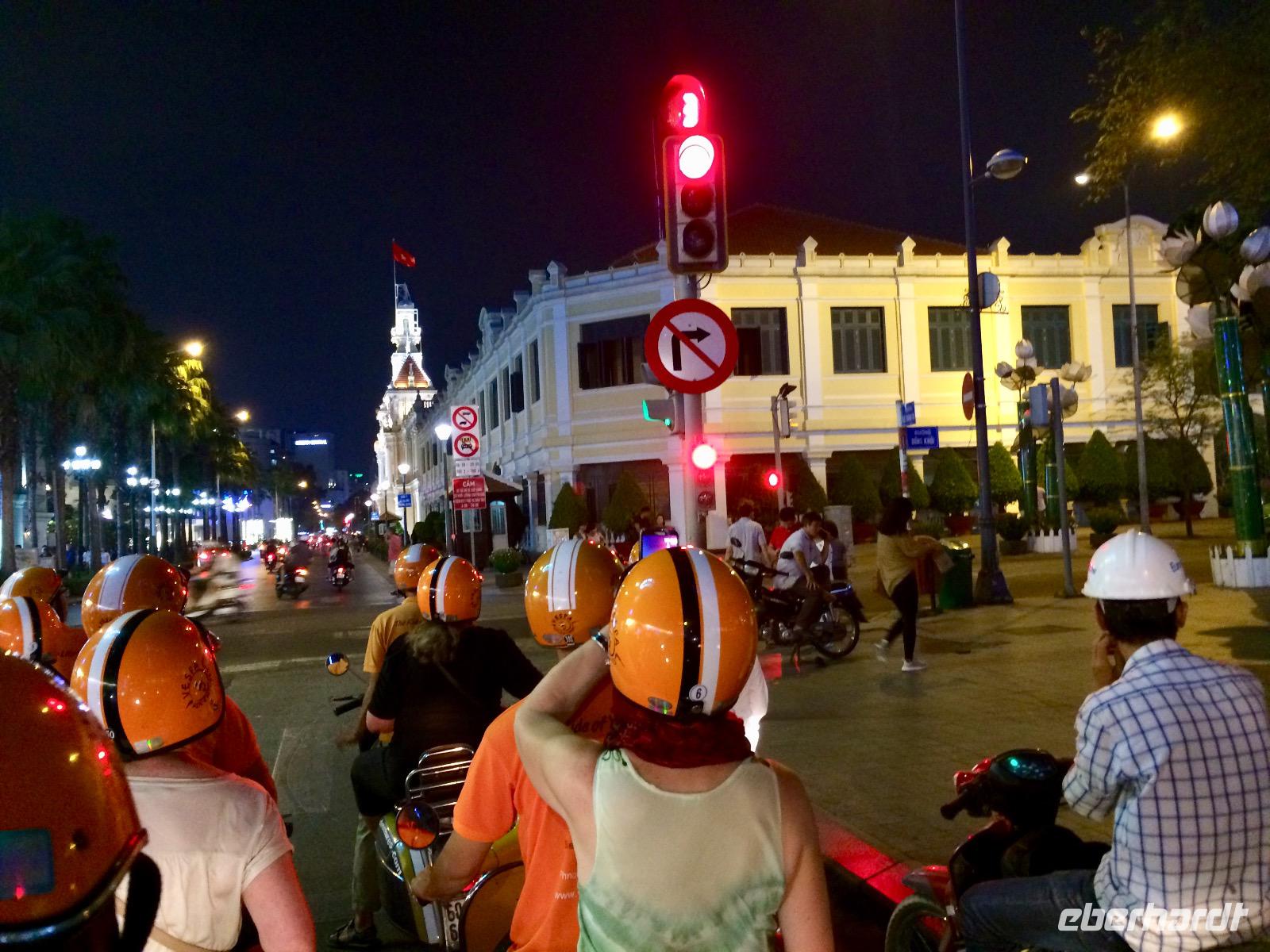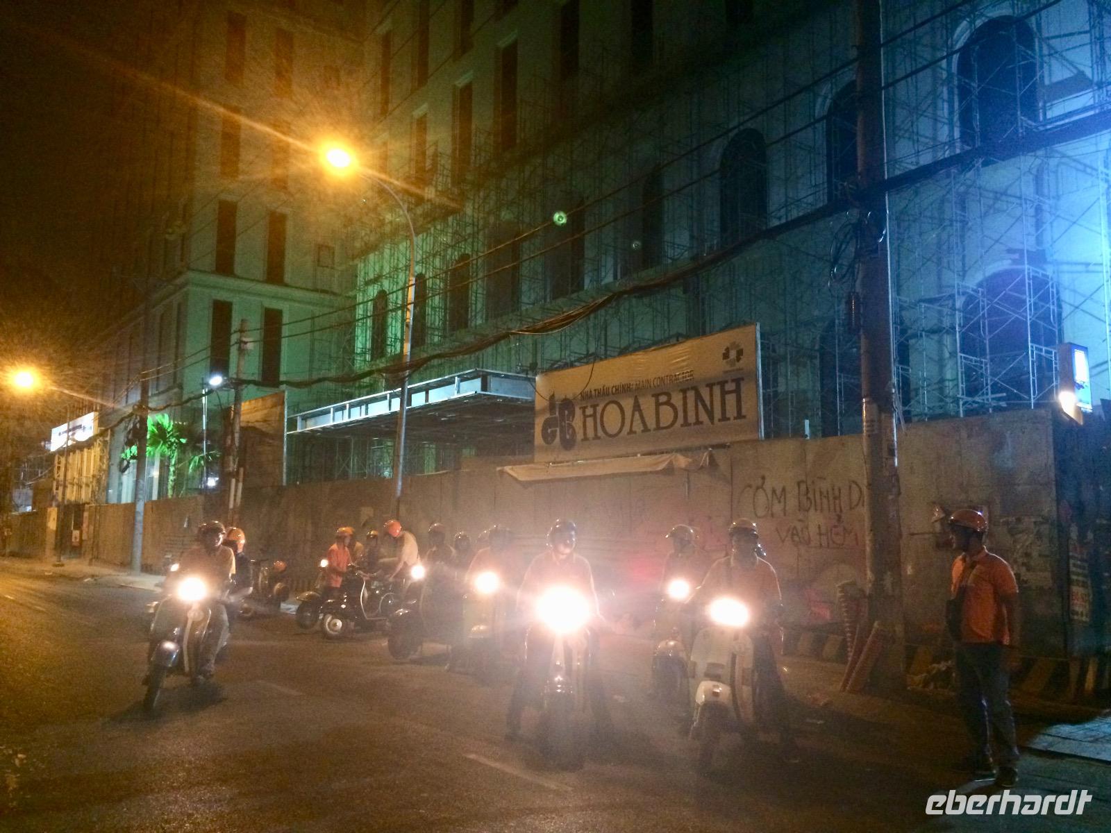 Wir düsen wieder auf unseren Vespas durch die Nacht und bewundern unterwegs die wundervoll beleuchtete City mit ihren beeindruckenden Wolkenkratzern. Für einen Moment vergessen wir, dass wir in Vietnam sind, bis uns das Hupen des nebenfahrenden Mopeds wieder zurück holt. Naja, wir haben uns ohnehin an das etwas andere Verkehrsgeschehen gewöhnt, das allgegenwärtige Hupen ist keine Nötigung, sondern nur Warnung „Achtung, ich komme" und man arrangiert sich, ohne auf sein Recht zu bestehen. Kleine Kinder dürfen diese Aufgabe von Mutti oder Vati während der Mitfahrt auf dem Moped übernehmen und haben eine helle Freude dabei. Es gibt keine bösen Minen, alles ist im Fluss. Oh man, das Gefühl auf dieser Vespa ist etwas ganz Besonderes - man fühlt sich frei, heiter und wild!