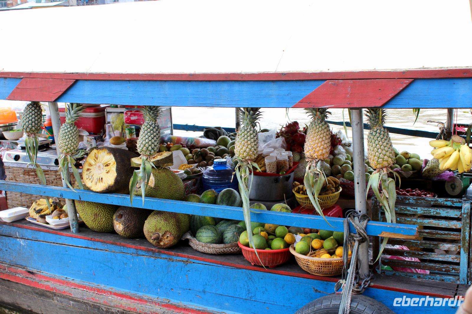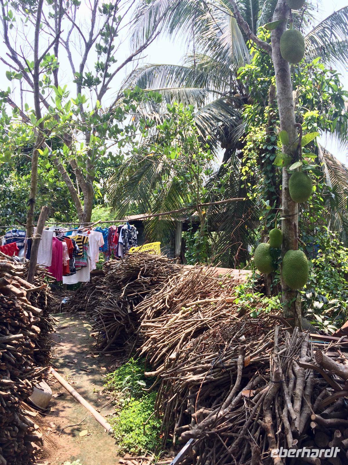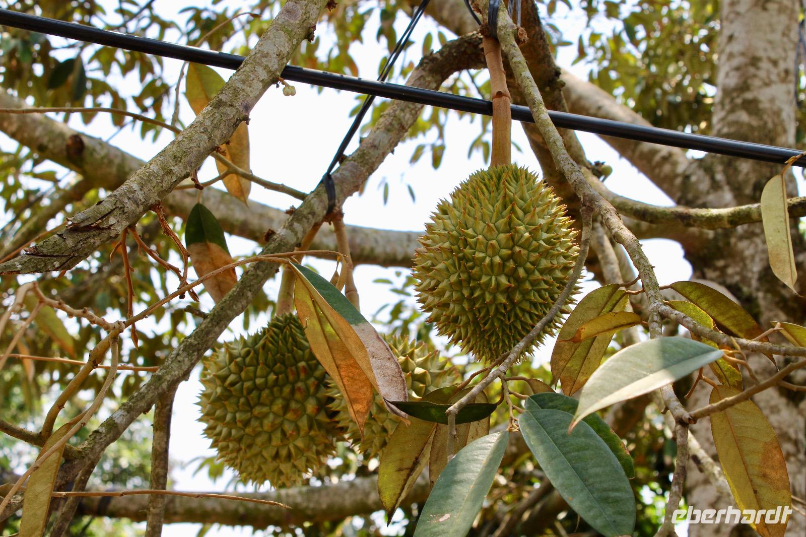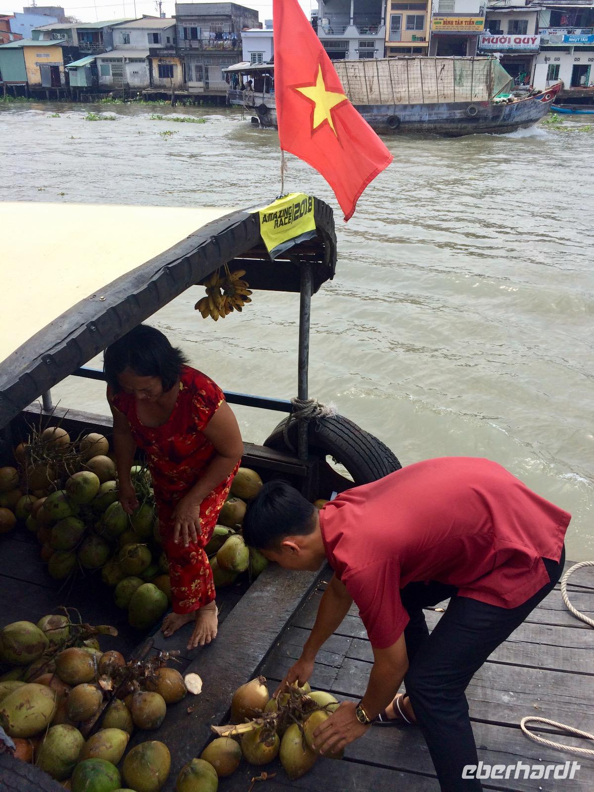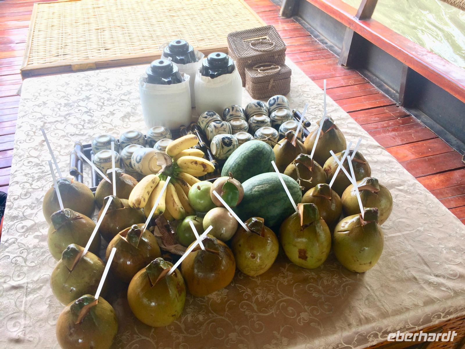 Bei einem Bauern probieren wir die hier angebauten exotischen Früchte wie Guave, süße Ananas und vieles mehr. Die schwere Frucht mit den Stacheln, die an dem Baumstämmen herunterhängt und an eine Waffe erinnert, ist die Jackfrucht. Aus dem Holz der Pflanze werden die Wasserpuppen geschnitzt. Innen duftet sie sehr aromatisch nach Ananas, Apfel und Banane. - Eine wirklich exotische Mischung! Deutlich gefährlicher mit spitzen Stacheln ist ihre Schwester, die Druian. Sie ist die Königin aller Früchte, sagen die Vietnamesen. Die Deutschen nutzen eher den Namen Stinkfrucht. Ungeöffnet geht ein intensiver, unangenehmer Geruch hervor, der an verfaulte Eier erinnert, von ihr aus. Jedoch schmeckt sie ganz besonders, ganz nach seinem eigenen persönlichen empfinden. Was uns allen aber auch besonders gut schmeckt, sind die Kokosnüsse aus dem Mekong-Delta.