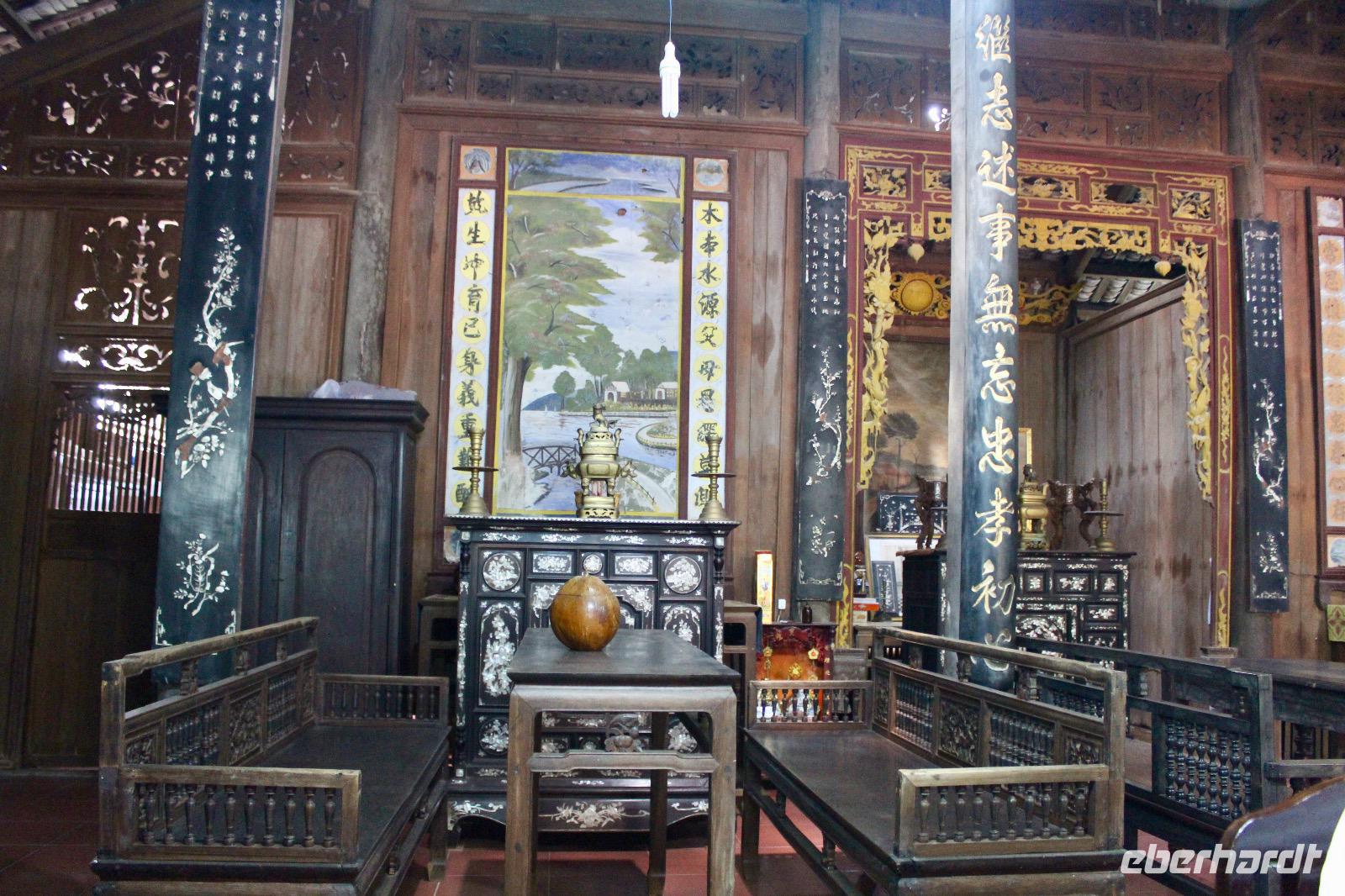 Im über 128 Jahre alten Haus von Herrn Duc An gehen wir in das Wohnzimmer. Die Apotheke und der Hausaltar im Wohnzimmer stehen nach der Überschwemmung im vergangenen November wieder im Trockenen. Aber der Hausbesitzer kennt es schon, das passiert jedes Jahr und man stellt an den Tagen alle Möbel so hoch wie möglich, der Rest ist fast Routine. Der für Hoi An typische Innenhof inmitten des Hauses versorgt die Räumlichkeiten mit Licht und frischer Luft. Der Hausbesitzer zeigt mir das Bild von seinem Opa mit dem Präsidenten Ho Chi Minh und General Vo Nguyen Giap aus dem Jahre 1927, als sie hier in dem Haus die Kommunistische Partei Vietnams gründeten.