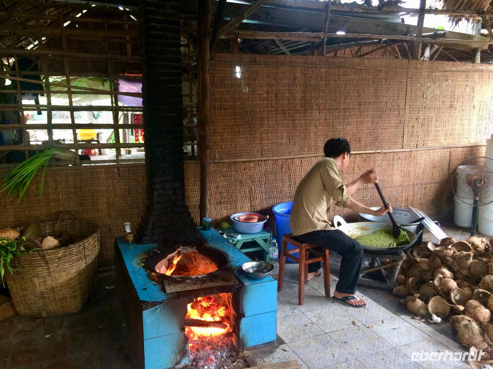 Letzter Stopp ist bei einer Familienfabrik: Kokosnüsse sowie Reis, sind Grundlage für die Bonbonherstellung, die wir gleich beobachten können. Alles ist Handarbeit. Es wird geknetet, gerollt, geschnitten aufgereiht und akribisch einzeln eingewickelt. Die Außenhülle mit lackiertem Bonbonpapier, die innere aber kann man mit essen, sie zergeht im Munde. Der Popreis oder das gegrillte Reispapier haben uns ziemlich gut geschmeckt *schwärm*. Es geht zurück auf das Boot.