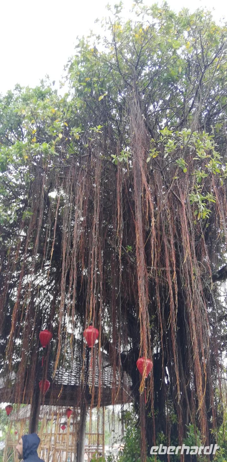 Leider wird Hoi an zwei bis dreimal im Jahr überschwemmt, weshalb viele der Häuser aus Beton oder dem berühmten teuren, aber absolut robusten Eisenholz gebaut wurden, was jegliches Wasser mühelos abhält. Die Bewohner sind darauf aber immer schon gut eingerichtet, was wir im Haus eines chinesischen Kaufmanns der Stadt sehen. Dieser hat einen Haken mit Flaschenzug im oberen Teil des Gebäudes angebracht, um Waren mühelos hinauf zu transportieren. Das Haus ist in Arbeitsbereich, Wohnbereich und „Empfangsbereich" unterteilt und lässt uns in alte Zeiten abschweifen. Das letzte Monument, was wir in Hoi An besichtigen, ist der chinesische Tempel Phú Cien, der einen von fünf Stück darstellt, die jeweils eine Provinz in China symbolisieren. Hier riecht es sehr stark nach Räucherstäbchen - doch wir können erst auf den zweiten Blick erkennen, dass die riesigen Spiralen in der Mitte des Raumes diesen Duft erzeugen. Sie stehen für gute Wünsche und brennen laut Chiens Aussage einen ganzen Monat! Da es noch wie aus Gießkannen regnet, flüchten wir uns im Anschluss in ein Restaurant und besprechen den weiteren Tagesablauf im Trockenen. Viele wollen erst einmal zurück ins Resort, die nassen Sachen auswringen und Massage-angebote im Hotel nutzen. Ein Paar verweilen noch ein wenig in der Stadt zum gemütlichen Bummel in kleinen Boutiquen fern der überfluteten Straßen. Am Abend treffen wir uns wieder und fahren mit dem hoteleigenen Shuttle noch einmal in die Stadt - wir haben jedoch diesmal unsere Schuhwahl überdacht - Flip-Flops und Badeschuhe stehen auf dem Programm! Ein Handtuch dabei und der Regenschirm hält das Schlimmste von oben ab - wo ist das nächste Gummiboot bitte? Unser Abendessen nehmen wir in einem ruhigen, kleinen Restaurant im Hinterhof eines Hauskomplexes ein - gemütlich unter Bäumen und einem Dach (!)mit einem kleinen Teich in der Mitte. In diesem Restaurant haben wir wohl die schmackhaftesten Desserts der ganzen Reise gegessen! Ich erinnere doch gern an unseren Mango-Crumble? Oder den Banana-Cheesecake? Nach einem köstlichen Mahl begeben wir uns mit dem Hotelshuttle zurück und verbringen unsere zweite Nacht in der Stadt der Lampions.