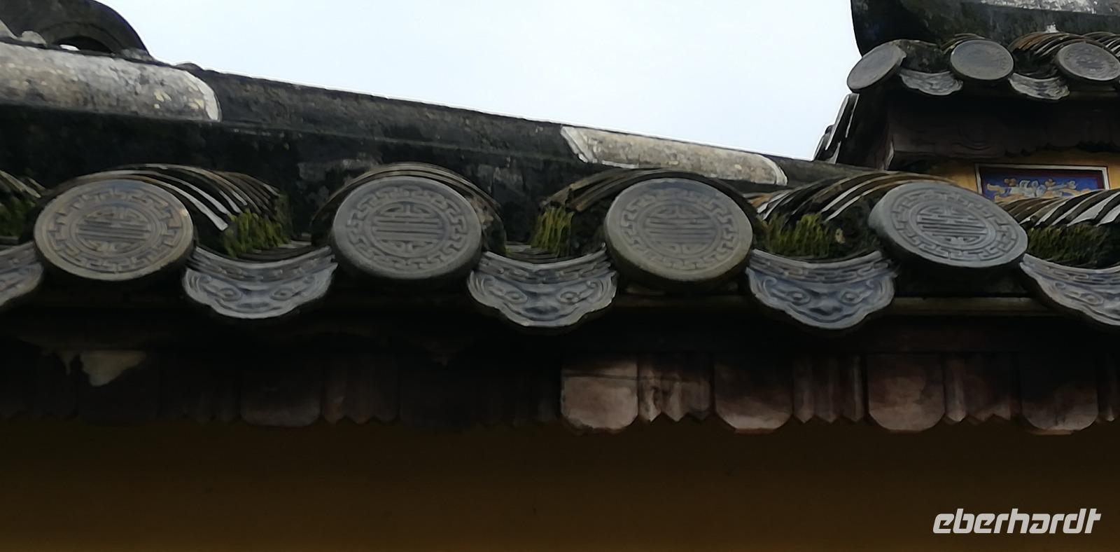 Wir beginnen den Tag mit der Besichtigung des Königspalastes von Hue. Den Parfümfluss passieren wir auf unserem Weg - er erhielt seinen Namen von einer Blüte, die mit den Hochwassern in der Region hinab gespült wurde und dabei einen aromatischen Duft mit sich trug. Die Zitadelle von Hue ist eine riesige 520 Hektar große Anlage, welche im Zentrum der Stadt gelegen ist, umgeben von einer gewaltigen Mauer - unser Reiseleiter Chien erklärt uns sie hätte eine Dicke von 21m! Anfang des 19. Jahrhunderts wurde sie vom damaligen Kaiser in Auftrag gegeben und 30 Jahre später fertig gestellt. Am Eingang des äußeren Kreises sind einige der 10 Tonnen schweren Kanonen zur Verteidigung aus den ehemals 24 Festungs-anlagen ausgestellt.