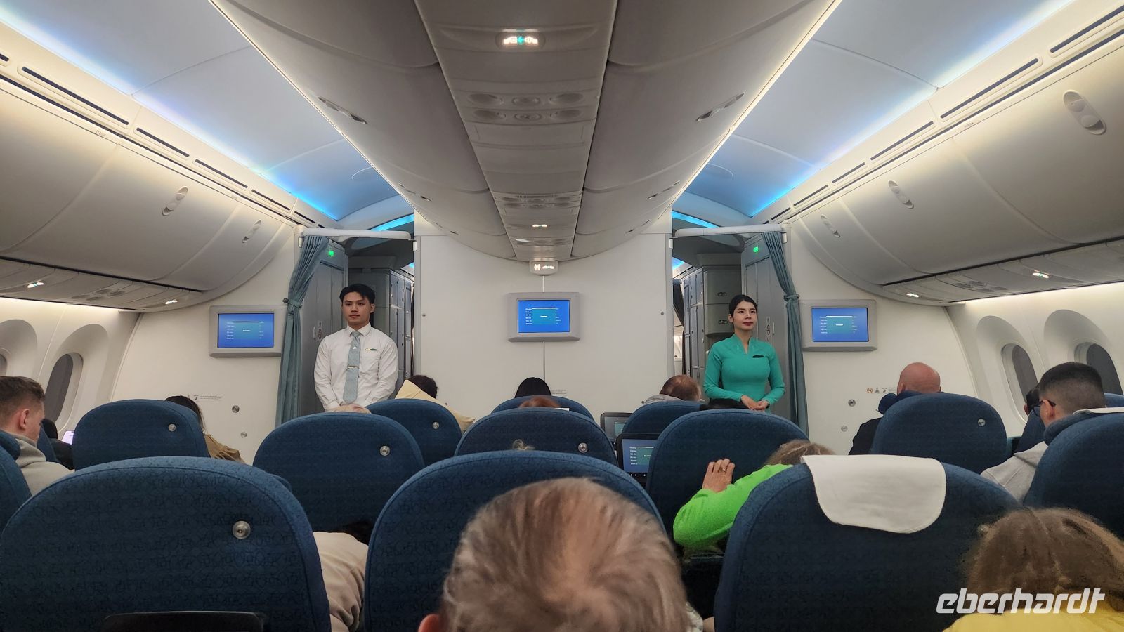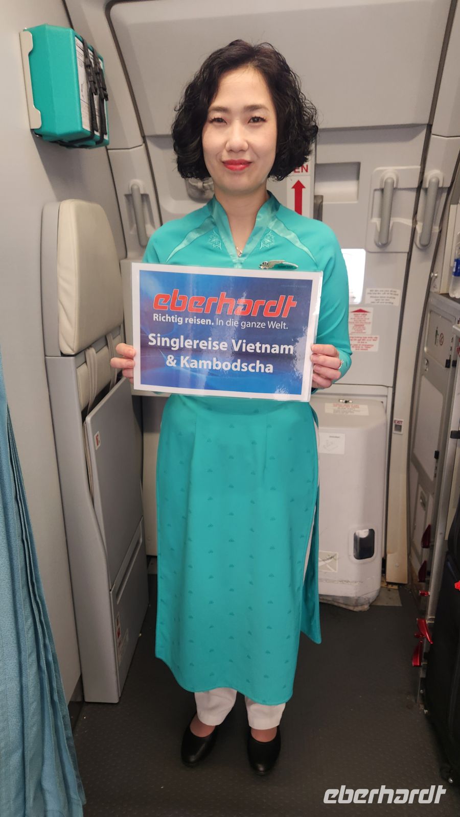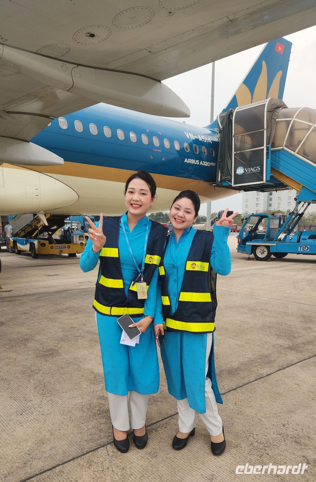 Pünktlich um 13:55 Uhr startet unser Flug mit Vietnam Airlines. Schon beim Einsteigen sind wir beeindruckt: Die Flugbegleiterinnen tragen die traditionelle Tracht, das Ao Dai. Das sorgt gleich für eine besondere Atmosphäre und stimmt uns auf unser Reiseziel ein.