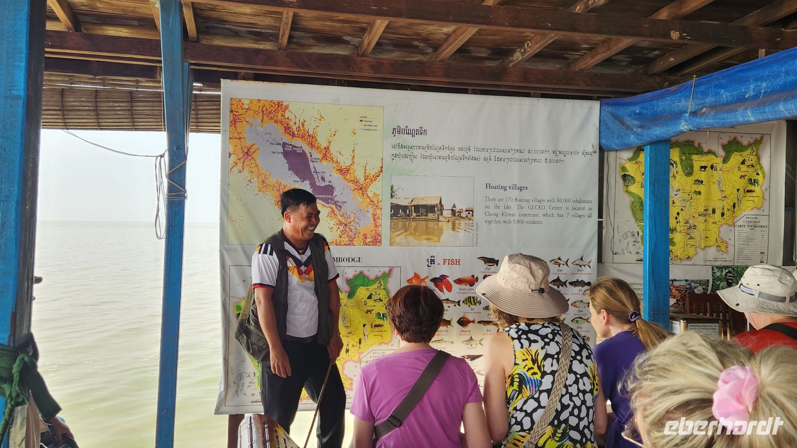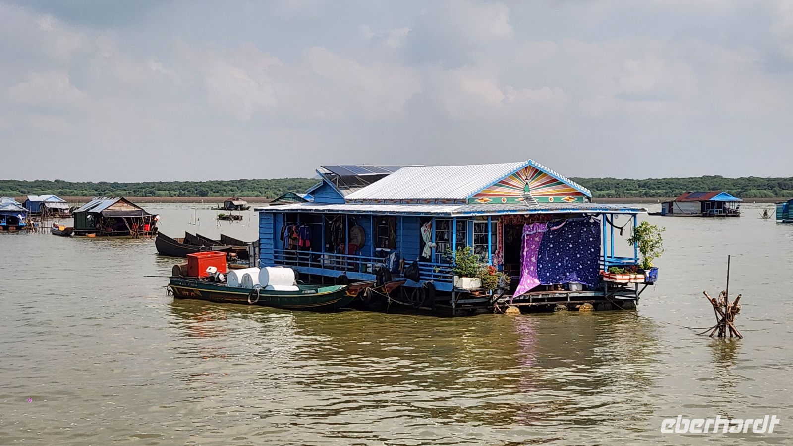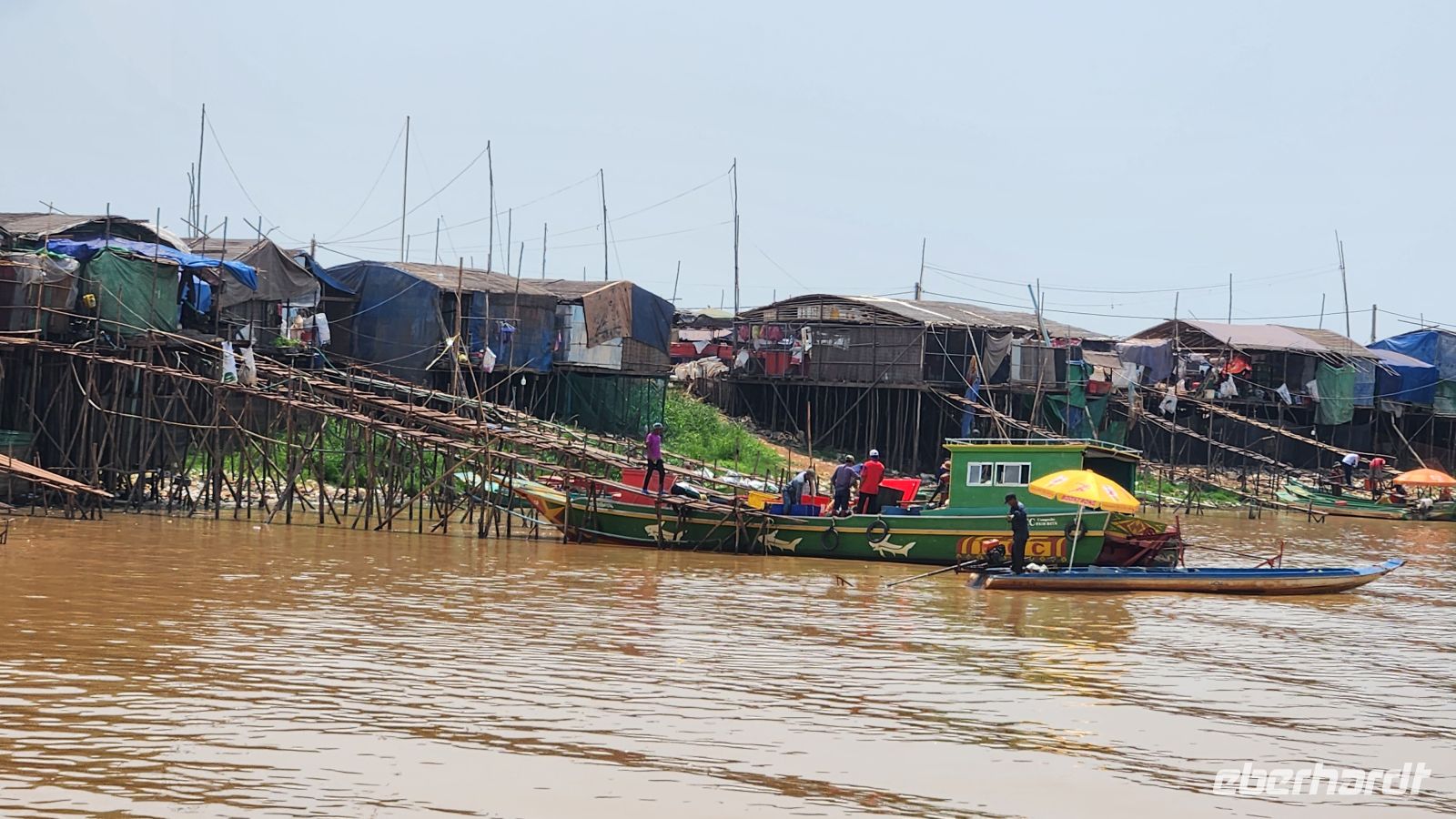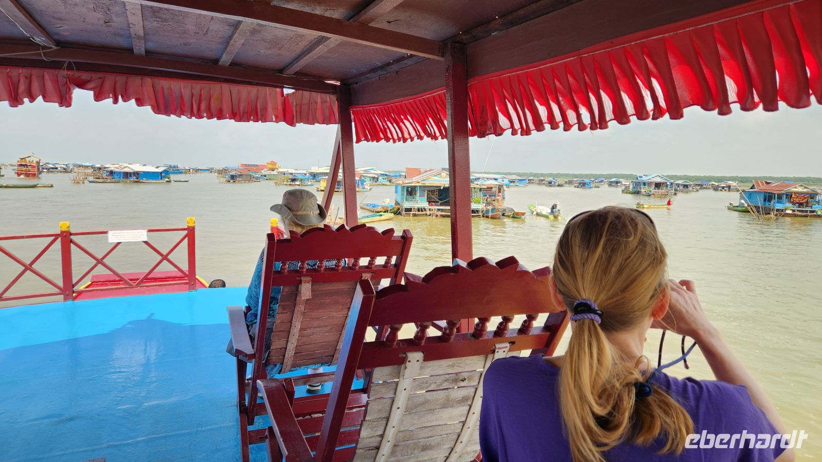 Am Morgen fahren wir zum nahegelegenen Tonle-Sap-See. Dieser ist der größte See Südostasiens und ein ganz besonderes Naturphänomen. Je nach Jahreszeit verändert er seine Größe stark, weil er durch den Mekong-Fluss gespeist wird. In der Regenzeit wächst er auf ein Vielfaches an und überschwemmt große Gebiete.