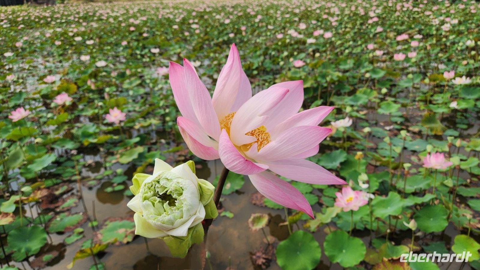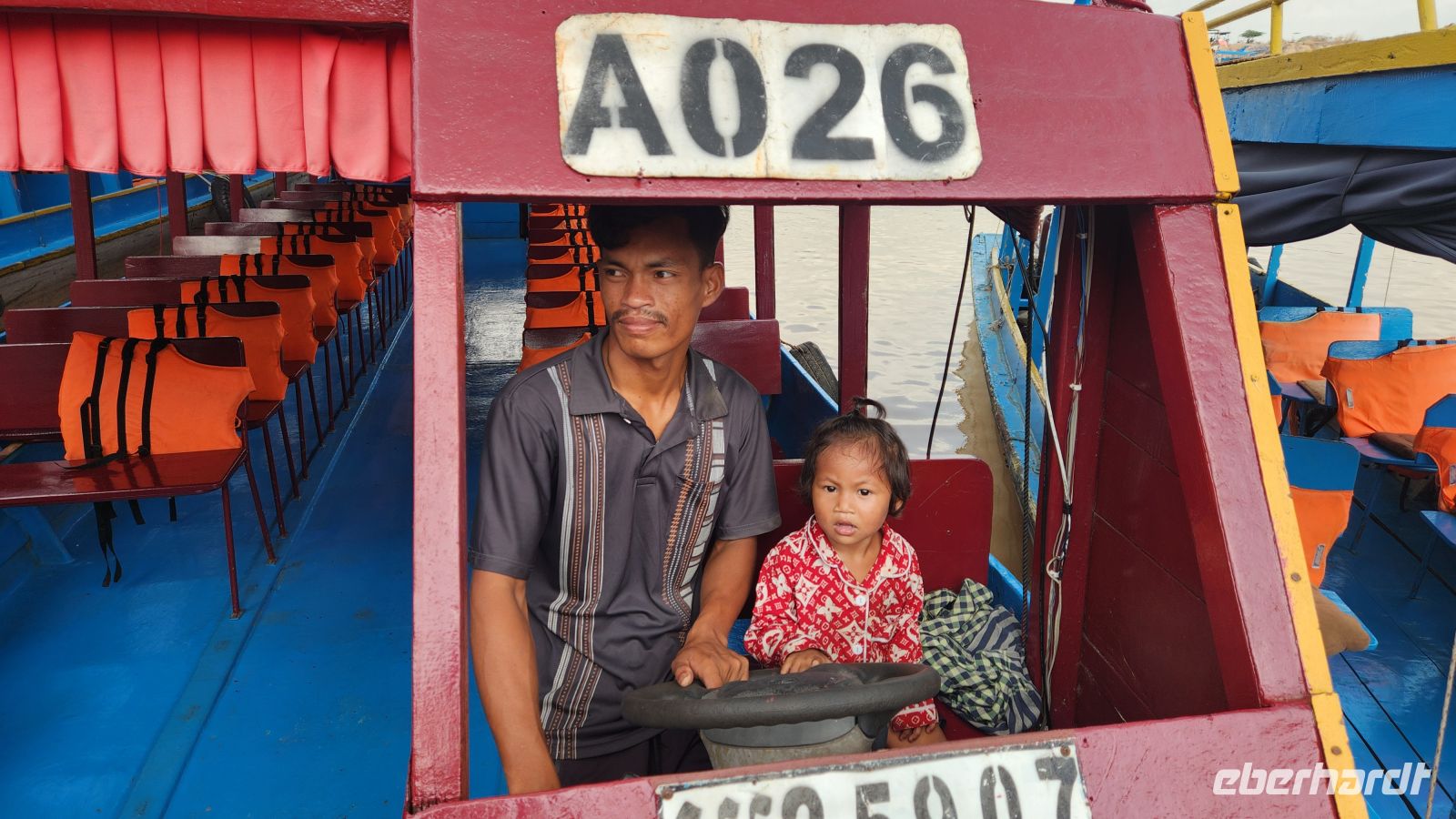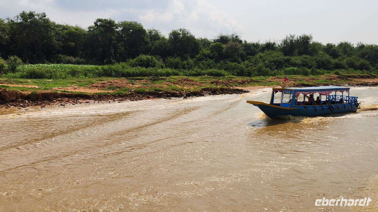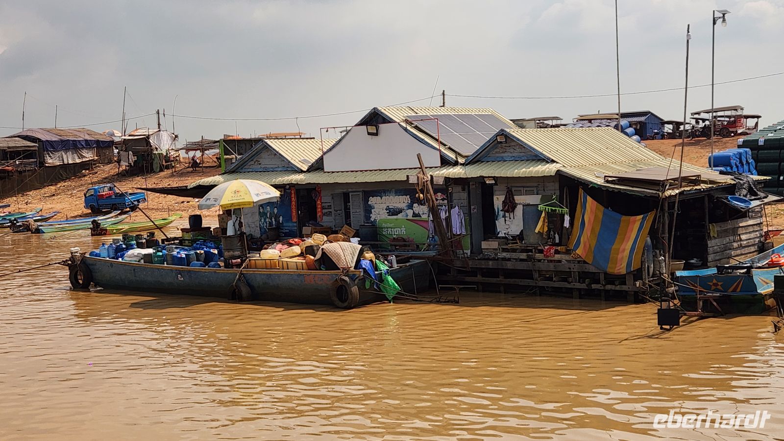 Am Morgen fahren wir zum nahegelegenen Tonle-Sap-See. Dieser ist der größte See Südostasiens und ein ganz besonderes Naturphänomen. Je nach Jahreszeit verändert er seine Größe stark, weil er durch den Mekong-Fluss gespeist wird. In der Regenzeit wächst er auf ein Vielfaches an und überschwemmt große Gebiete.