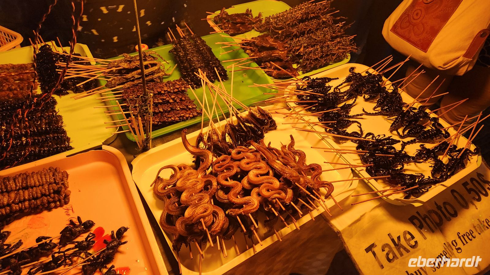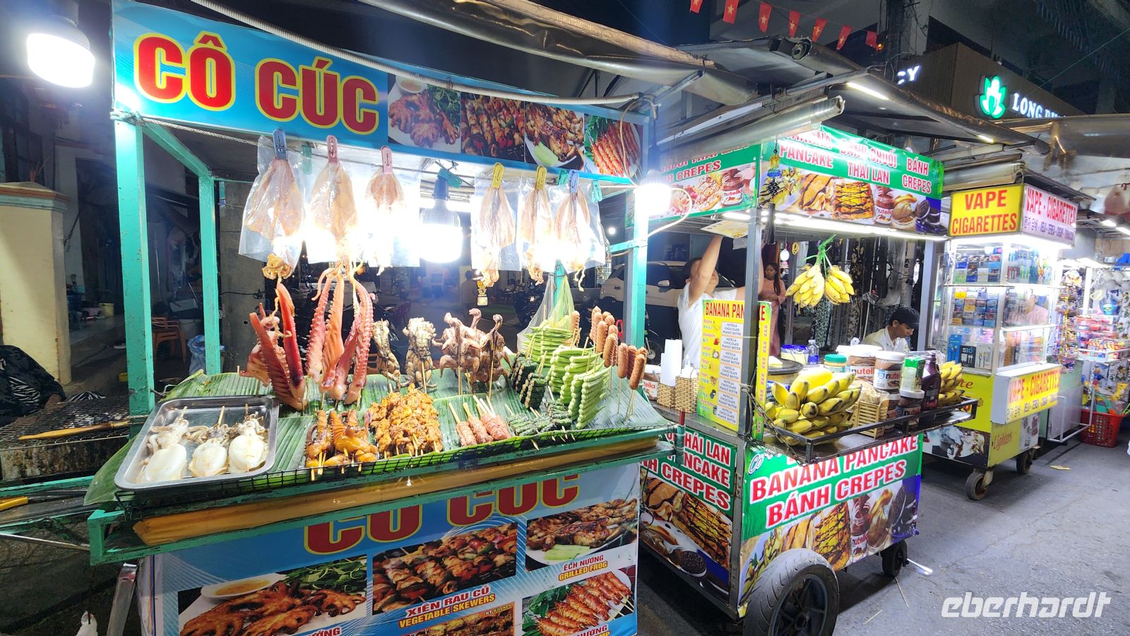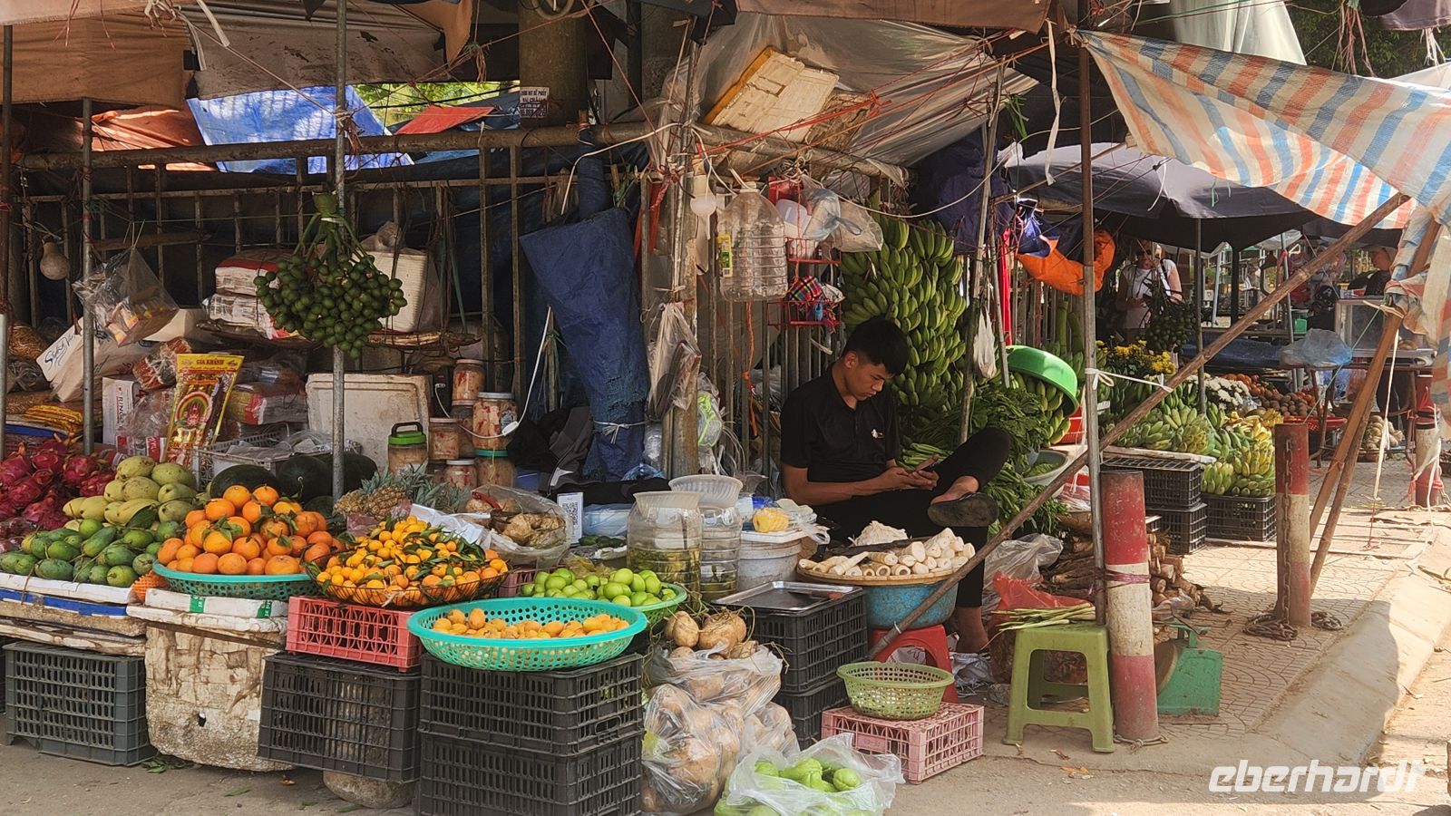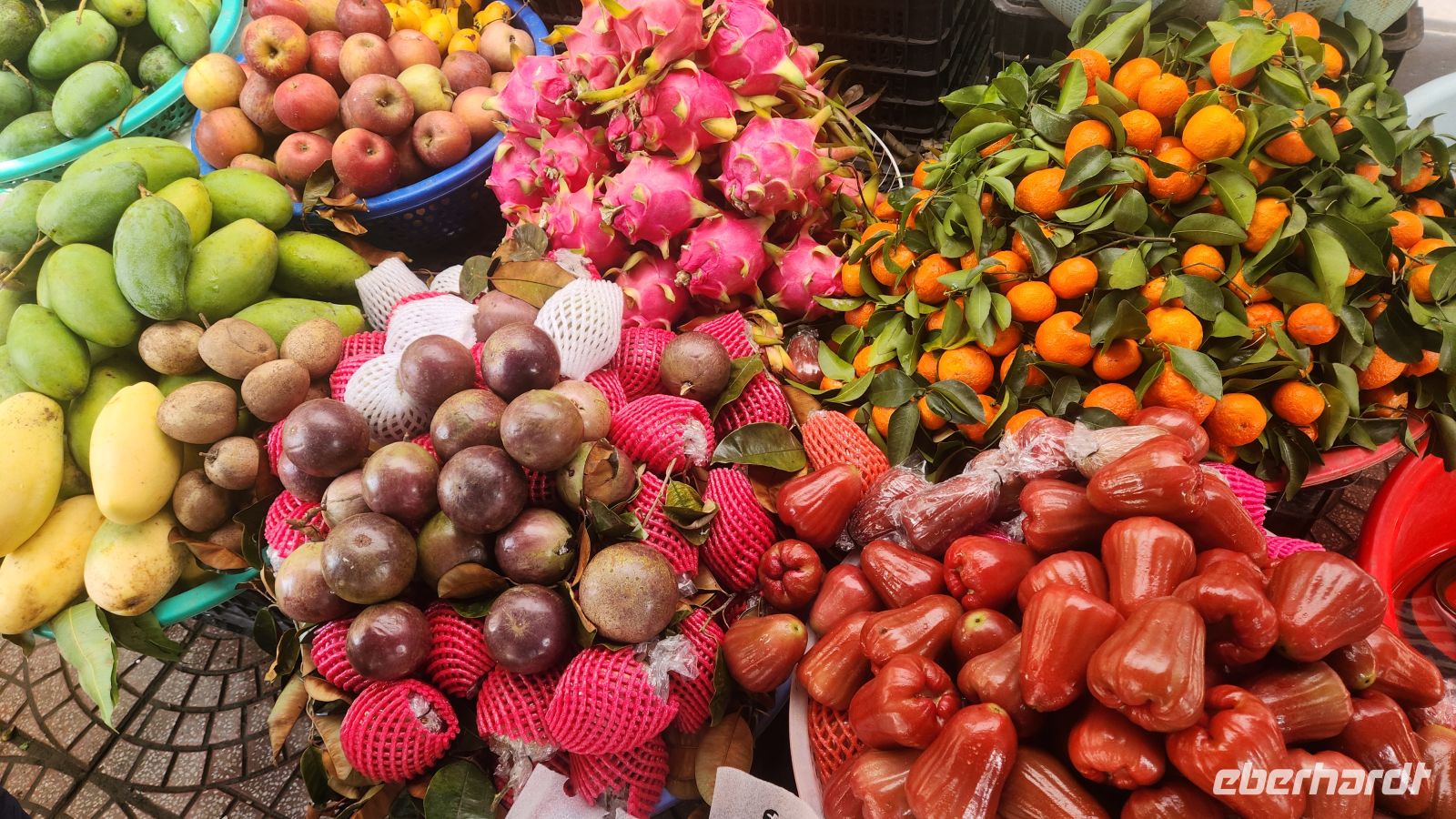 Zwischen all den Ständen gibt es auch frisches Obst in allen Farben und viele kleine Garküchen, aus denen es verführerisch duftet. Noch einmal tauchen wir ein in das lebendige Alltagsleben dieser Stadt und genießen die besondere Atmosphäre.