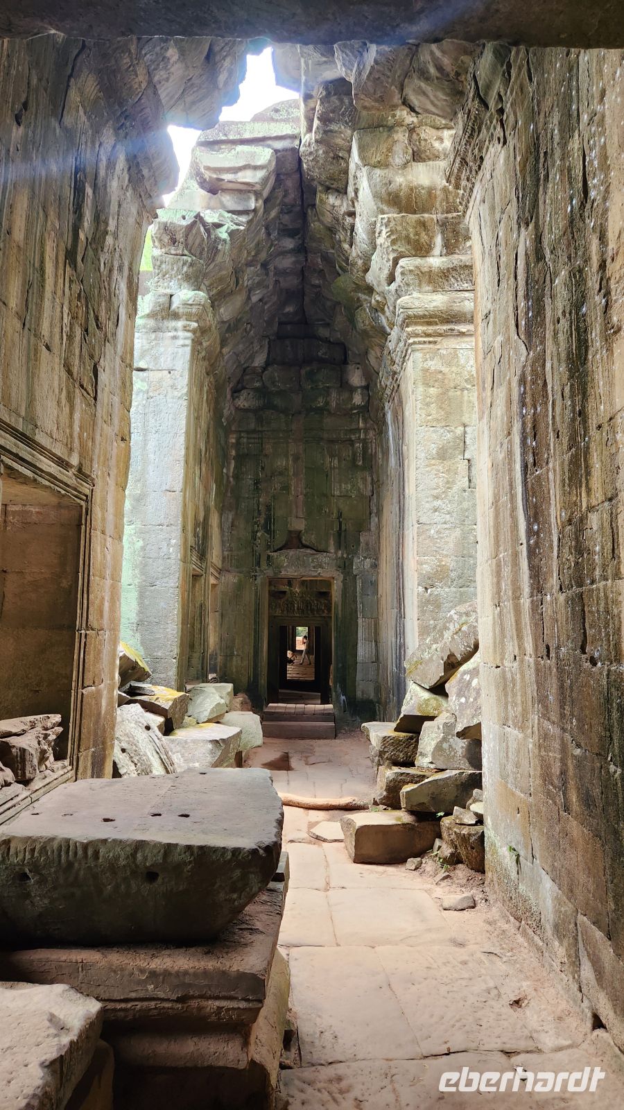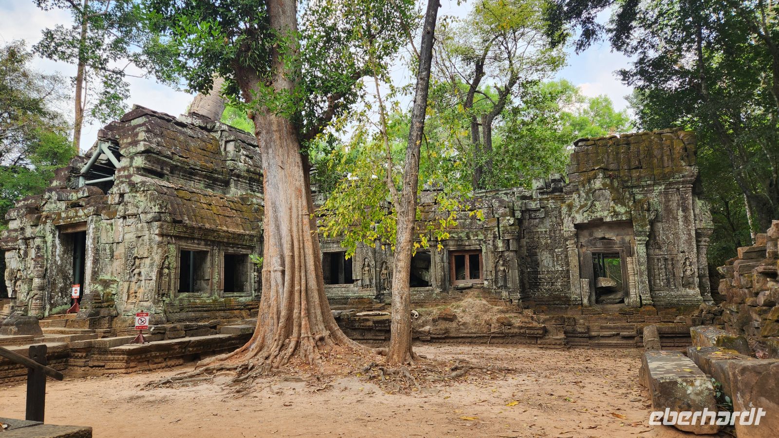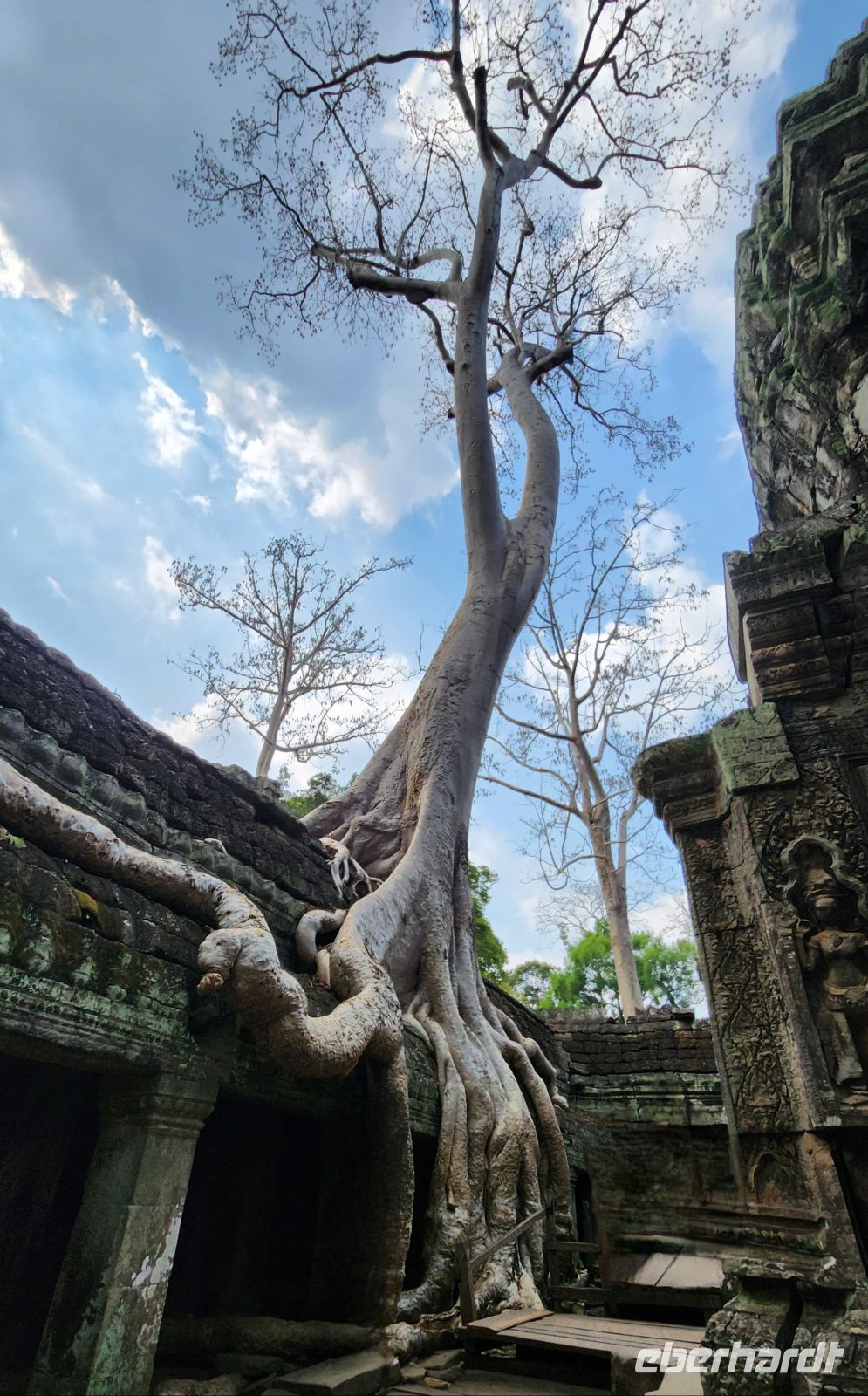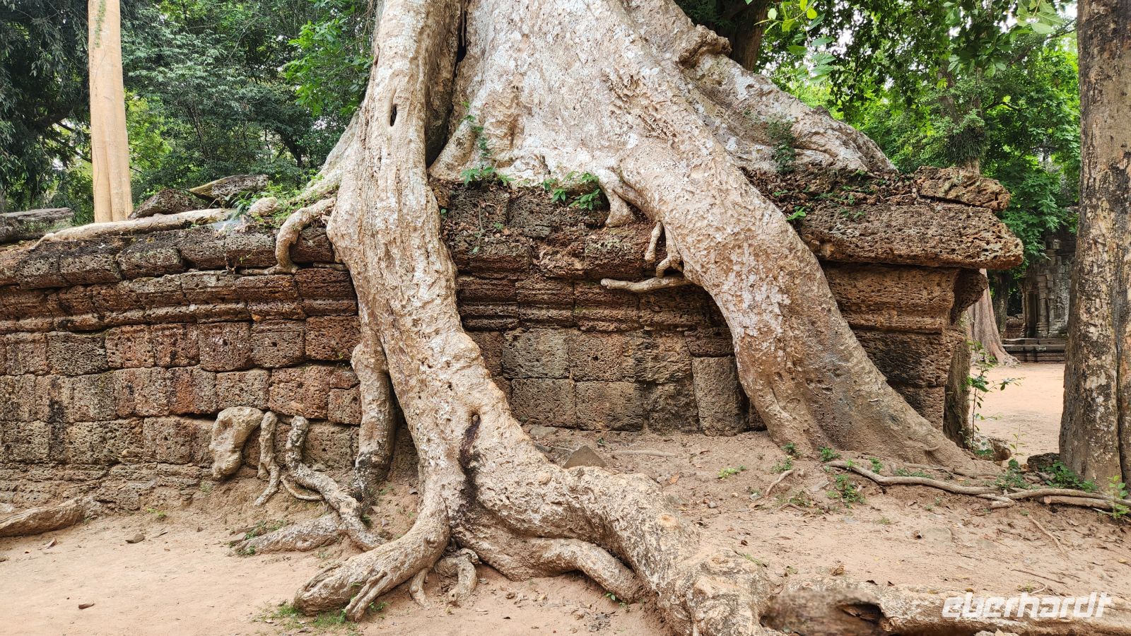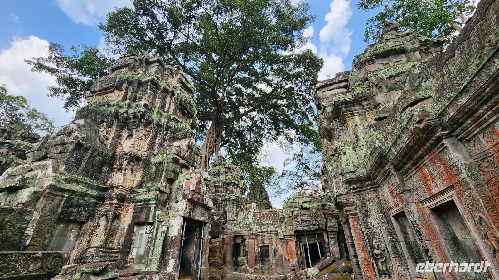 Nach einer kurzen Pause geht es weiter zum Ta Prohm Tempel, auch bekannt als Dschungeltempel. Dieser Ort ist etwas ganz Besonderes: Große Bäume wachsen direkt aus den Mauern, und ihre mächtigen Wurzeln umschlingen die alten Steine. Die Natur holt sich hier langsam alles zurück. Es sieht fast unwirklich aus, wie Tempel und Dschungel miteinander verschmelzen – ein magischer Ort.