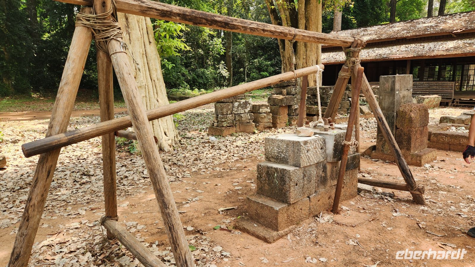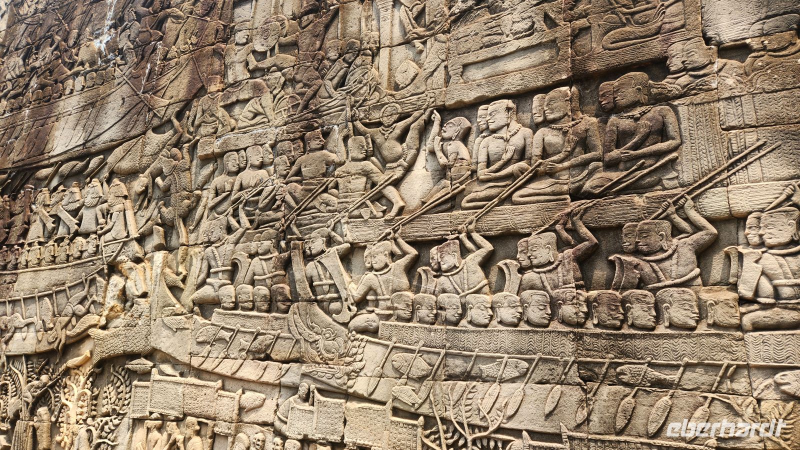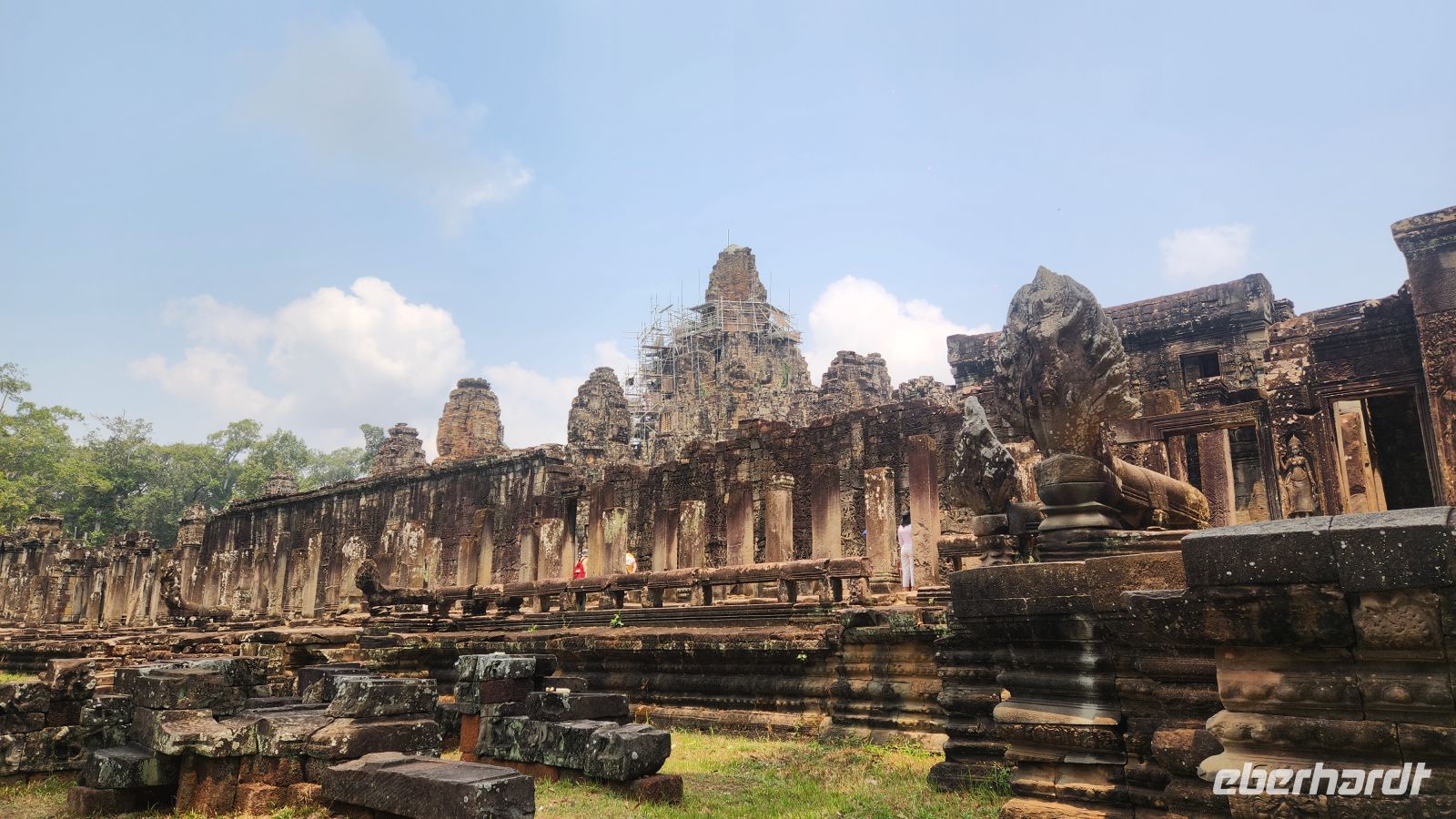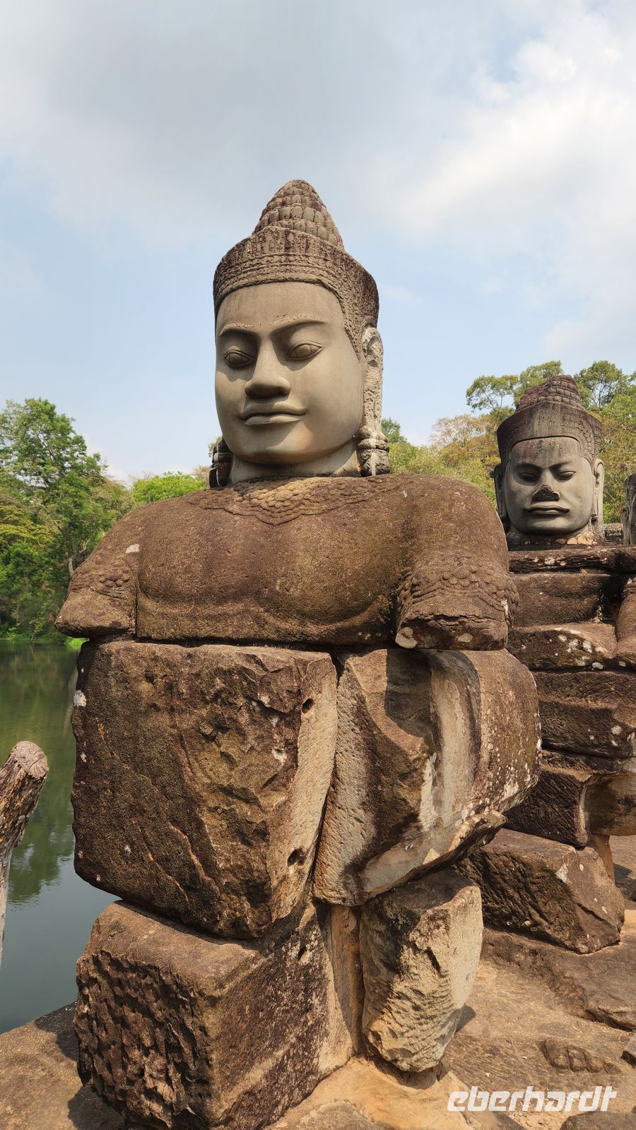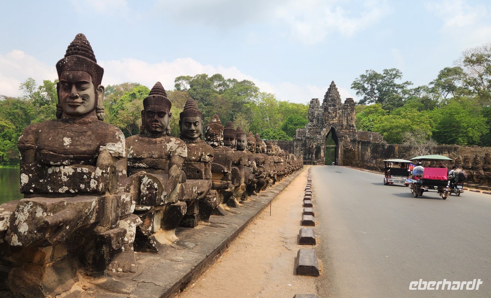 Anschließend fahren wir weiter nach Angkor Thom, einer alten Königsstadt. Wir erreichen sie über eine berühmte Brücke, die von vielen steinernen Figuren gesäumt ist – ein beeindruckender Anblick.