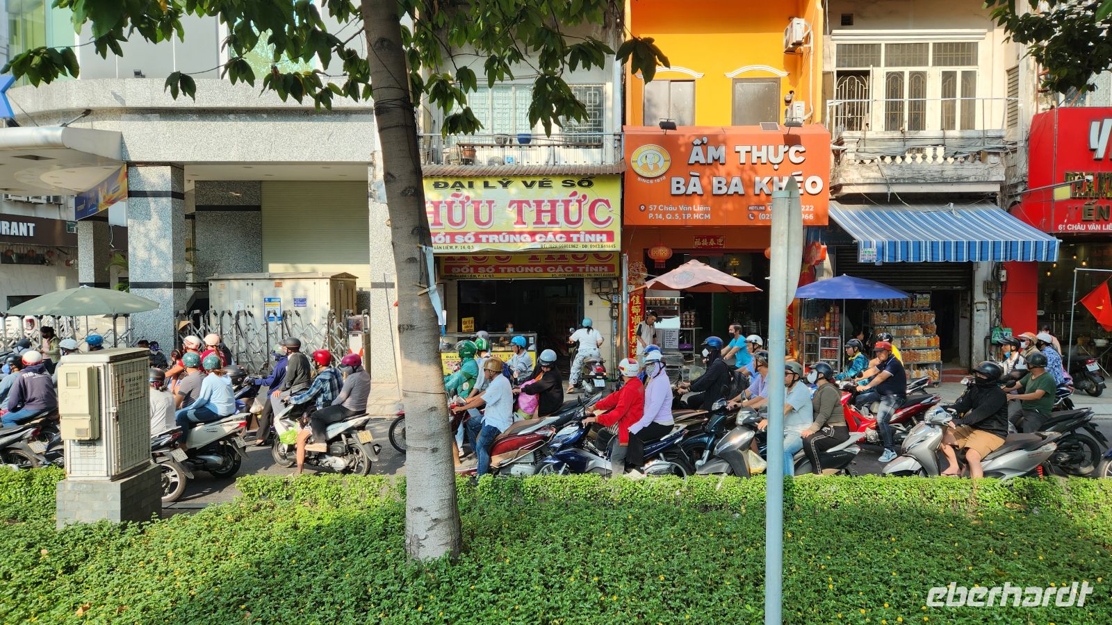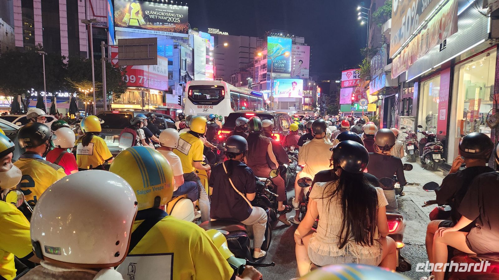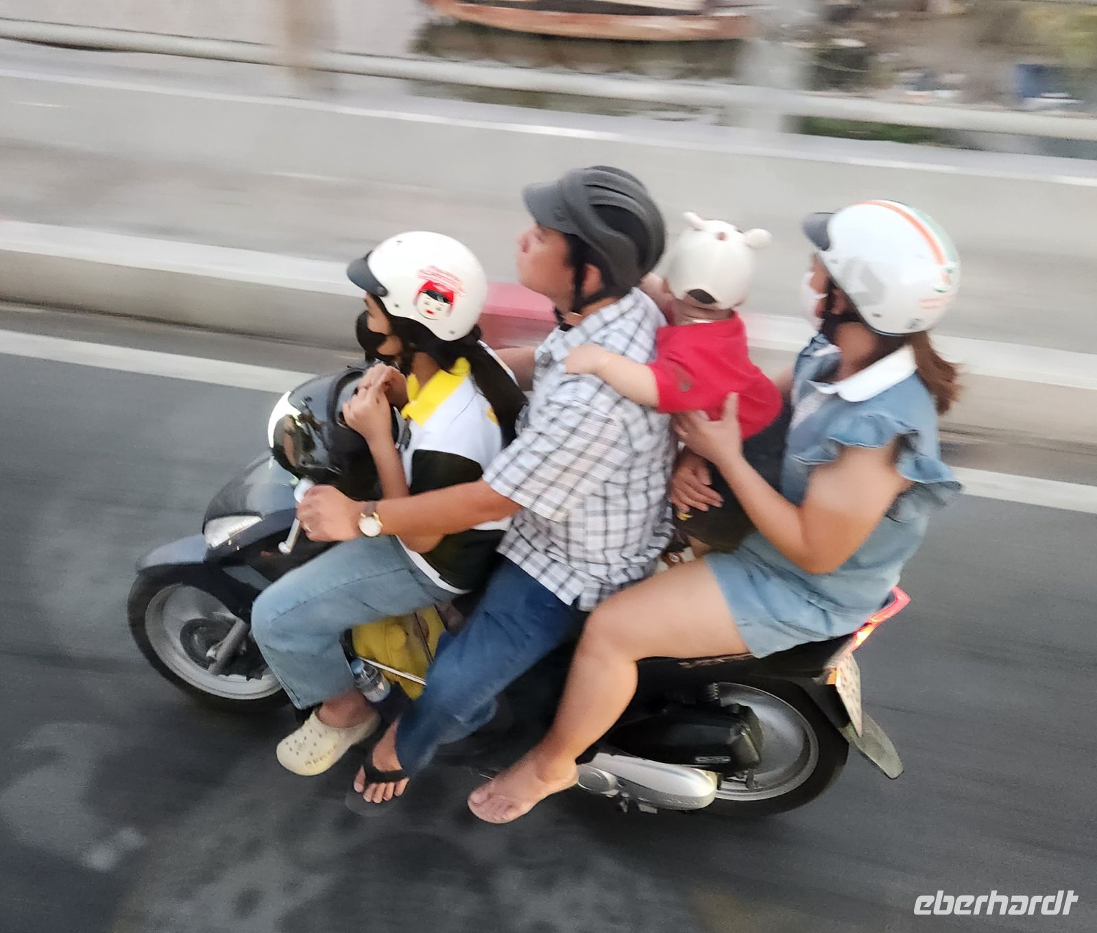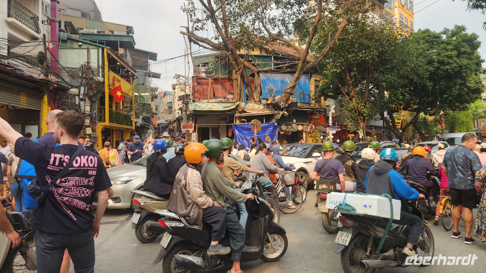 Der Spaziergang selbst ist schon ein kleines Abenteuer. Besonders das Überqueren der Straßen sorgt für Aufregung. Tausende Mopeds und auch Autos bewegen sich scheinbar chaotisch, doch tatsächlich herrscht ein eigenes System: Alle fahren langsam und gleichmäßig, und die Fußgänger gehen einfach Schritt für Schritt mitten hindurch. Anfangs kostet es Überwindung, aber schnell merken wir – es funktioniert! Jeder nimmt Rücksicht, sogar auf Mopeds, die oft erstaunlich hoch beladen sind.