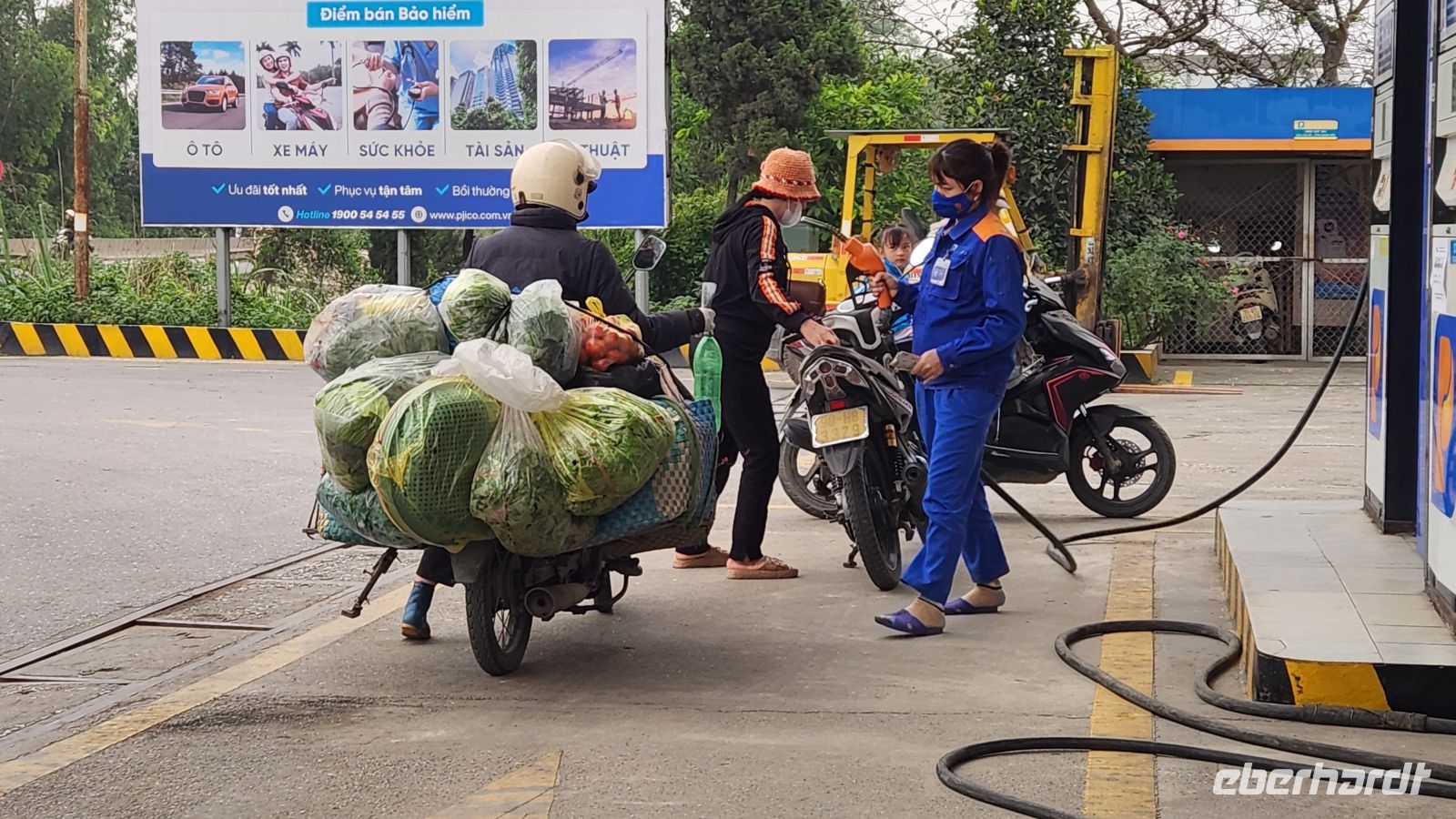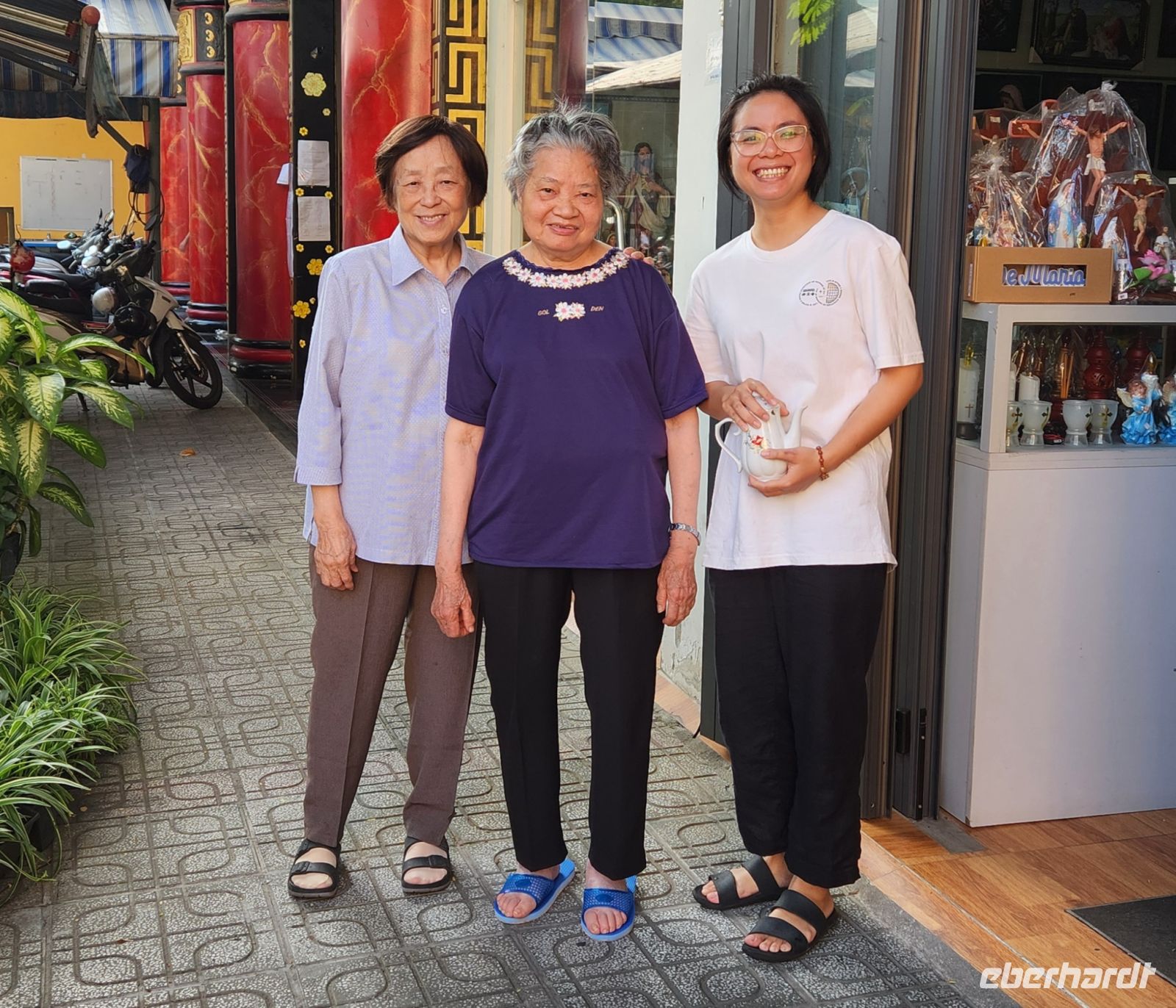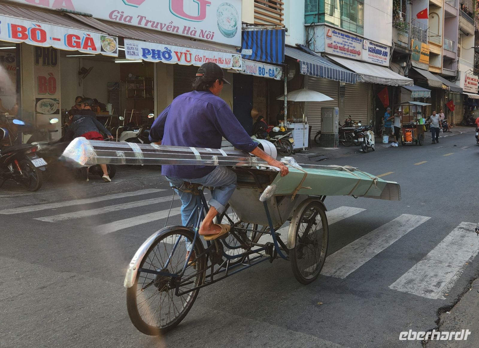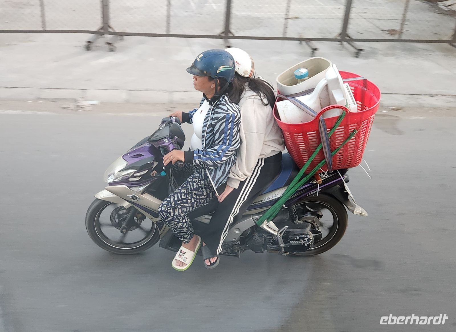 Der Spaziergang selbst ist schon ein kleines Abenteuer. Besonders das Überqueren der Straßen sorgt für Aufregung. Tausende Mopeds und auch Autos bewegen sich scheinbar chaotisch, doch tatsächlich herrscht ein eigenes System: Alle fahren langsam und gleichmäßig, und die Fußgänger gehen einfach Schritt für Schritt mitten hindurch. Anfangs kostet es Überwindung, aber schnell merken wir – es funktioniert! Jeder nimmt Rücksicht, sogar auf Mopeds, die oft erstaunlich hoch beladen sind.