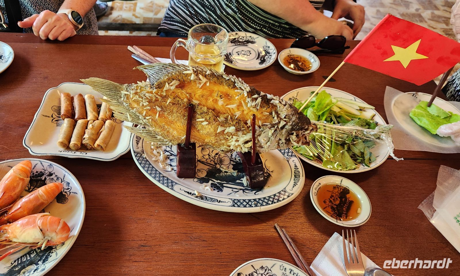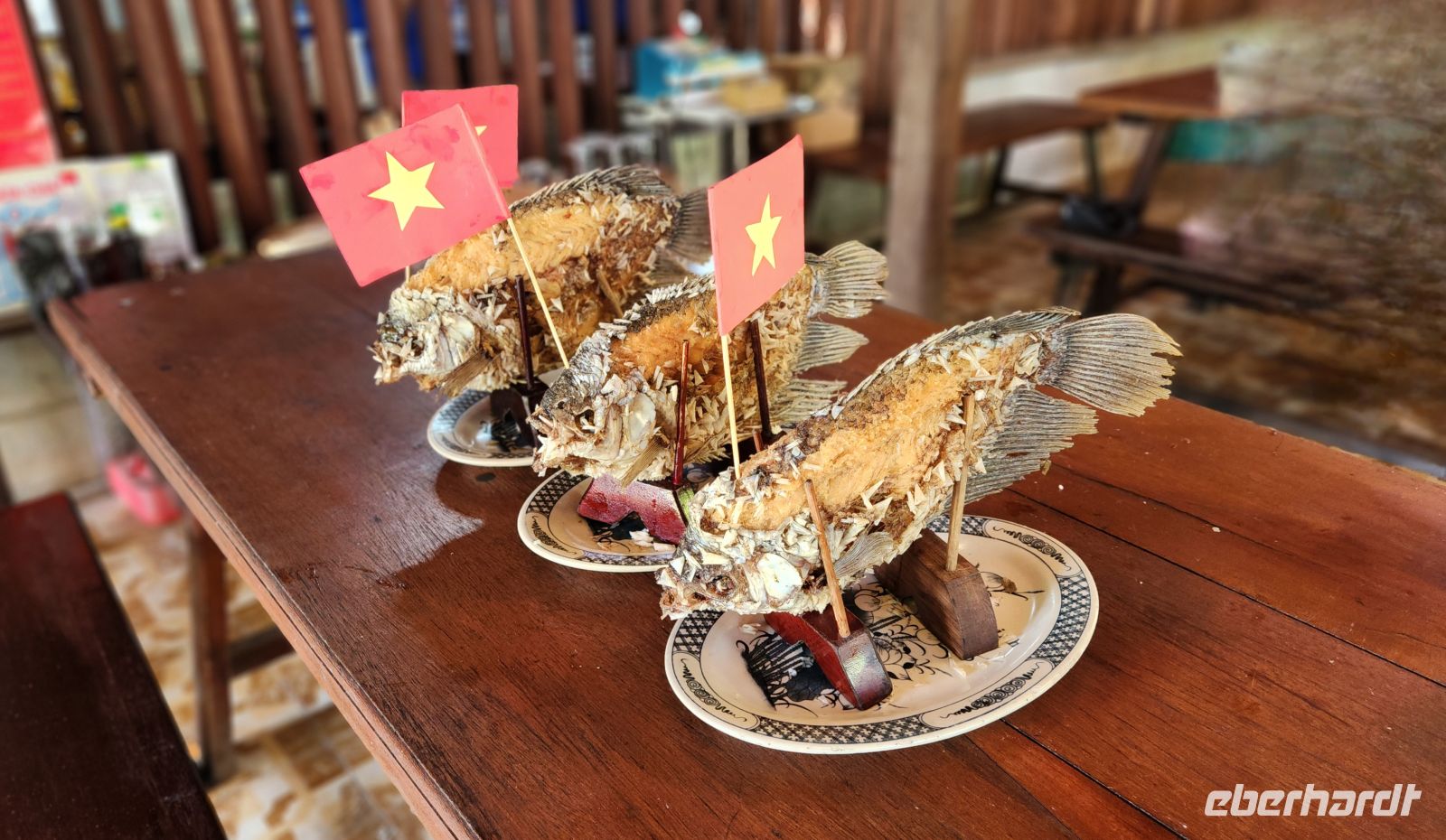 Zum Mittagessen erwartet uns eine regionale Spezialität: Elefantenohrfisch. Der Fisch wird im Ganzen frittiert, sodass er außen schön knusprig ist. Serviert wird er mit frischen Kräutern und Reispapier. Wir nehmen kleine Stücke, rollen sie zusammen mit Gemüse und Kräutern in das Reispapier ein und dippen alles in eine würzige Soße – ein ganz besonderes Geschmackserlebnis, das uns sehr gut schmeckt.