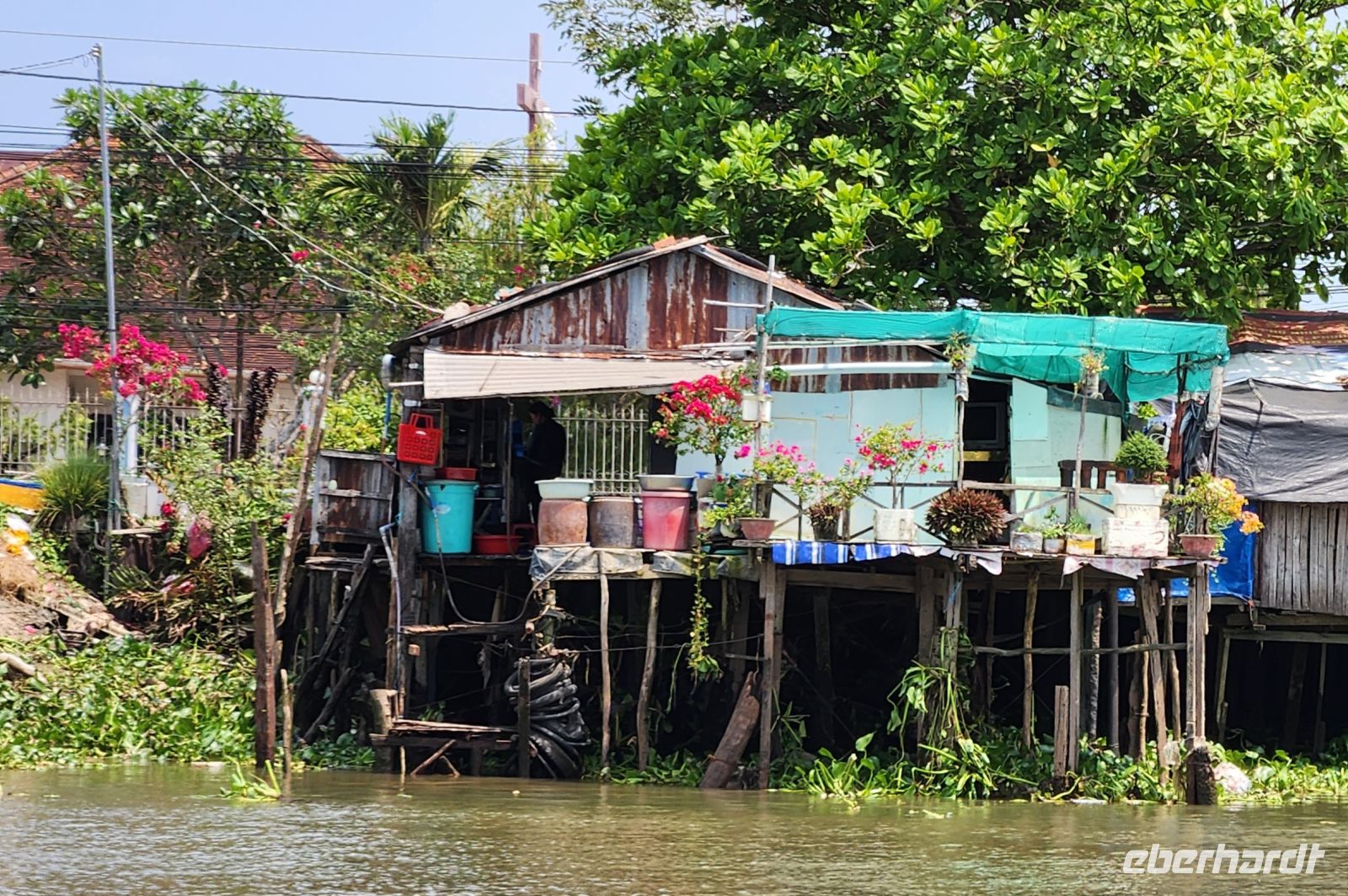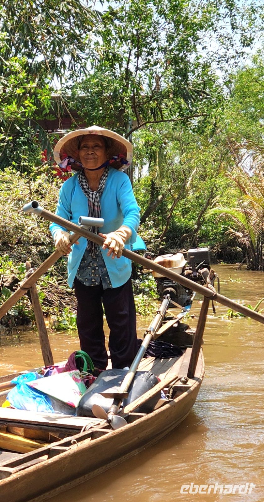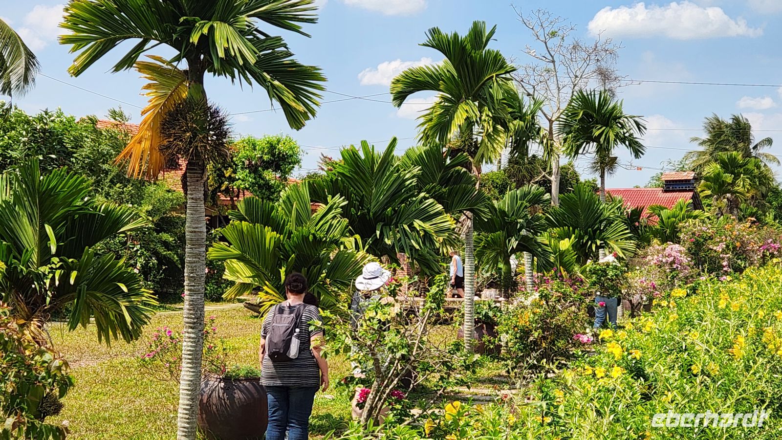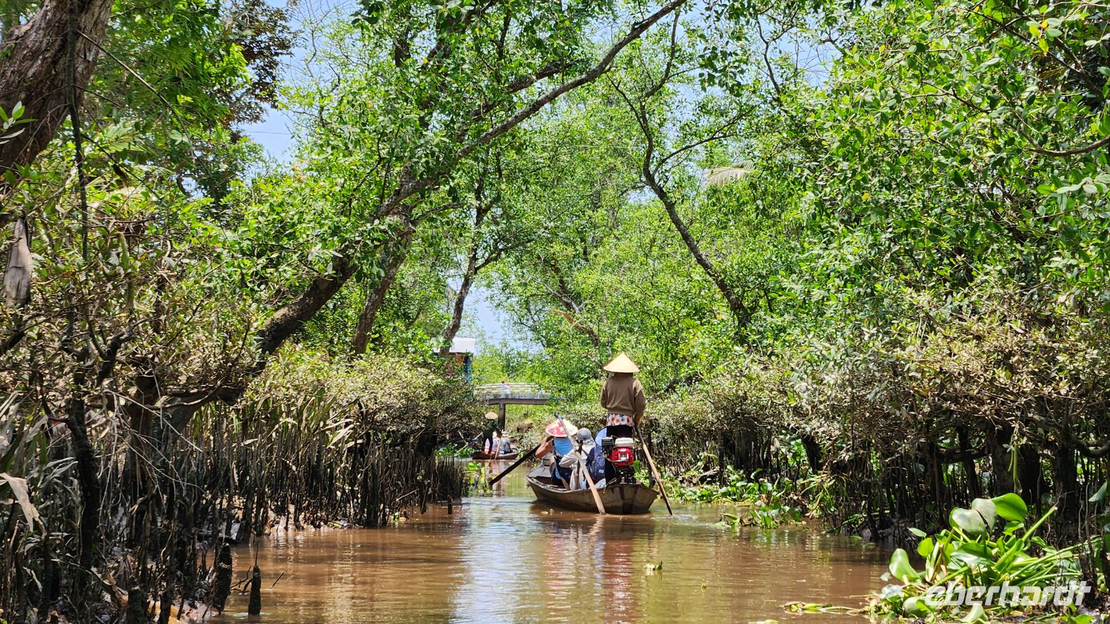 Danach steigen wir in kleine Ruderboote um und fahren gemütlich durch schmale Seitenarme des Flusses. Die Umgebung ist ruhig und grün, Palmen säumen die Wege – ein ganz friedlicher Moment.