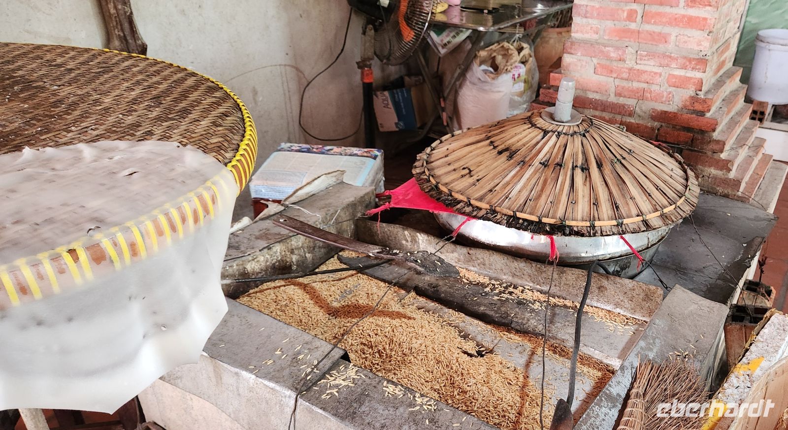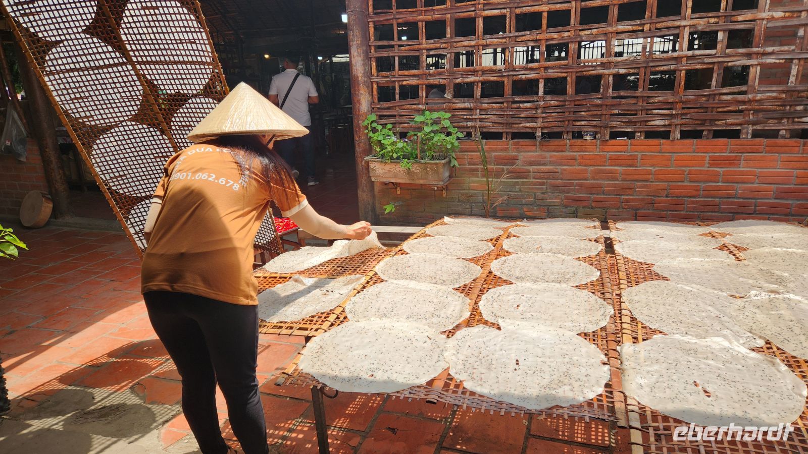 Ein weiterer Halt führt uns zu einer Kokos-Fabrik. Hier erfahren wir, wie früher traditionell Reispapier hergestellt wurde und wie aus Kokosnüssen leckere Süßigkeiten entstehen. Es ist spannend zu sehen, wie vielseitig diese Produkte genutzt werden.