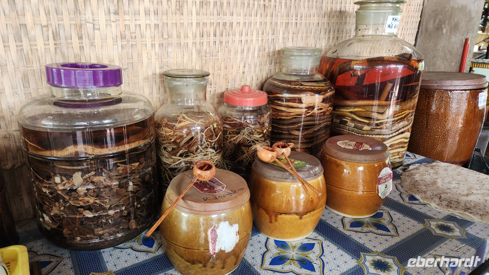 Dabei entdecken wir auch große Einmachgläser mit Schlangen darin. Uns wird erklärt, dass daraus sogenannter Schlangenwein hergestellt wird. Dieser wird in Vietnam traditionell als Heilmittel angesehen und soll angeblich die Gesundheit stärken.