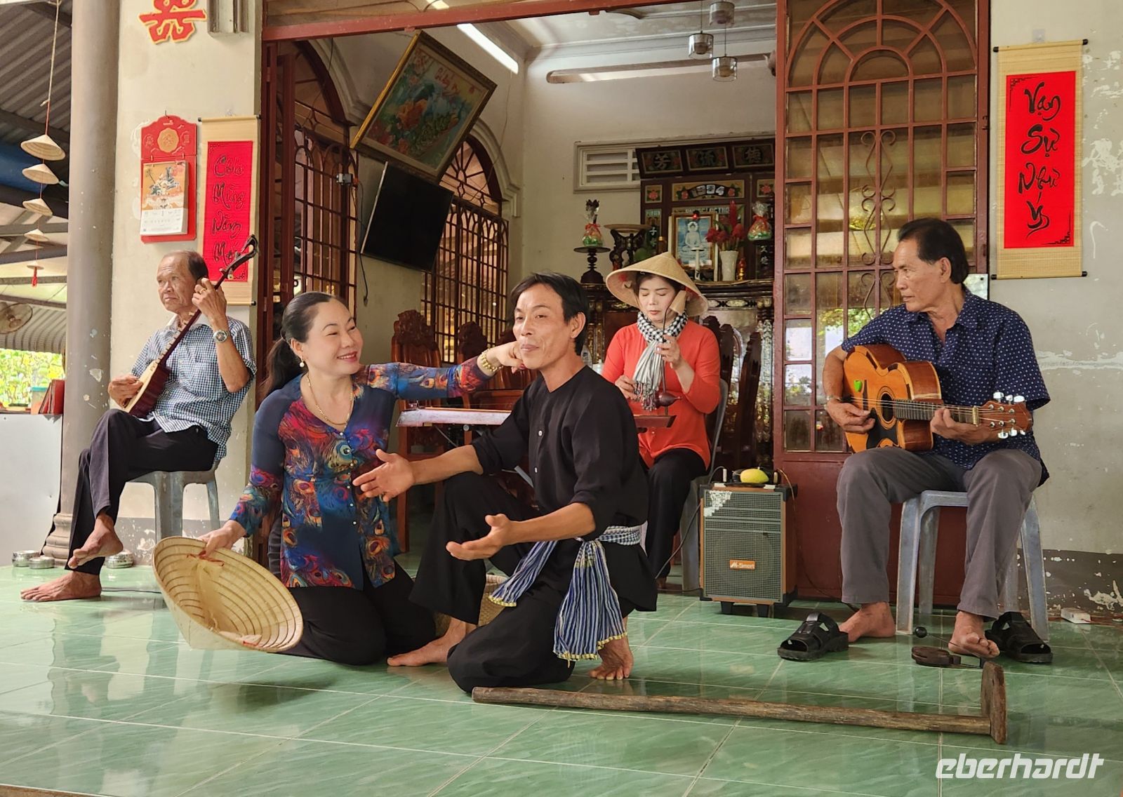 Unser erster Stopp führt uns zu einer kleinen Vorführung. Eine Musikgruppe und Tänzer zeigen uns Szenen aus dem Alltag im Mekong-Delta. Dazu werden uns frisches Obst und Tee gereicht – eine schöne und entspannte Begrüßung.