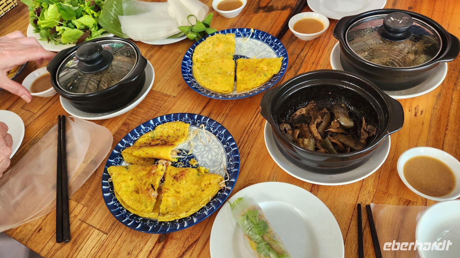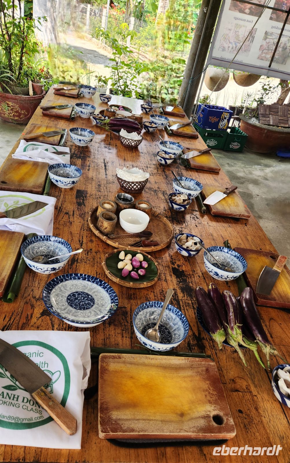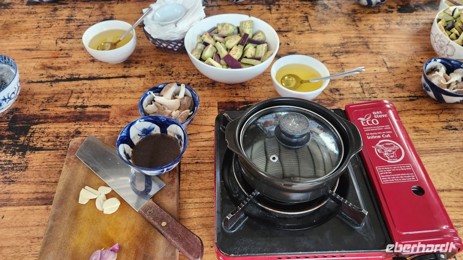 Direkt vom Bootsanleger laufen wir zu einem Restaurant, das an einen Kräuter- und Gemüsegarten grenzt. Dort erklärt man uns viel über die frischen Pflanzen, die wir gleich verwenden werden. Jeder von uns erhält eine Schürze und eine Kochmütze, und unsere Chefköchin – die Großmutter der Familie – leitet uns geduldig an. Auf dem Programm stehen Banh Xeo - vietnamesische Pancakes, sowie Gemüse mit Shrimps und Fleisch. Jeder bekommt einen kleinen Gaskocher und einen eigenen Kochtopf. Alle Zutaten werden genau erklärt, und wir dürfen selbst Hand anlegen. Alles findet in einem überdachten Außenbereich statt, umgeben von Grün und einer ruhigen, friedlichen Atmosphäre.